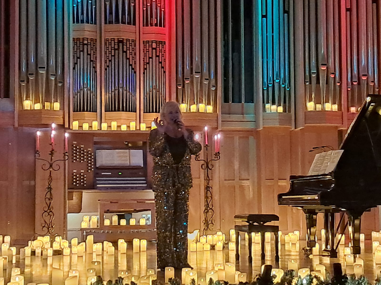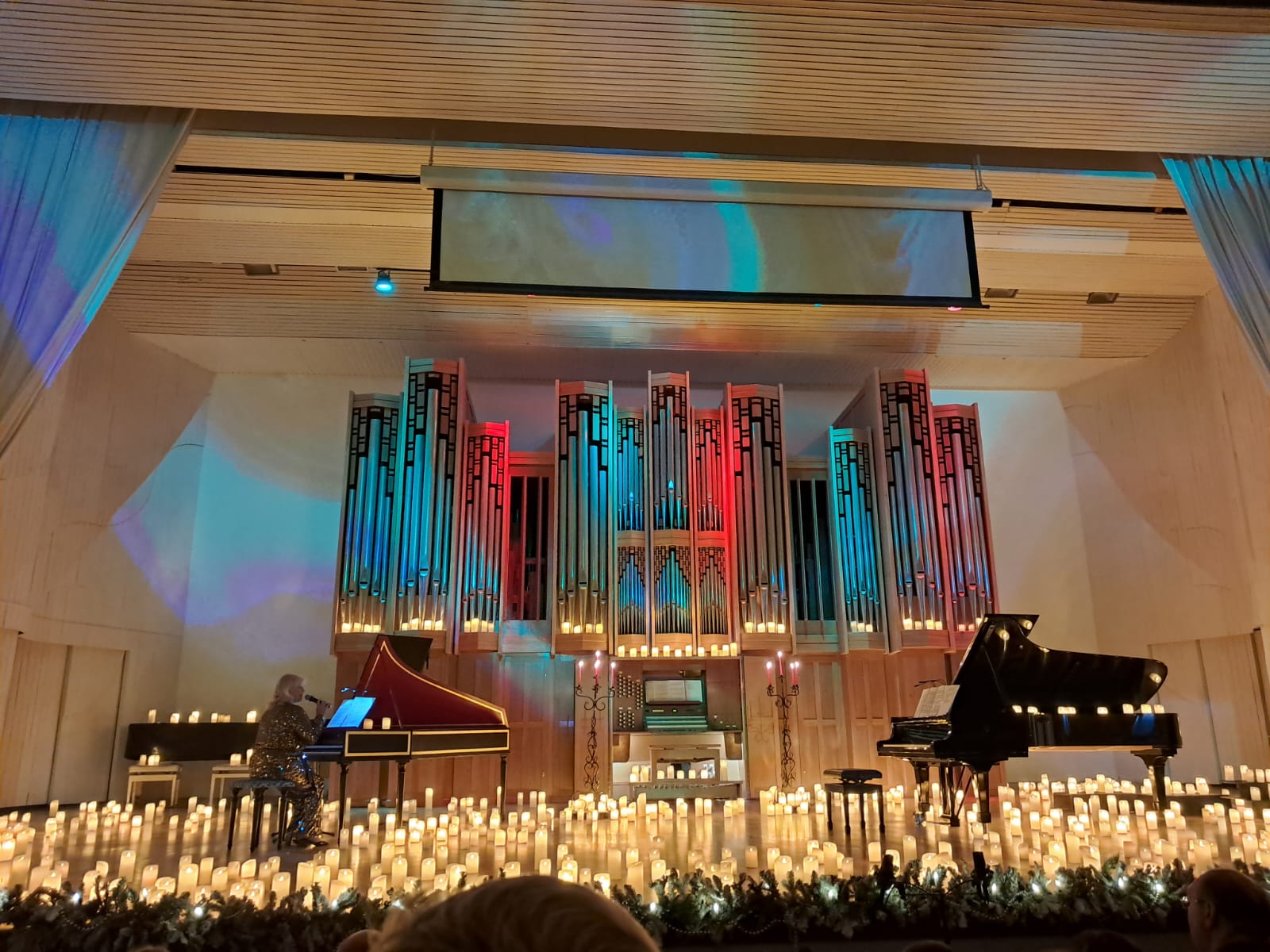И все ахнули. Тысячи свечей «полянами цветов» расцвели ярким светом везде, где можно было их поставить на сцене. Это было феерично, необыкновенно празднично и по-новогоднему волшебно! Любителей музыки ждал настоящий яркий подарок – этот хит-парад мировой классики, который был исполнен виртуозно Светланой Бережной на четырёх музыкальных инструментах — фортепиано, клавесине, органе и челесте. Согретые сиянием тысячи свечей волшебные звуки, издаваемые этими инструментами, были настоящим музыкальным эхом ушедшего времени, когда они были созданы. Время, действительно, неумолимо бежит вперёд, но сама классическая музыка живёт в безвременном промежутке. Музыка вечна! И только, благодаря таким музыкантам, как Светлана Бережная, музыка оживает вновь и вновь для нас, зрителей. Она своим мастерством создала поистине волшебную атмосферу праздника. Звучали в этот вечер Бах, Шопен, Шуберт, Григ, Дебюсси, Боэльман, Сати, Пьяцолла. И, конечно, вся «сказка» начиналась с музыки русского композитора Петра Ильича Чайковского — «Танца феи Драже», отрывка из балета «Щелкунчик». Очень гармонично артистка вплела в музыку стихи о любви, написанные когда-то поэтессами о своих чувствах. Женщина, которая играла на музыкальном инструменте и также искусно — на струнах души своих поклонников – этим всем была несравненная Светлана Бережная. Полуторачасовой вечер завершился, тишина, а затем зал взорвался громом аплодисментов. Восторженные зрители не отпускали со сцены Светлану Бережную. Тогда она сказала зрителям: