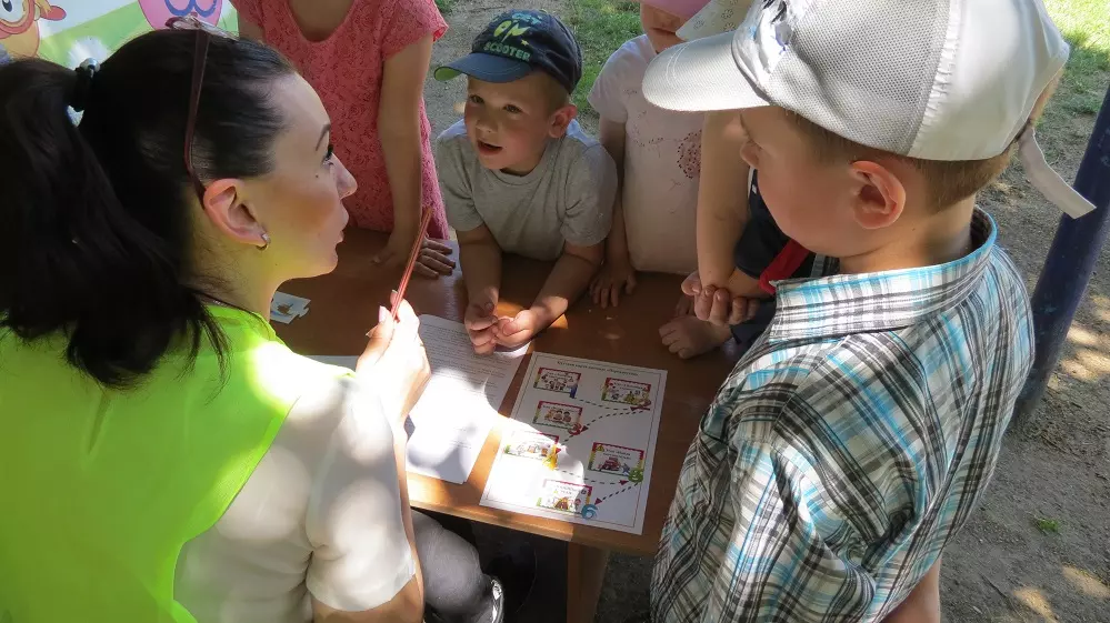 В проведении мероприятия приняли участие 4 детских сада: 1, 23, 18 и 14. Были разработаны различные станции на знания правил дорожного движения. Детки складывали паззлы, рассказывали про виды транспорта, разъясняли обязанности пешеходов. Детские эмоции зашкаливали, зрители ликовали и переживали. Иногда детям мешал сказочный персонаж Шапокляк, которая мешала паззлы, путала детей в ответах и всячески приносила вред, однако дети раскусили ее коварные планы и отвечали правильно и достойно.