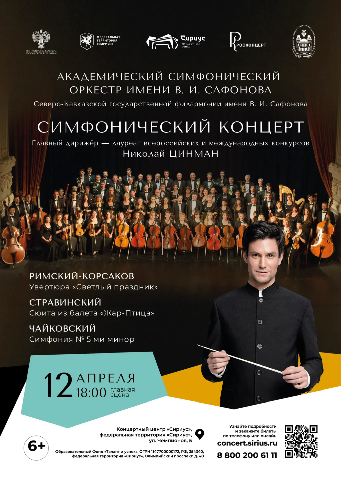 12 апреля 2026 года Академический симфонический оркестр им. В.И.Сафонова под управлением главного дирижера, лауреата всероссийских и международных конкурсов Николая Цинмана выступит на Главной сцене Концертного центра «Сириус». Это одно из самых современных концертных пространств не только в России, но и в мире. Мероприятие состоится при поддержке Министерства Культуры Российской Федерации и ФГБУК РОСКОНЦЕРТ.