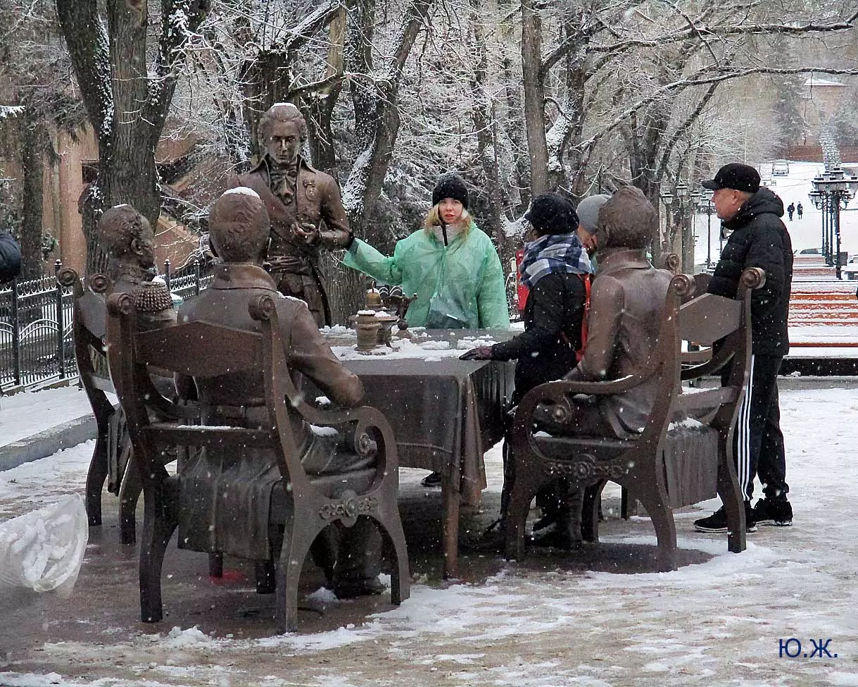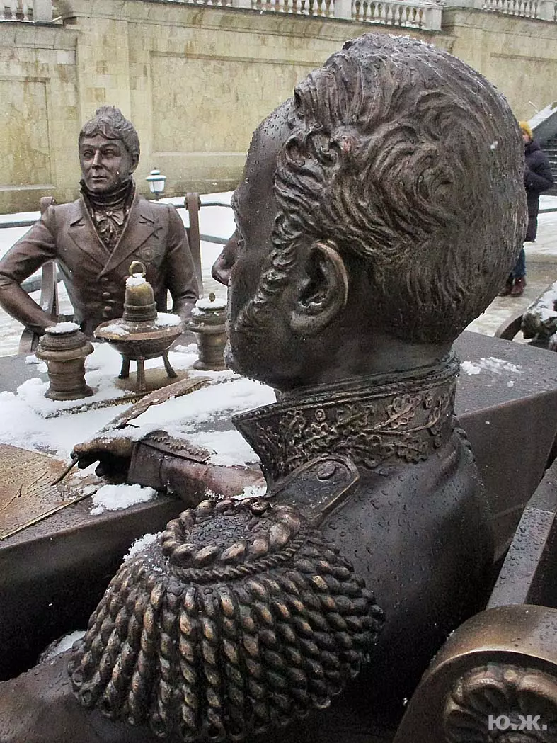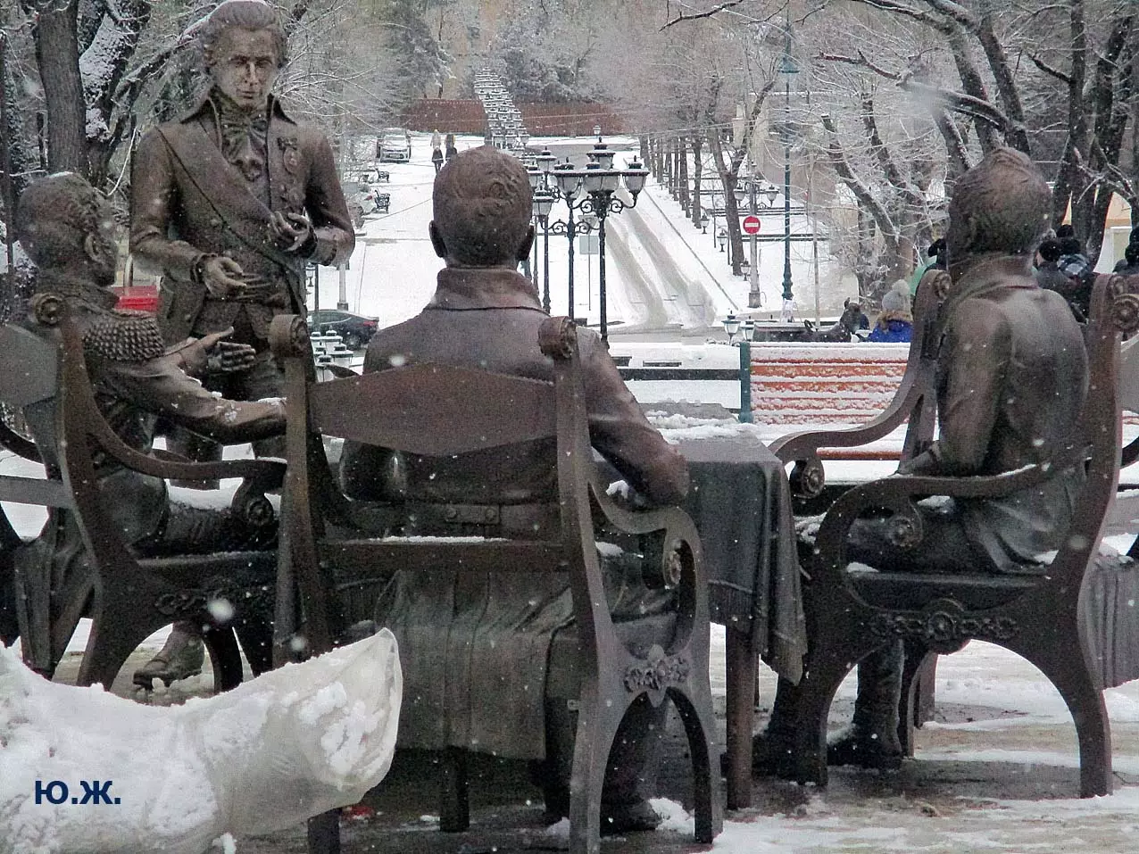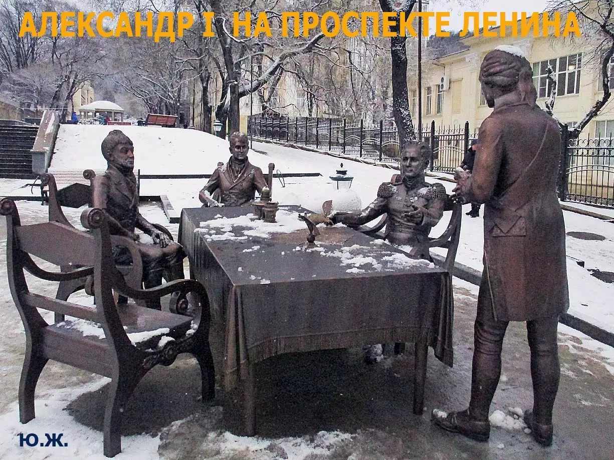 В воскресенье, 3 января, в хороший снежок, провел фотосессию на проспекте Ленина. Первыми, кого увидел, были бронзовый Император России Александр I со своей свитой, за громадным столом подписывающий бронзовым пером свой знаменитый рескрипт.