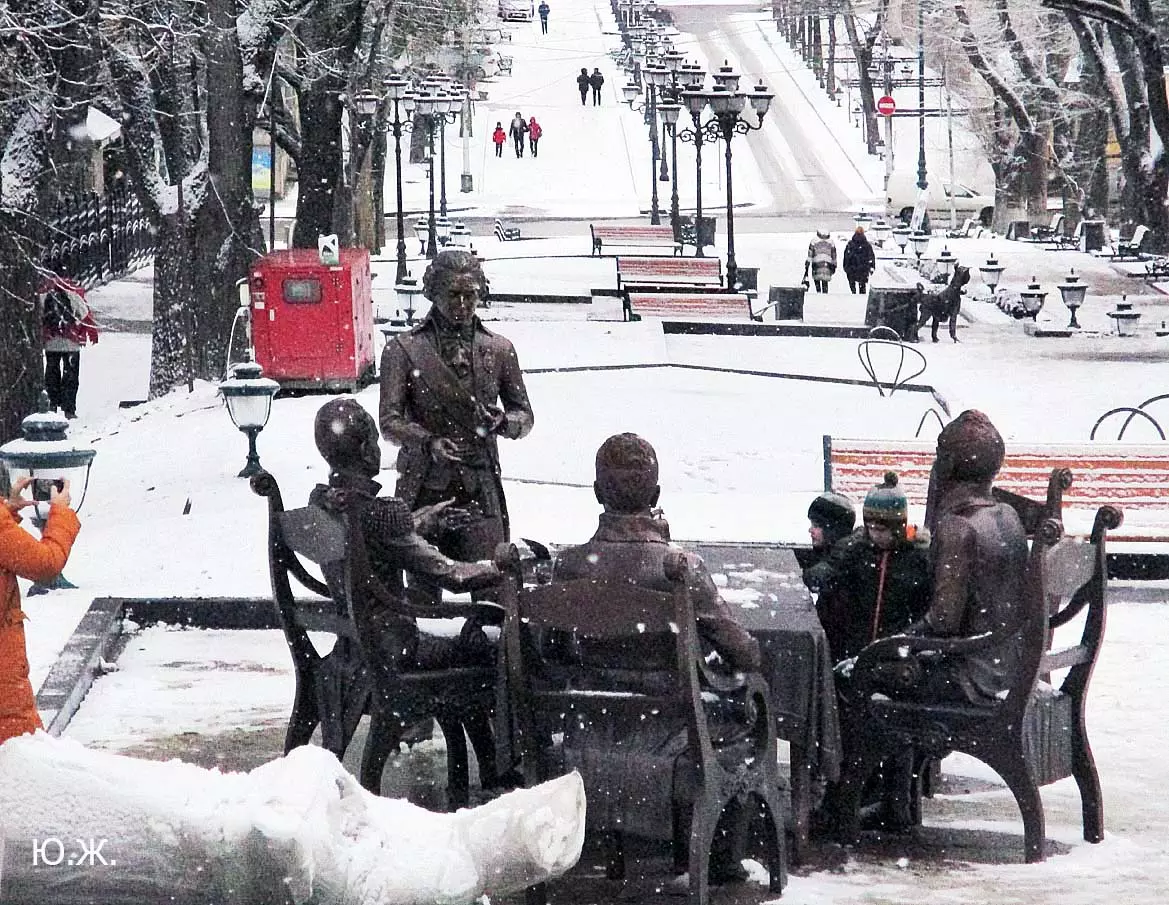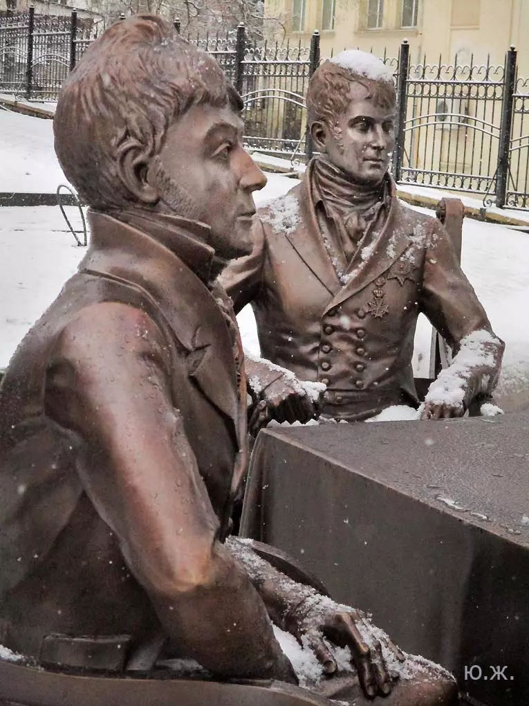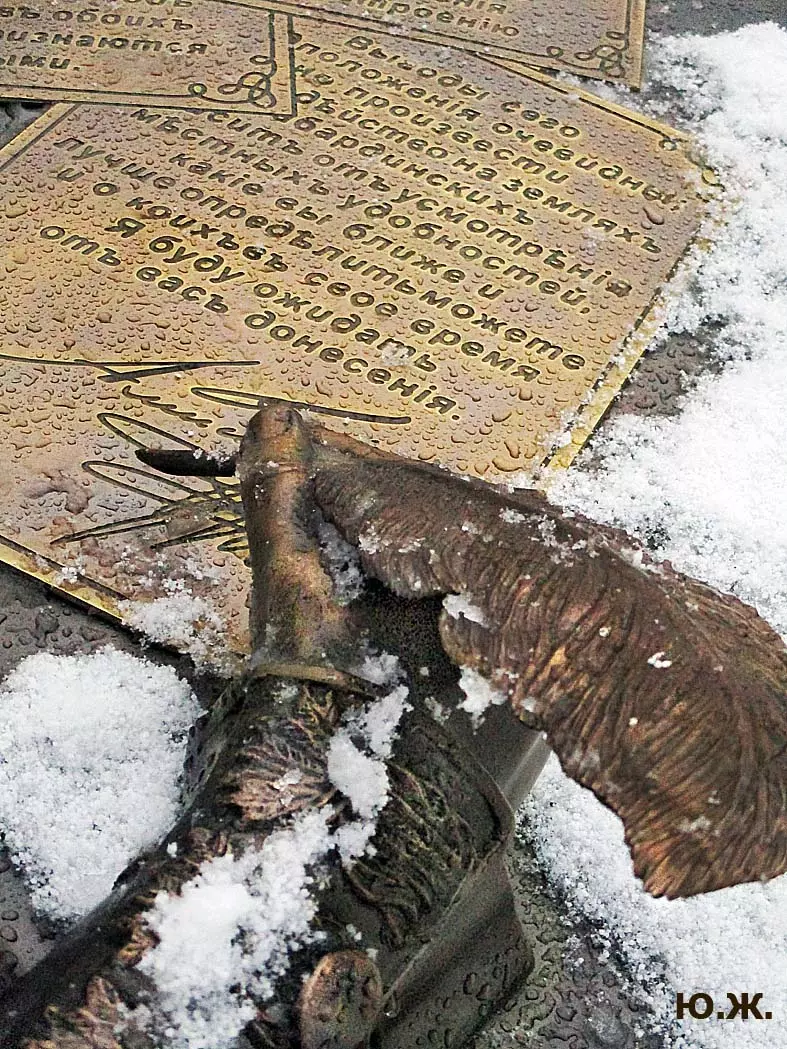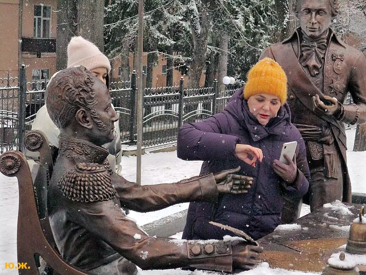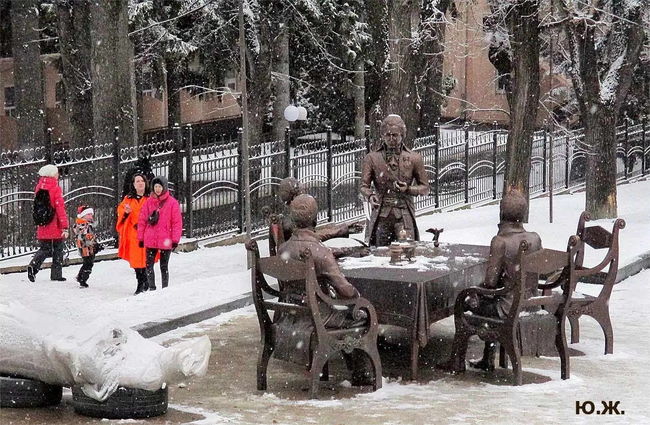 В воскресенье, 3 января, в хороший снежок, провел фотосессию на проспекте Ленина. Первыми, кого увидел, были бронзовый Император России Александр I со своей свитой, за громадным столом подписывающий бронзовым пером свой знаменитый рескрипт.