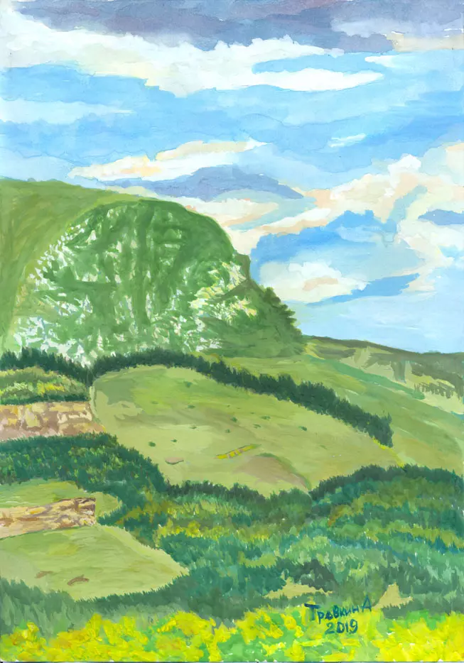 Гора находится на отроге Боргустанского хребта, выше автовокзала. Гуашь.