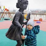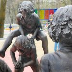 У места, где всегда остается небольшая впадина с водой, рыбаки умудряются ловить рыбу, на них смотрит импозантный бронзовый рыбак с роскошным котом. С другой стороны озера — стройная, тоже бронзовая, купальщица дает уроки плавания подошедшей к ним паре (живой), ее друг фотографирует их. Недалеко на громадном камне на песке лежит и загорает парень, естественно, бронзовый, прикрываясь шляпой от солнца, и смотрит на памятник-самолет. Интересная группа детей и подростков, смешанных с живыми, прыгают друг через друга, так что непонятно, кто есть кто…