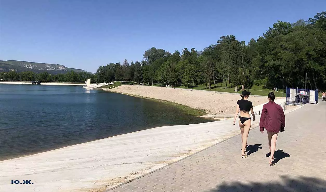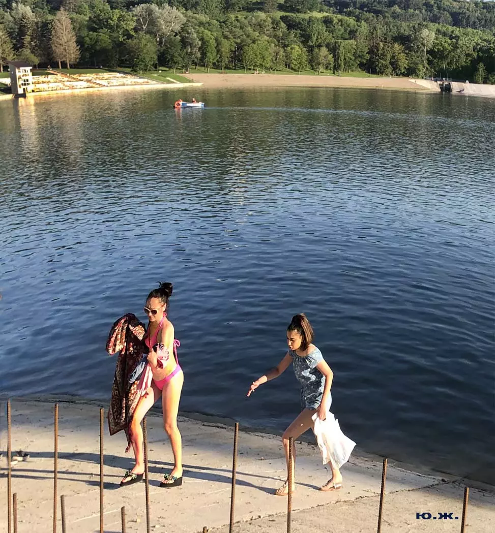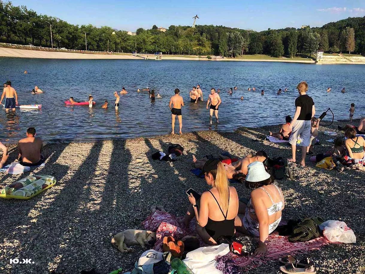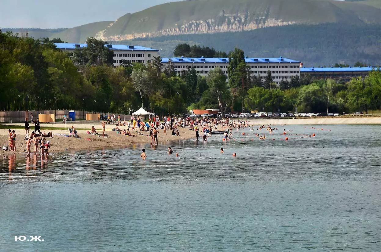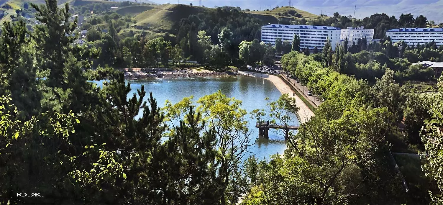 С восточной стороны, кстати, самой обустроенной, находится давно построенное красивое светлое здание охраны, чуть выше уже разбит живописный сквер, а еще раньше построены большие в виде ступеней места, сейчас использующиеся людьми для принятия солнечных ванн. Они так же начинают заполняться, хотя купание с этой стороны по-прежнему запрещено, и многие используют вымощенные плиткой довольно длинные дорожки для прогулок, иногда и вокруг озера. А само оно прекрасно. Лучшие виды на это красивейшее, хоть и небольшое озеро, открываются с окрестных гор.