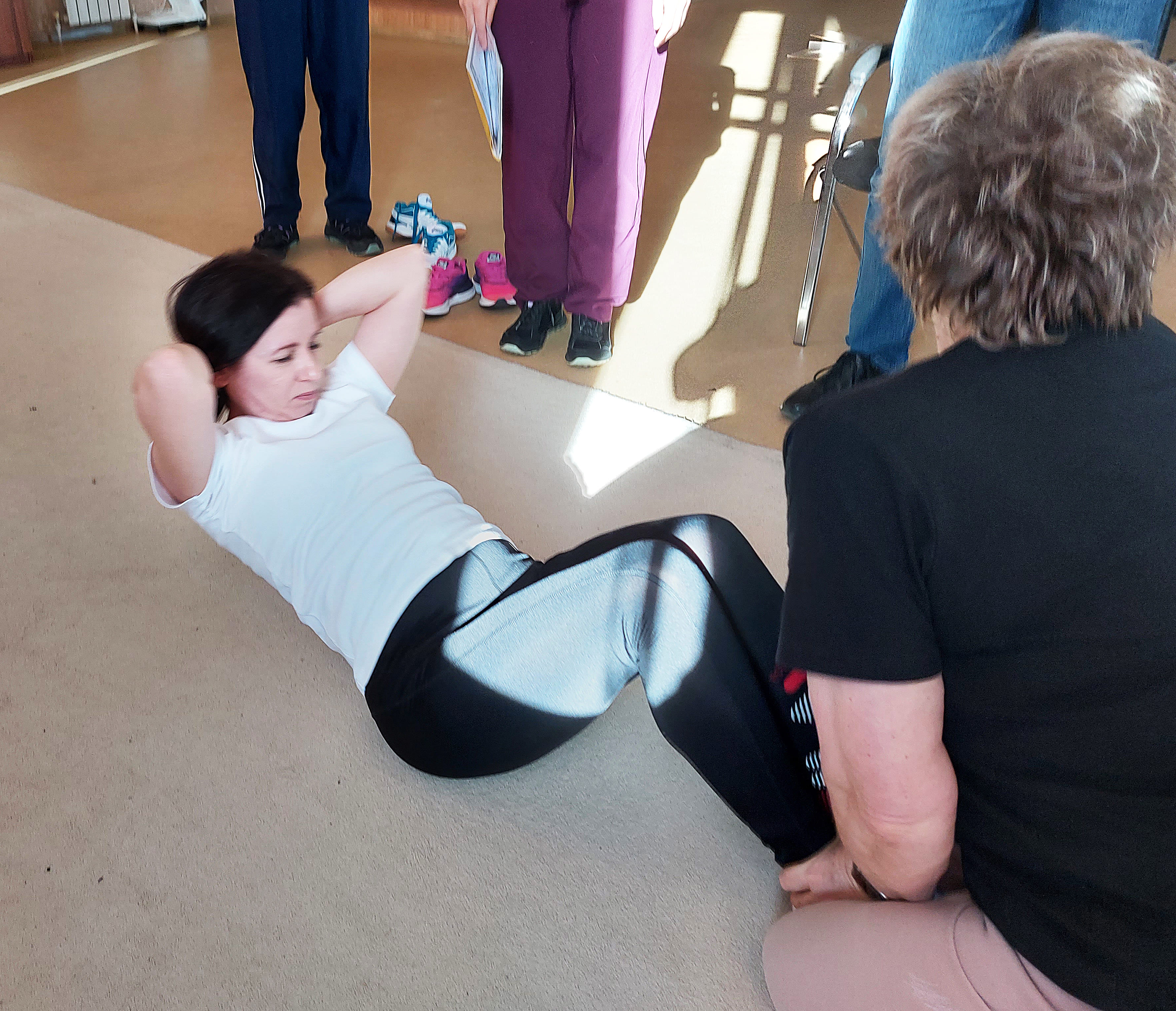 Учителя гимназии № 19, переходя от одного вида тестов к другому, дружно болели за коллег. Под их сочувственные возгласы учитель математики Наталья Николаевна Сажина успешно выполнила норматив для своей возрастной группы в таком непростом упражнении, как подъём туловища из положения лёжа.