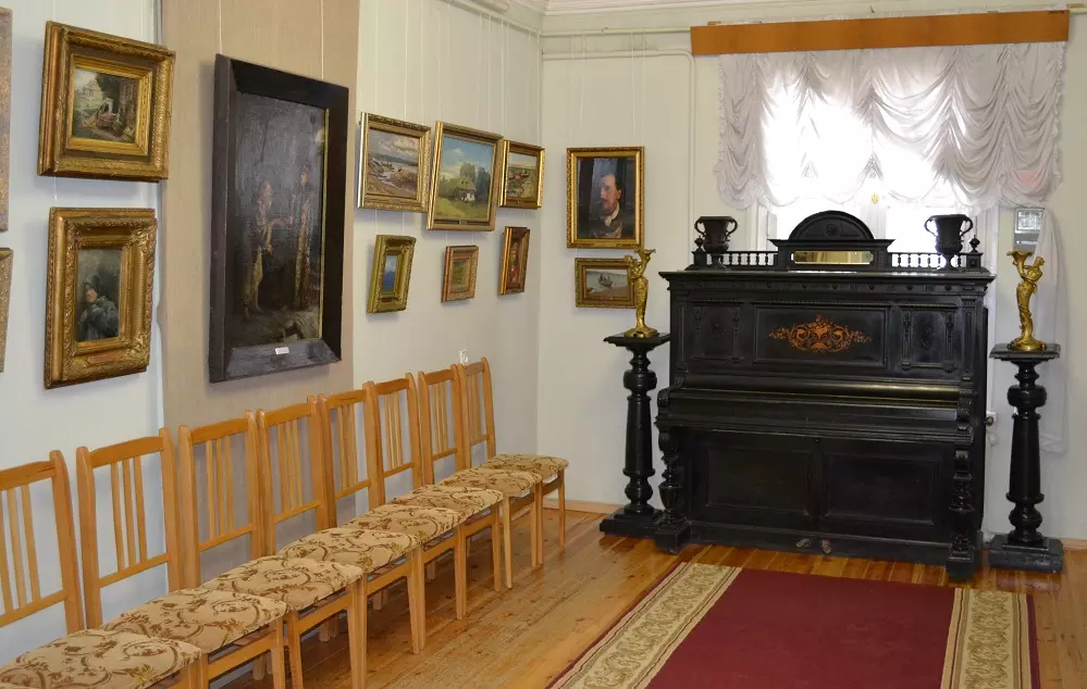 В самом начале экспозиции посетители видят большое полотно Льва Феликсовича Лагорио. Он был первым учеником Айвазовскрго и впоследствии стал одним из самых известных художников-маринистов. Картина названа «На Понтийских болотах». Умиротворяют сине-зеленые цвета воды, оттеняя темно-коричневые деревья и водоросли. В период прохождения службы в Петербурге Ислам Крымшамхалов – поэт, художник, просветитель — подружился с Н.А.Ярошенко. Когда Николай Александрович переселился в Кисловодск, он стал одним из знаменитых гостей на Белой Вилле, и в свой единственный приезд в наш город он написал картину «Кисловодск».