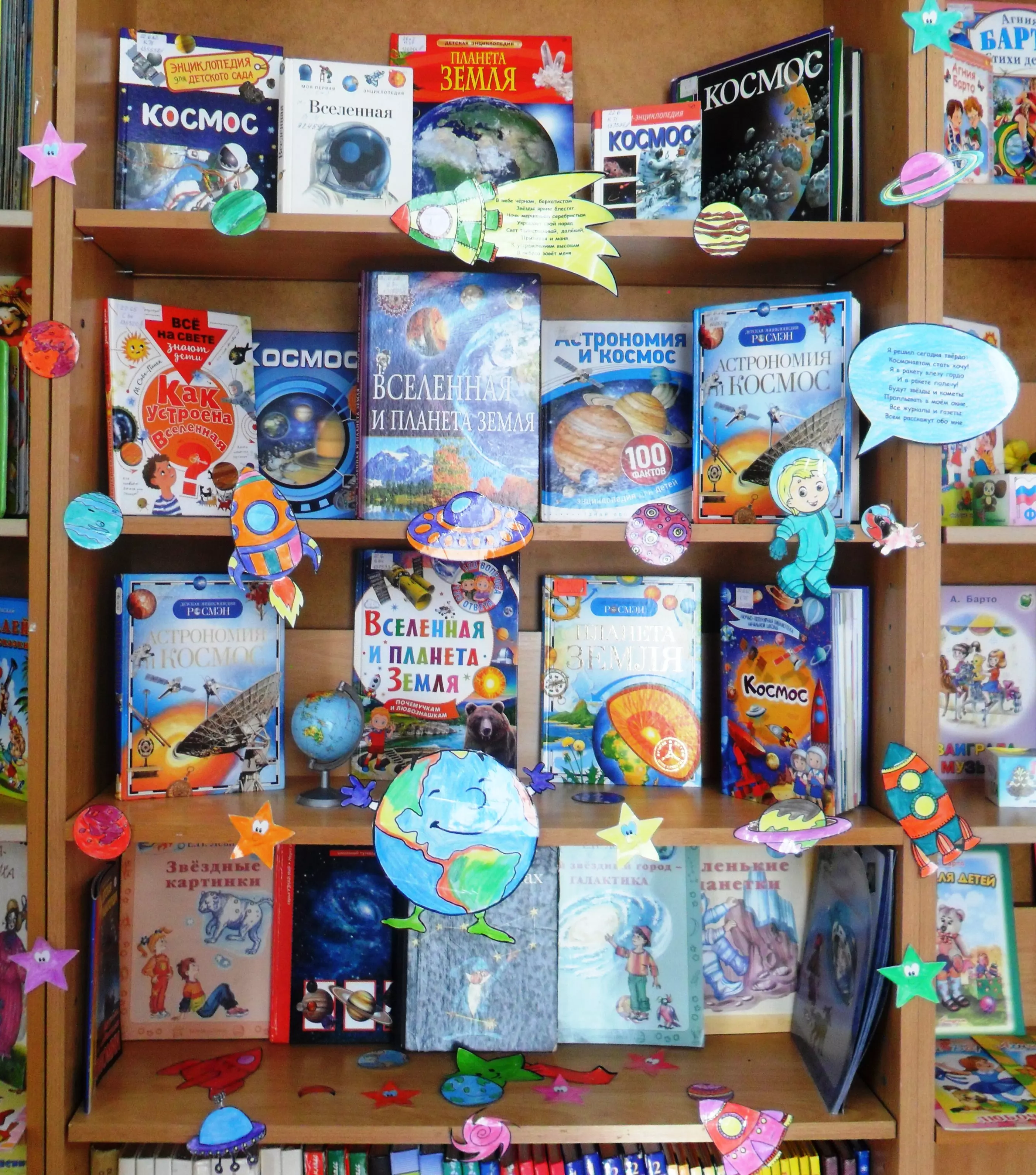 Созданию космической атмосферы библиотеки способствовало оригинальное оформление: была организована фотозона «Космические путешественники», в которой все желающие могли сфотографироваться. Украсили «Библиосумерки» выставки «Звездные дороги Космоса» и «Путешествие к звездам» с книгами о космонавтах и космических кораблях, картами звездного неба, энциклопедиями по астрономии для самых маленьких.