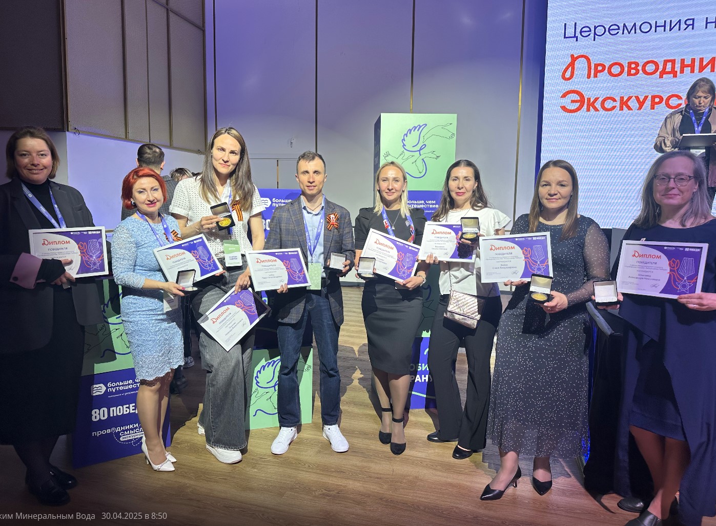 Экскурсоводы из Ставропольского края успешно представили наш регион на Международном конкурсе «Проводники смыслов. Экскурсоводы Победы», вернувшись домой с высокими наградами. В состав делегации вошли специалисты сферы туризма: Бойко Олеся, Бойко Павел, Василенко Татьяна, Ельцова Алёна, Кузнецова Мария и Осипова Надежда. Члены нашей команды вернулись в родной Кисловодск в статусе победителей и с заветными медалями.