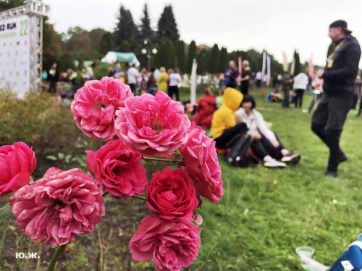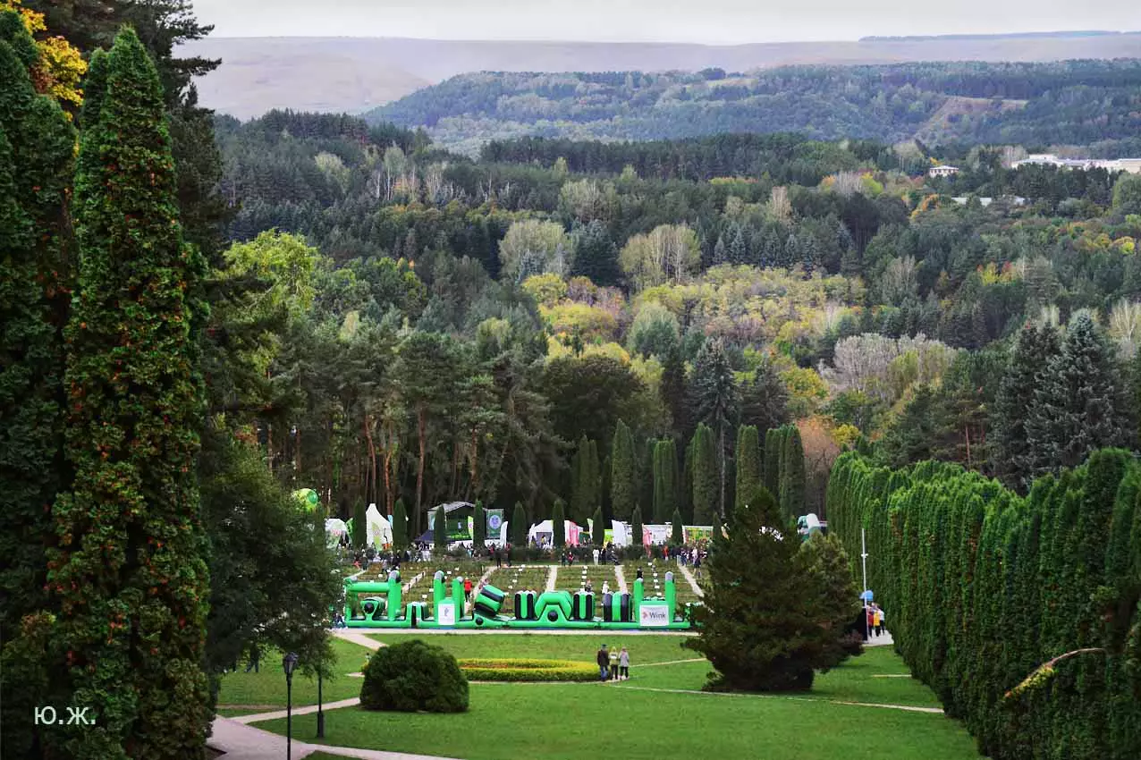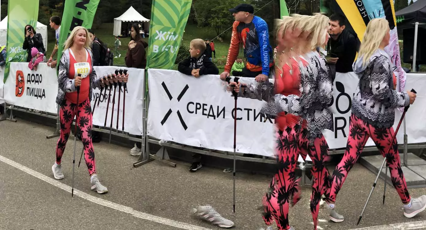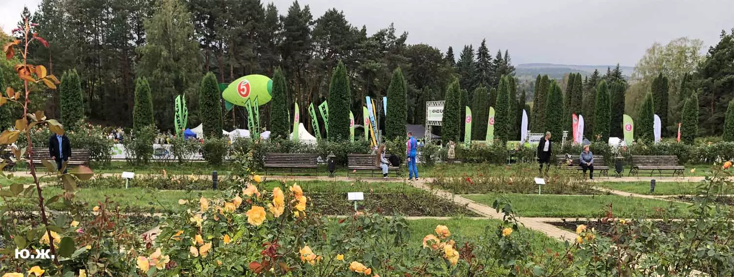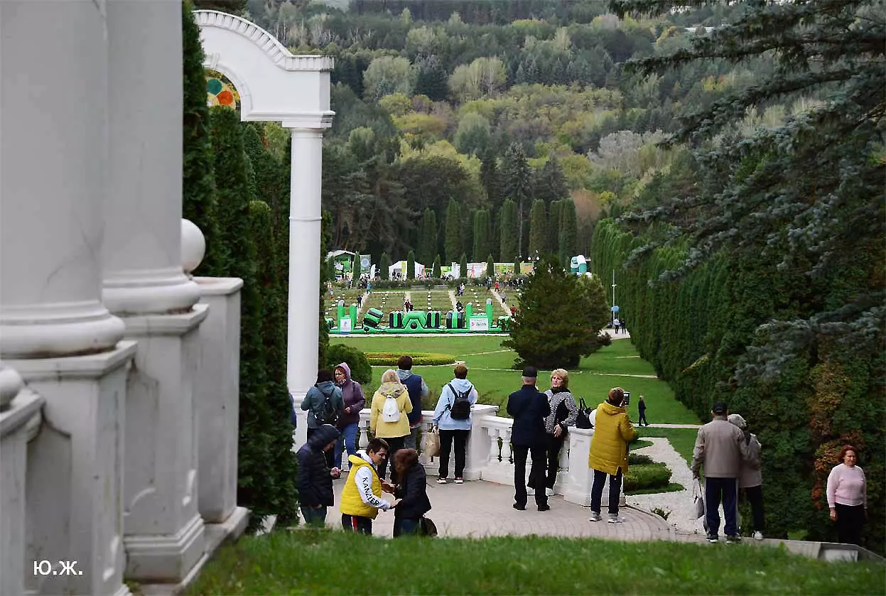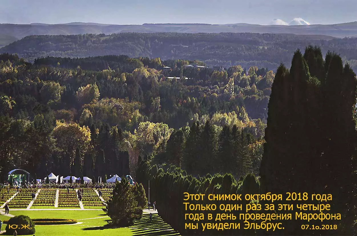 Всегда начинаю осмотр живописного палаточного городка сверху, с обзорной белоснежной беседки. Отсюда открывается прекрасный вид на царицу парка — красавицу Долину роз, откуда и стартуют марафонцы. Иногда на восток, иногда на запад. Рассматриваю и снимаю палатки, яркие рекламные шары, бутики, маленькие кафешки, ярко одетых участников марафона, многочисленных зрителей… Смотрю в сторону Эльбруса, который, к сожалению, в дни соревнований (вторые выходные октября) показывается реже. За все годы марафона был только один из четырех дней соревнований, когда он нас порадовал — в 2018 году. Я этот снимок сегодня прикрепляю к новым фото.