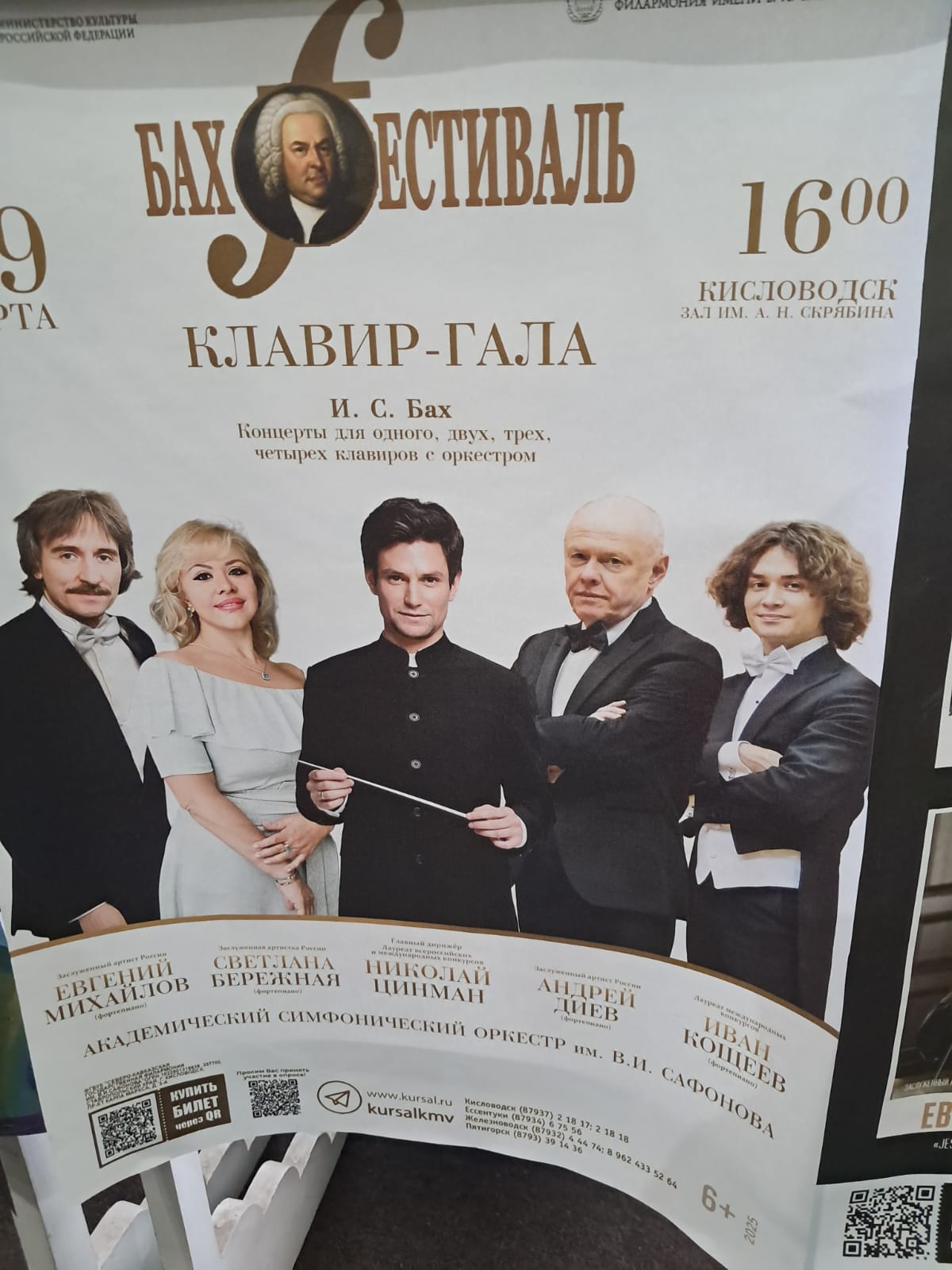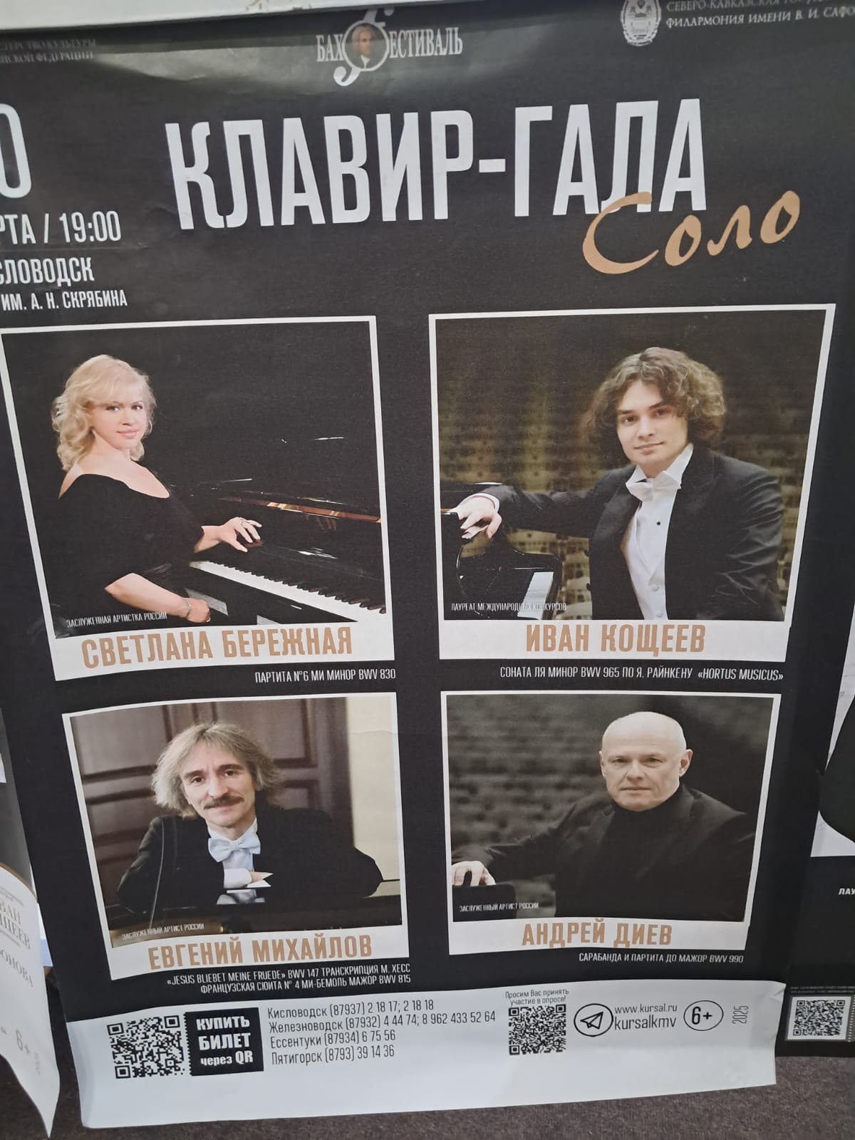 Итак, в Государственной Северо-Кавказской филармонии им. В.И. Сафонова в зале им. Скрябина состоялся большой концерт «Клавир-Гала» Академического симфонического оркестра им. В.И. Сафонова под управлением главного дирижёра оркестра Николая Цинмана и ведущих музыкантов России по классу фортепиано. Ими были Заслуженные артисты России Светлана Бережная, Андрей Диев, Евгений Михайлов и лауреат международных конкурсов Иван Кощеев. Два выходных дня были посвящены одной из любимой тем великого Маэстро – органиста: его музыке, написанной для струнного симфонического оркестра с участием одного клавира, для двух, трёх и даже для четырёх клавиров. И звучала также музыка, написанная только для одного клавира (фортепиано). Эти шедевры созданы композитором вопреки своему времени, т. к. клавир, как музыкальный инструмент, только был изобретён, поэтому Бах с упоением «бросился» писать музыку для него, чтобы услышать воочию его звучание во всех его новых комбинациях и сполна насладиться этим. Многие слушатели в зале были впервые на таких концертах: всё же Бах — это целая вселенная, и жизни не хватит, чтобы послушать все, написанные им музыкальные произведения (их около 1000).