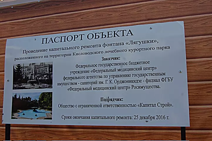 — Начат капитальный ремонт, работы ведутся в соответствии с проектом, так что все будет красиво и в срок, — заверил нас замдиректора Владимир Черевашенко. — Что касается материала, из которого сделаны скульптуры лягушек, то три из них действительно бронзовые, и они займут свое место. А одна была, очевидно, утеряна в 70-х годах, но она будет восстановлена, и именно в бронзе, заказчиком ремонтных работ — санаторием Орджоникидзе. Кроме того, при сохранении исторического облика фонтана будет изменена техническая оснащенность: установлены мощные насосы. Проект прошел государственную экспертизу, сметы тоже государственные, проводится авторский надзор, технический надзор, так что в этом плане соблюдены все гарантии, чтобы было красиво. Данные о реконструкции и подрядчике указаны на паспорте объекта.