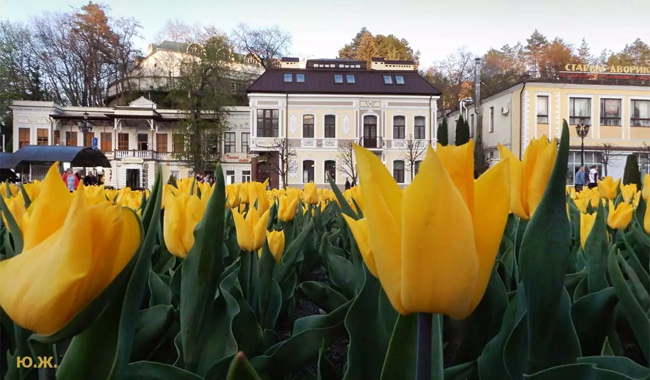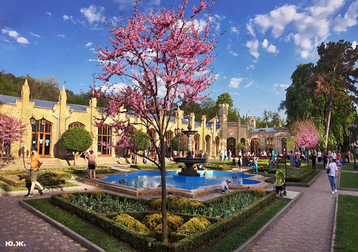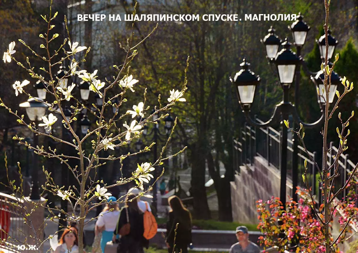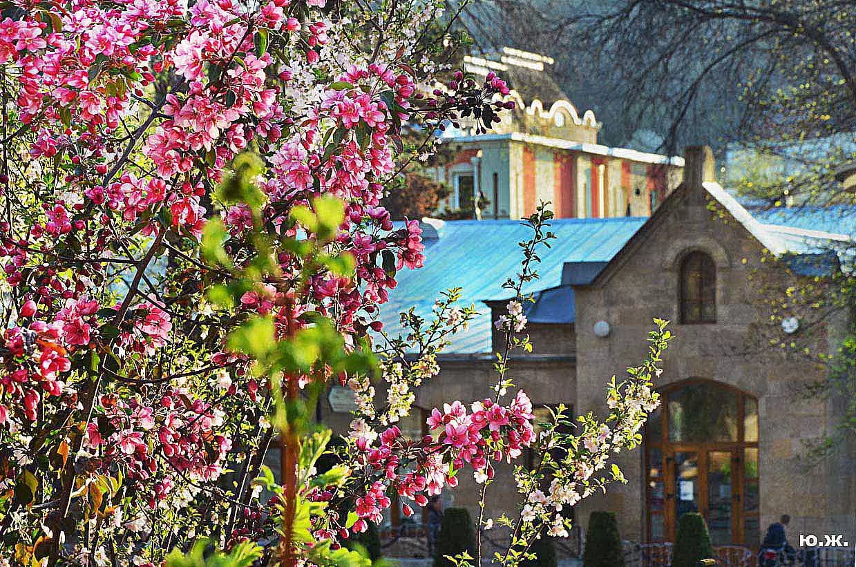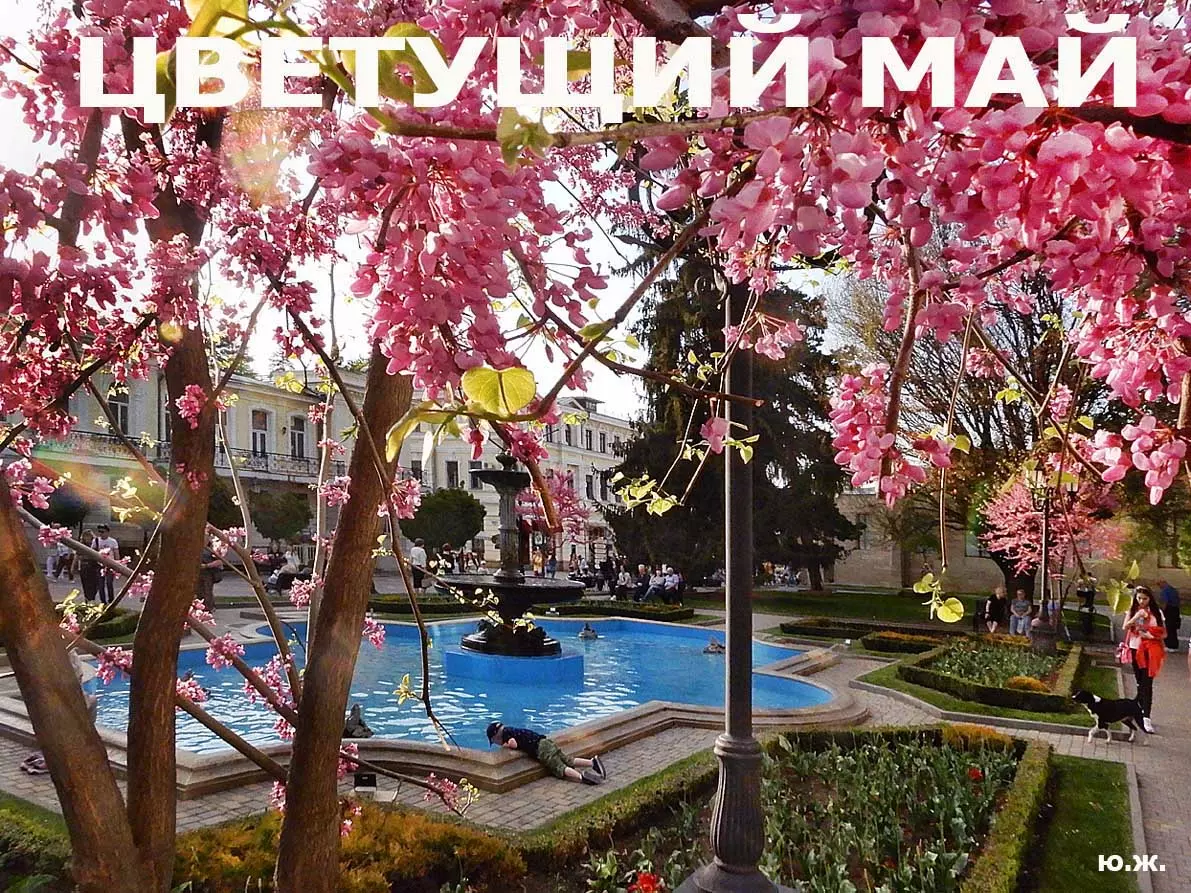 Одни деревья сменяют другие, первое — это время «белой кипени», когда создается такое впечатление, что везде вокруг цветут фруктовые деревья и все белое и нежно-розовое. В конце апреля — начале мая мы любовались впечатляющим цветением крохотного оазиса магнолий, что на Шаляпинском спуске — их крупными белыми, похожими на звезды, цветами. Кстати, в мае выбросило свой единственный очень крупный розовый цветок совсем небольшое деревце магнолии (см. фото). А потом, словно всплеск: зацвели каштаны, сирень, скоро будет акация, каким-то насыщенным ароматом заявила о себе, совсем недавно нежно-голубая глициния — у соседа с первого этажа. А роскошь штучных авторских клумб Курортного бульвара, которые будут всех радовать до глубокой осени и которые нужно воспевать только в стихах! А какими прекрасными ярко-розовыми цветами радуют курортников с их кружками, наполненными богатырским нарзаном, деревья вокруг фонтана «Лягушки»! Сеанс ароматерапии! А вспомните- «Тот цветущий и поющий яркий Май», один день из которого — девятый — мы совсем недавно торжественно отмечали.