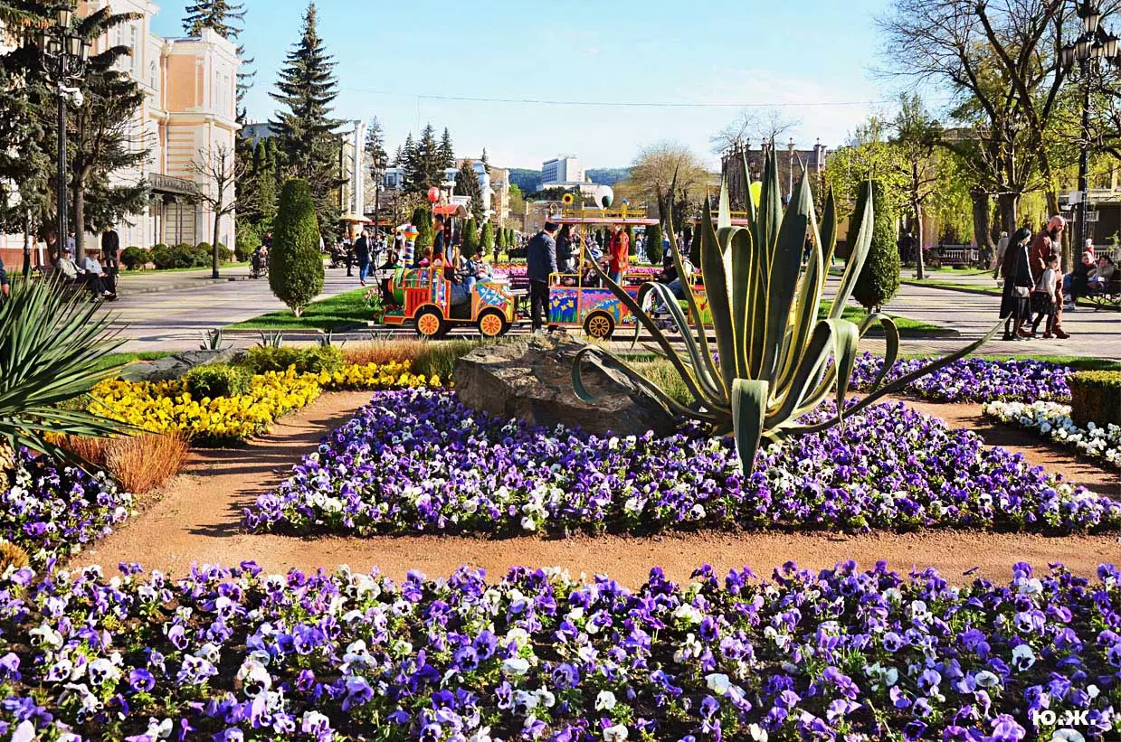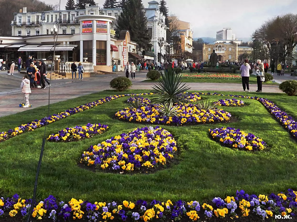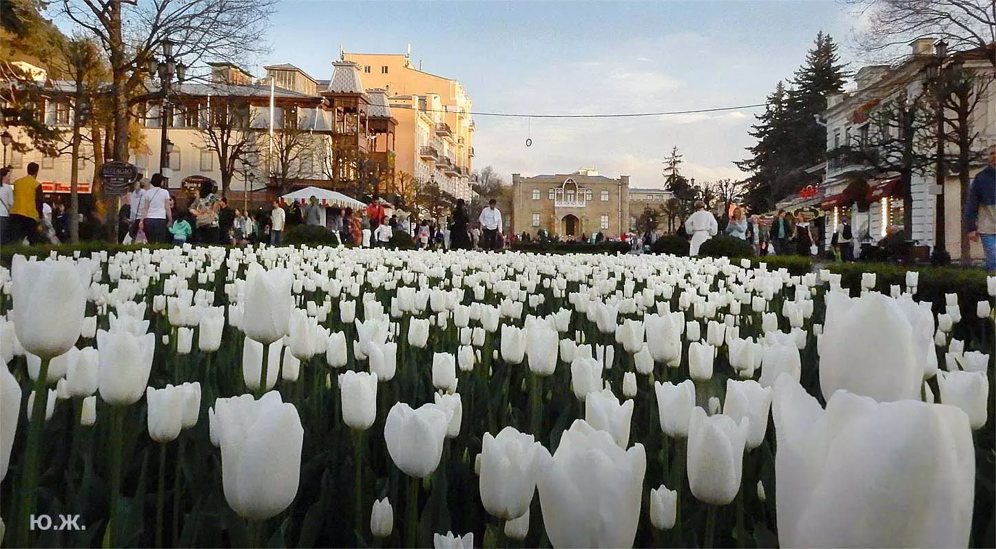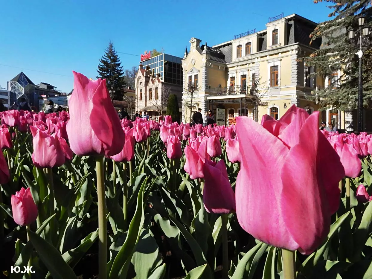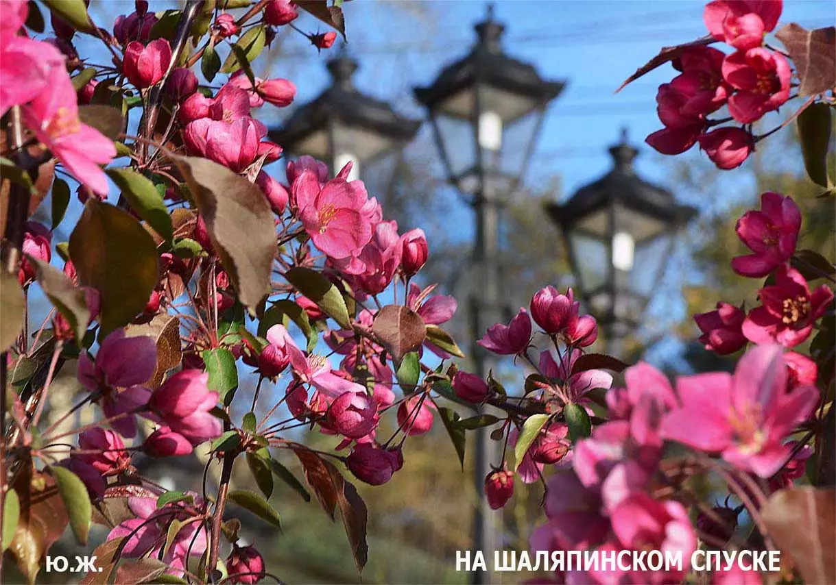 Одни деревья сменяют другие, первое — это время «белой кипени», когда создается такое впечатление, что везде вокруг цветут фруктовые деревья и все белое и нежно-розовое. В конце апреля — начале мая мы любовались впечатляющим цветением крохотного оазиса магнолий, что на Шаляпинском спуске — их крупными белыми, похожими на звезды, цветами. Кстати, в мае выбросило свой единственный очень крупный розовый цветок совсем небольшое деревце магнолии (см. фото). А потом, словно всплеск: зацвели каштаны, сирень, скоро будет акация, каким-то насыщенным ароматом заявила о себе, совсем недавно нежно-голубая глициния — у соседа с первого этажа. А роскошь штучных авторских клумб Курортного бульвара, которые будут всех радовать до глубокой осени и которые нужно воспевать только в стихах! А какими прекрасными ярко-розовыми цветами радуют курортников с их кружками, наполненными богатырским нарзаном, деревья вокруг фонтана «Лягушки»! Сеанс ароматерапии! А вспомните- «Тот цветущий и поющий яркий Май», один день из которого — девятый — мы совсем недавно торжественно отмечали.
