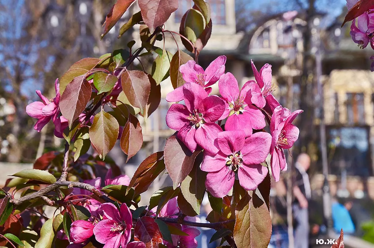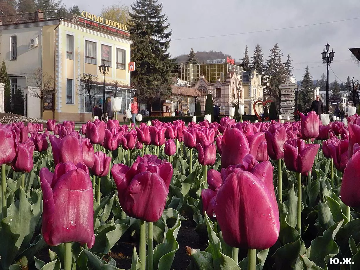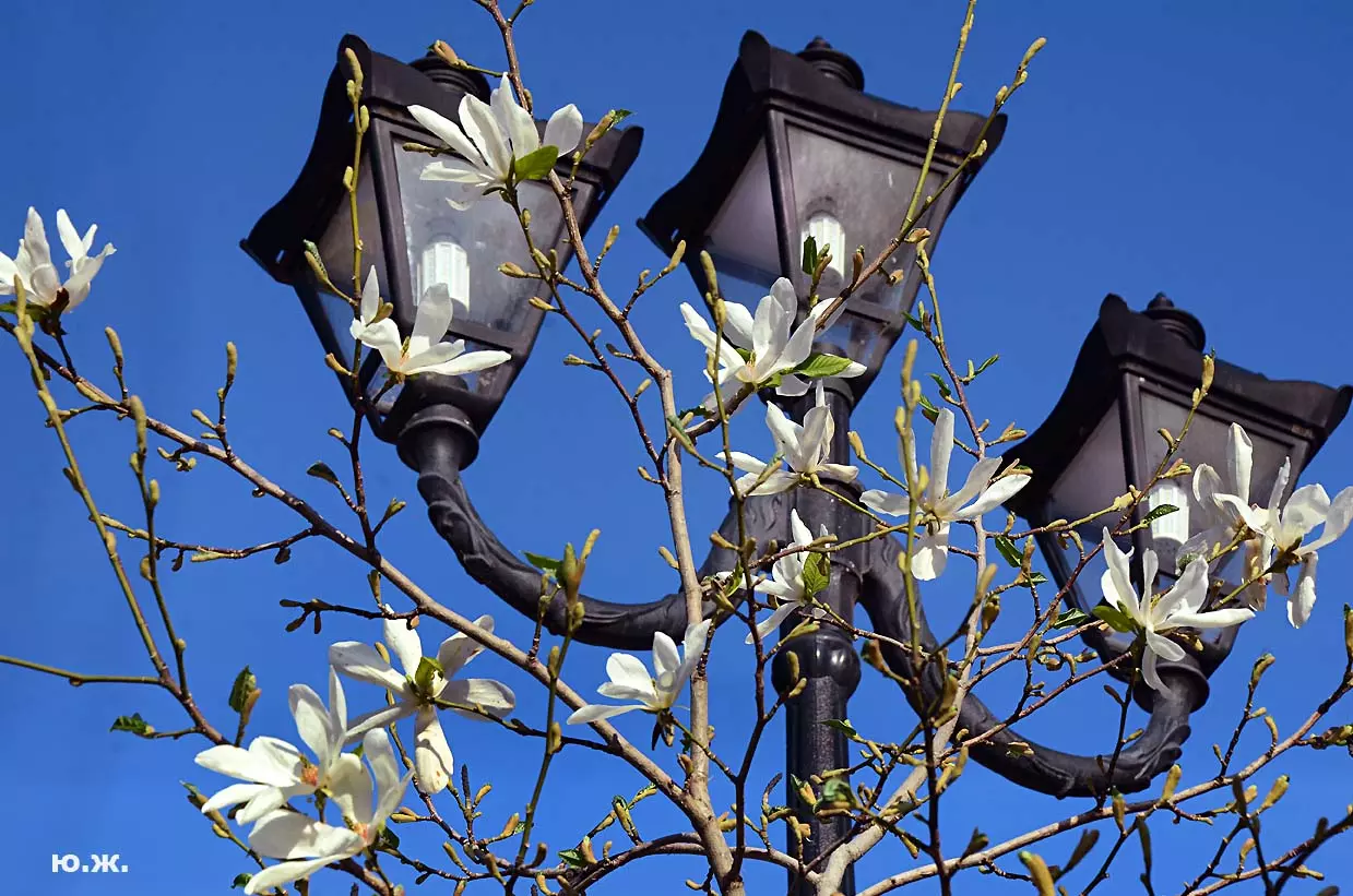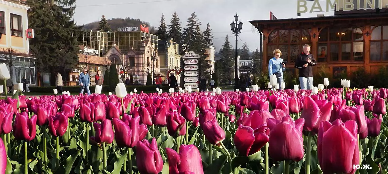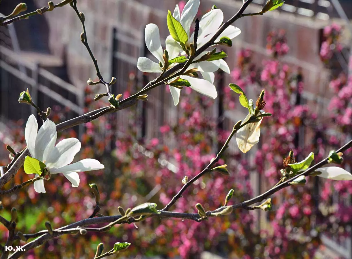 Одни деревья сменяют другие, первое — это время «белой кипени», когда создается такое впечатление, что везде вокруг цветут фруктовые деревья и все белое и нежно-розовое. В конце апреля — начале мая мы любовались впечатляющим цветением крохотного оазиса магнолий, что на Шаляпинском спуске — их крупными белыми, похожими на звезды, цветами. Кстати, в мае выбросило свой единственный очень крупный розовый цветок совсем небольшое деревце магнолии (см. фото). А потом, словно всплеск: зацвели каштаны, сирень, скоро будет акация, каким-то насыщенным ароматом заявила о себе, совсем недавно нежно-голубая глициния — у соседа с первого этажа. А роскошь штучных авторских клумб Курортного бульвара, которые будут всех радовать до глубокой осени и которые нужно воспевать только в стихах! А какими прекрасными ярко-розовыми цветами радуют курортников с их кружками, наполненными богатырским нарзаном, деревья вокруг фонтана «Лягушки»! Сеанс ароматерапии! А вспомните- «Тот цветущий и поющий яркий Май», один день из которого — девятый — мы совсем недавно торжественно отмечали.