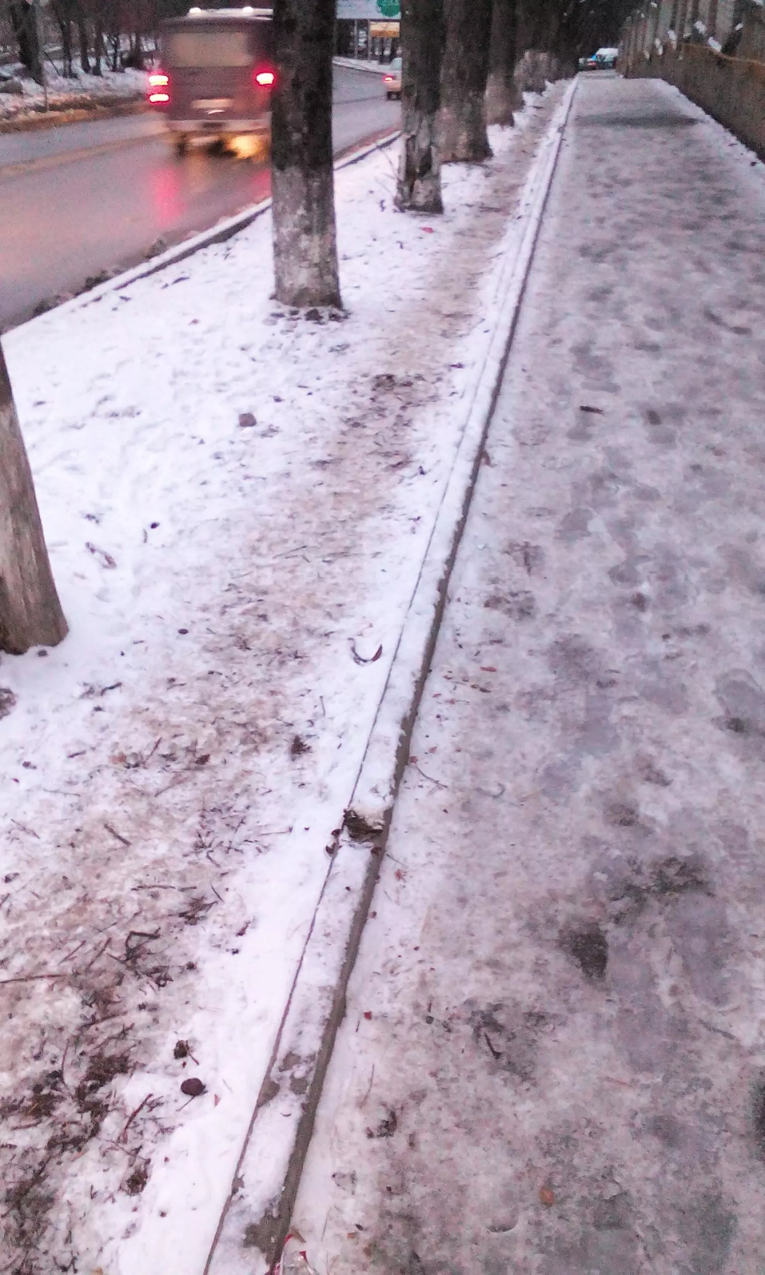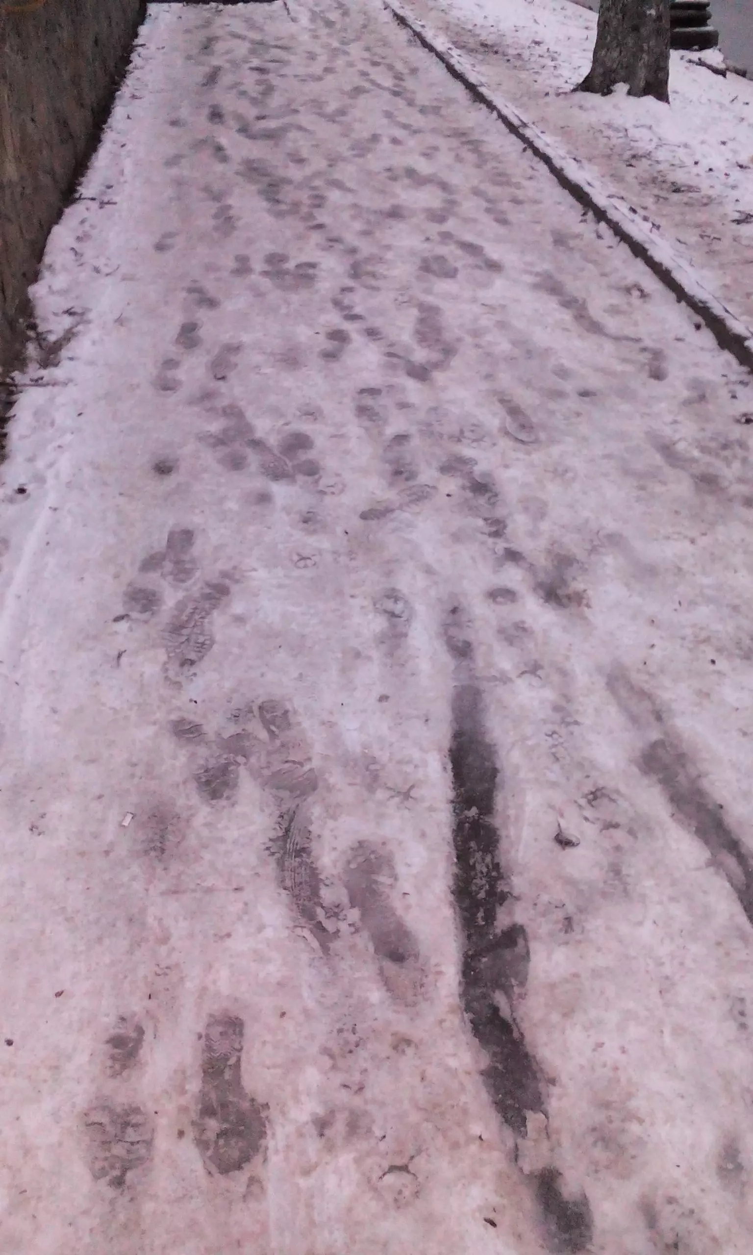 Здесь расположены не только жилые дома. По этому тротуарчику ежедневно ходят студенты и преподаватели медицинского колледжа, работники и некоторые пациенты городской больницы и нескольких поликлиник. То есть этот, казалось бы, незначительный тротуарчик имеет можно сказать стратегически важное значение для целого микрорайона. И все бы хорошо, да вот не следят за ним нисколько. Особенно это ощущается сейчас, зимой. В эти дни у нас жуткий гололед. Многочисленными и неоднократными просьбами жители добились установки здесь, год или два назад, поручня, но и он не спасает. Идти вниз по ледяной горке, даже при наличии поручня, не решаются и молодые. Что уж говорить о людях пожилых. Протоптали рядом тропиночку на снегу, но и она уже стала скользкой. Идти ближе к проезжей части нельзя — там остались рытвины еще с тех времен, когда меняли бордюры. Вот и спрашивается, как людям пройти по такой «дороге жизни», чтобы не убиться и не покалечиться? И такая ситуация повторяется каждый год по нескольку раз за зиму.