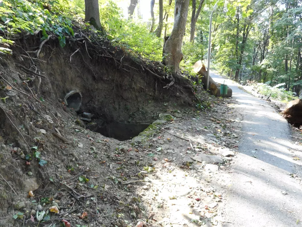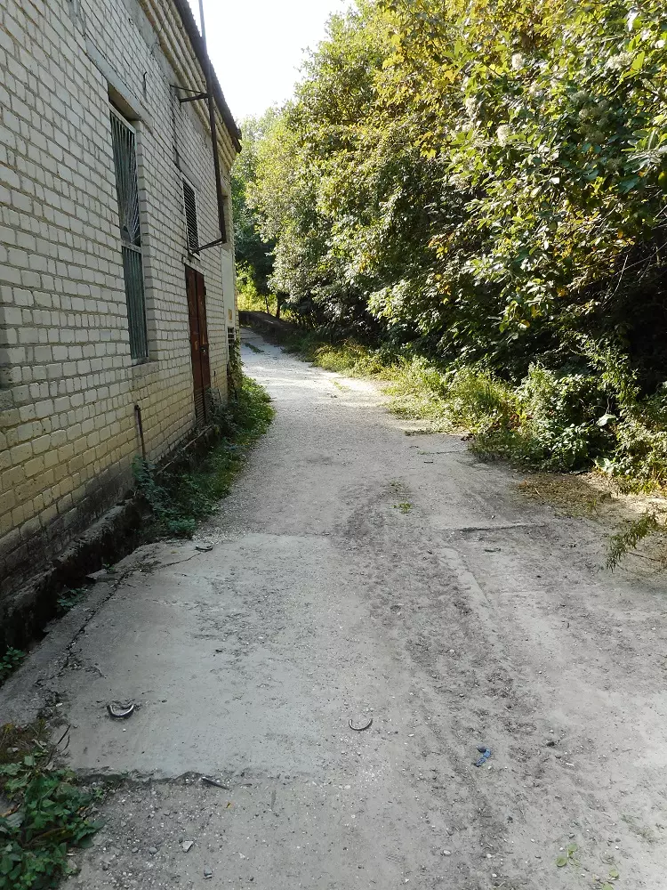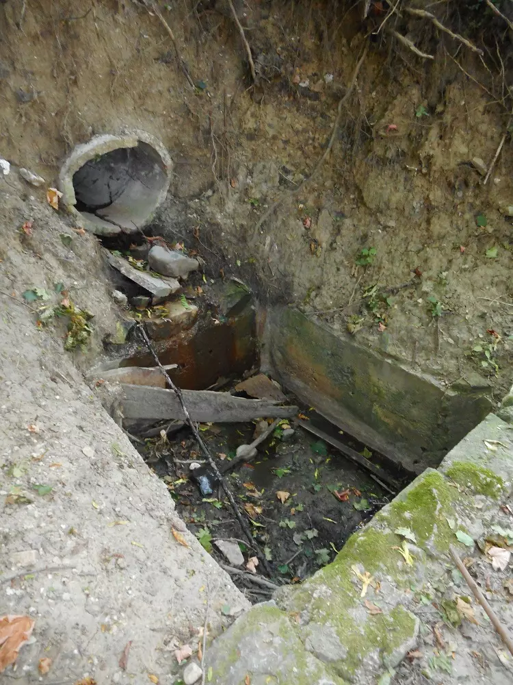 - ненакрытая навесом старая гнилая ливнёвка прямо под забором санатория