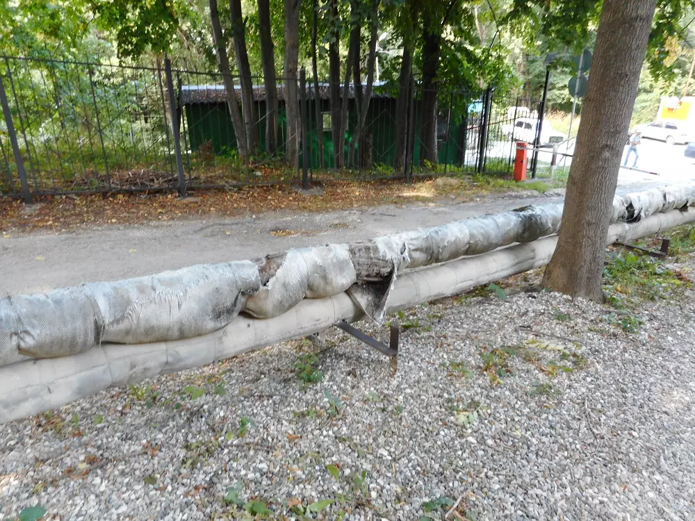 - Трубы теплотрассы со старой порванной теплоизоляционной обмоткой. Торчит и вываливается местами старая стекловата (!!!) — крайне вредный для здоровья людей материал. Когда ветер — она может разноситься по всей округе!