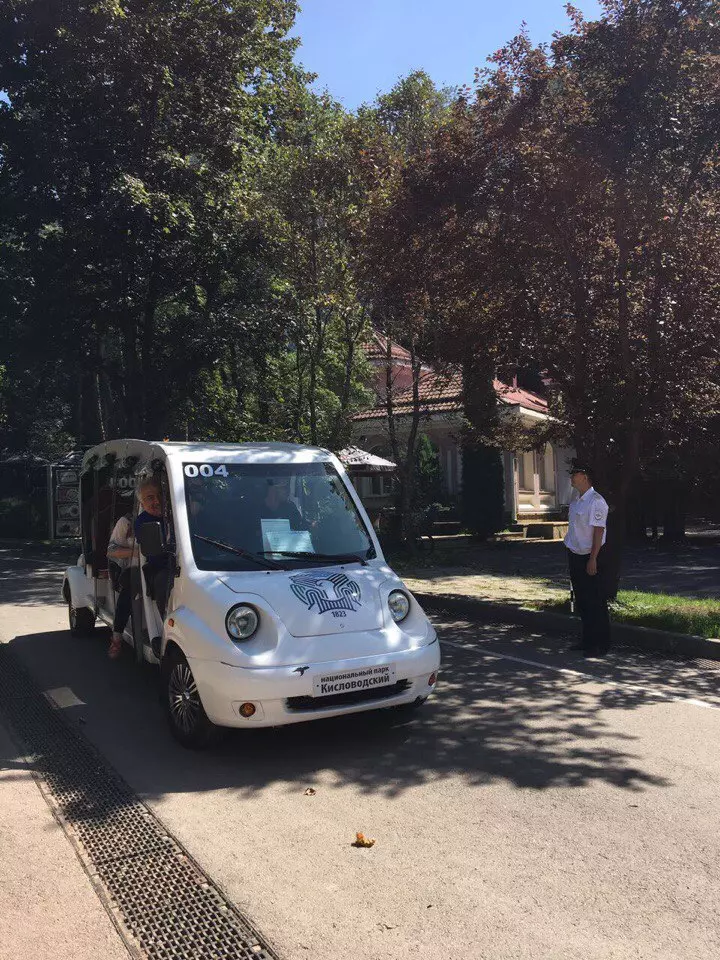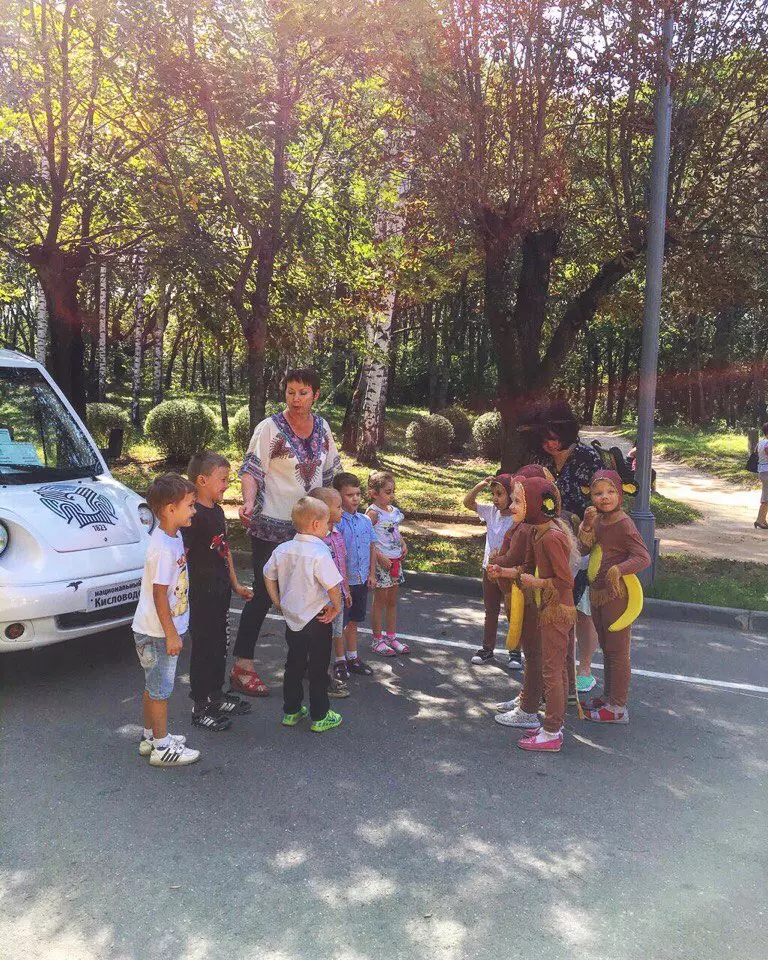 Ребята разыграли красочное театрализованное действие о путешествии на автомобиле, правонарушителях и опасностях, возникающих на дороге. Дети в игровой форме повторили основные правила ПДД и с неподдельным интересом побеседовали с настоящим полицейским. Для того, чтобы дошкольники почувствовали себя полноценными участниками дорожного движения, прогулка по парку проходила на современном экологически чистом транспорте – электромобилях национального парка «Кисловодский».