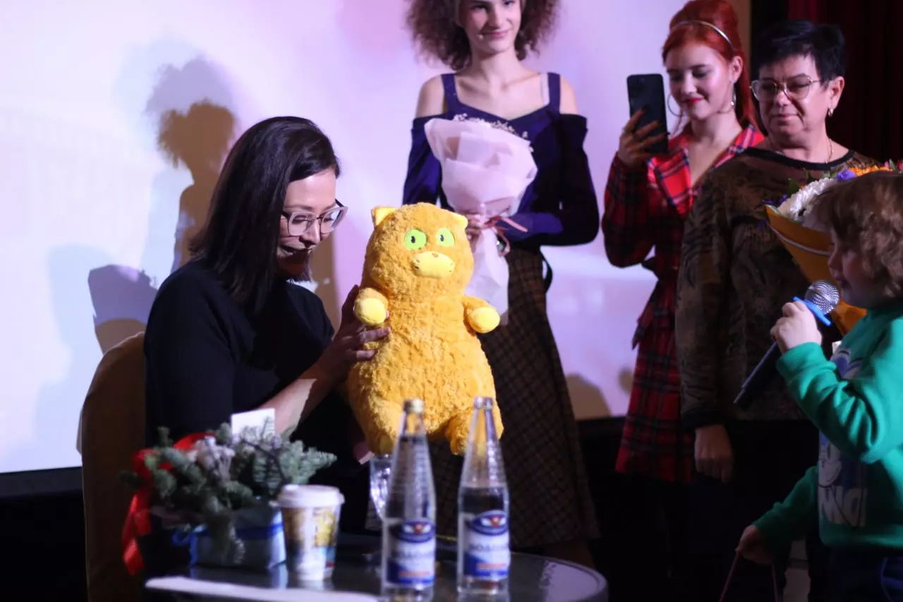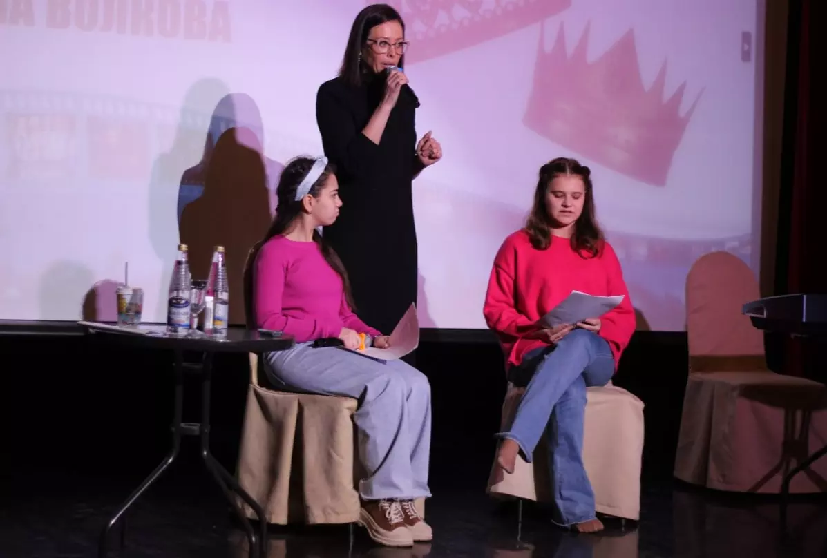 Она поведала ребятам о том, как мечтала стать певицей или актрисой еще с раннего возраста, и что она понимает и уважает желание каждого участника кинотеатральной школы учиться и совершенствоваться в актерском мастерстве.