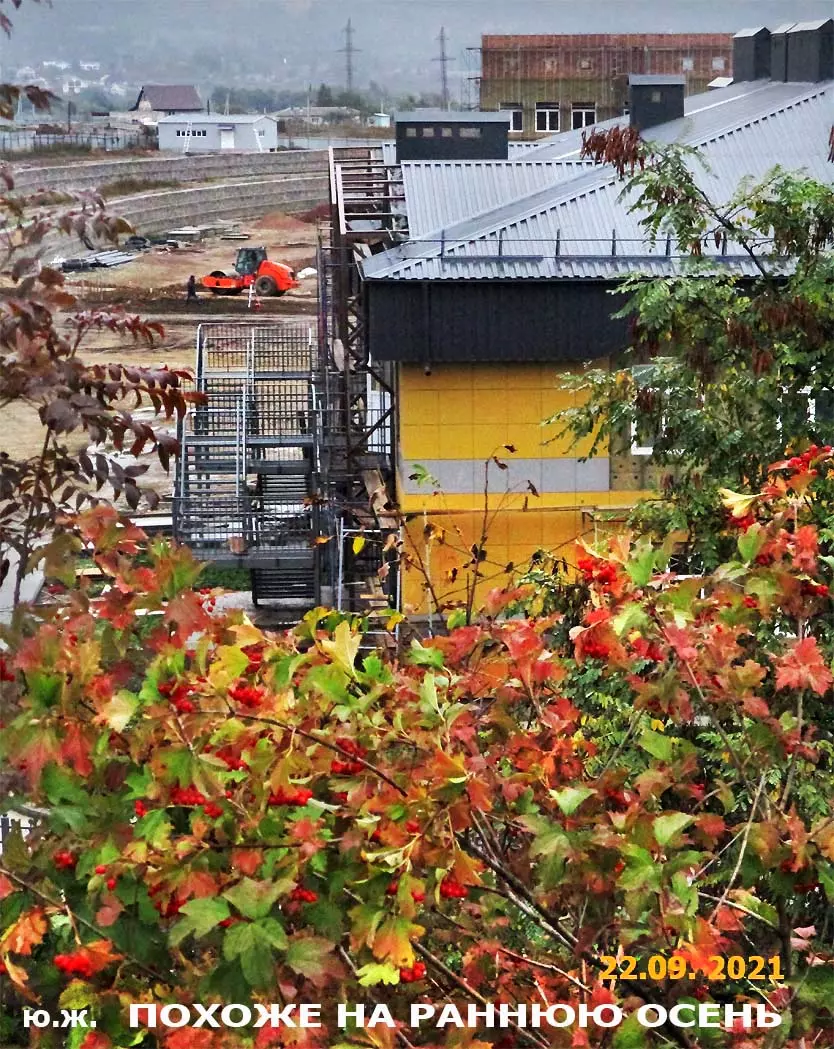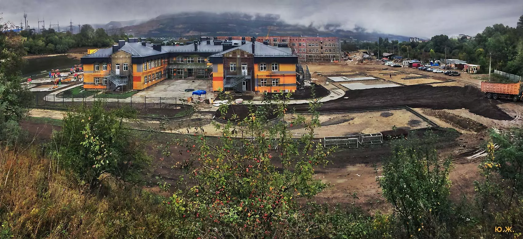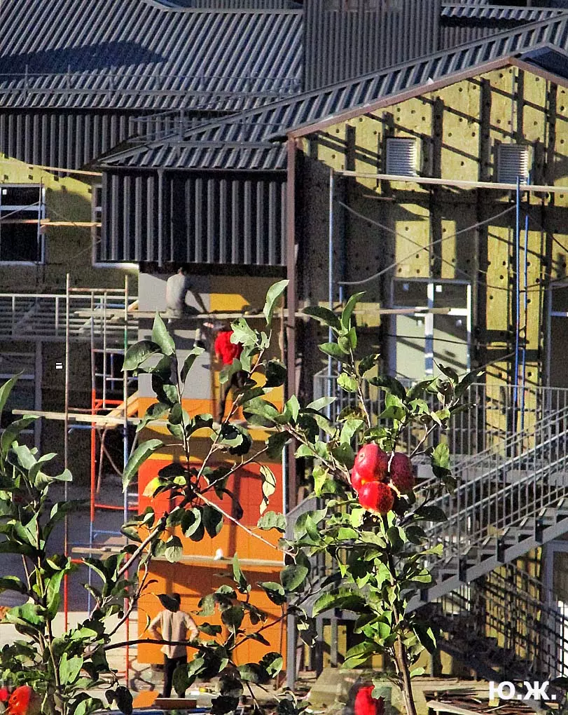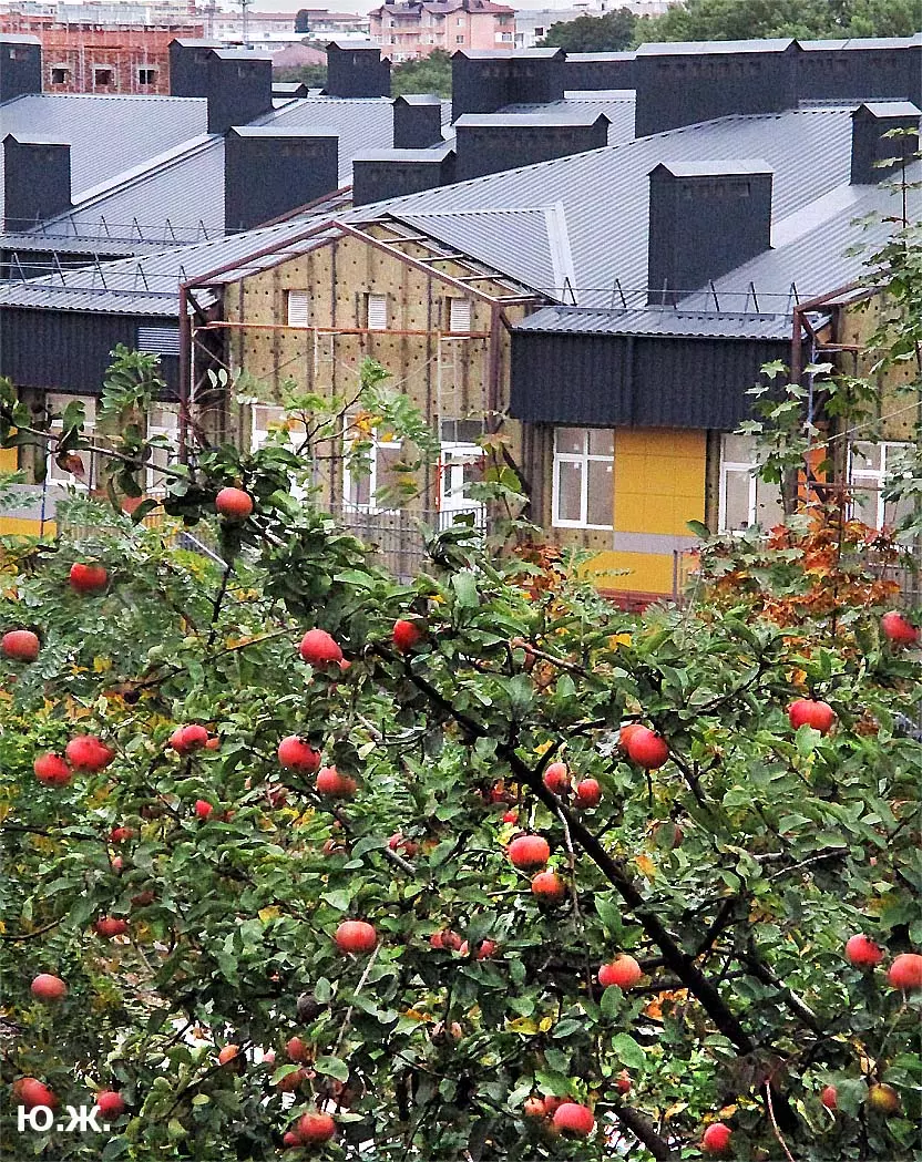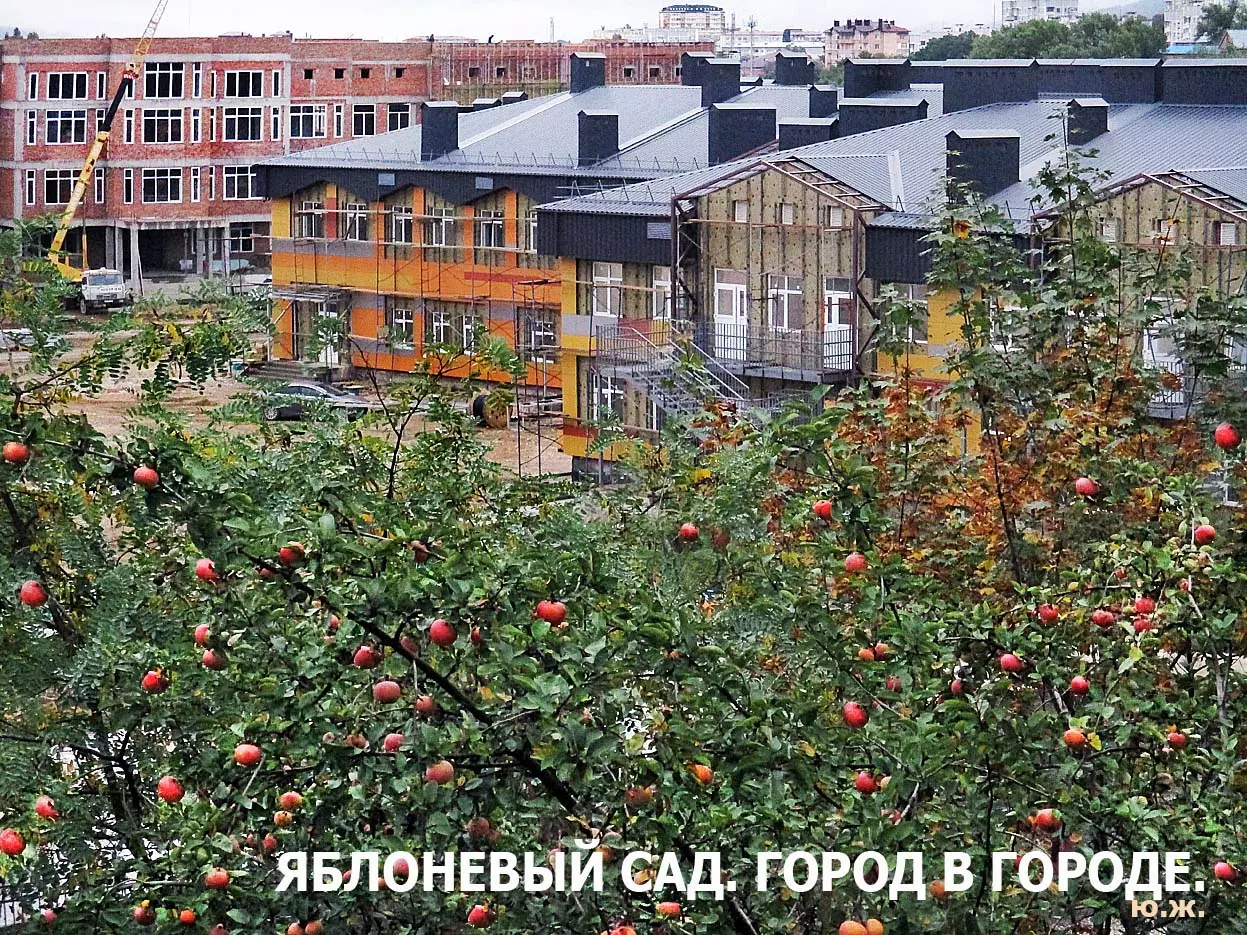 Так выглядит уже ставшая знаменитой стройка в последние дни сентября — начале октября. Как я понял в эти дни, холодные и часто дождливые, много людей работают на прокладке подъездных дорог к школе и садику, укладке пешеходных плиток и подготовке к укладке асфальта (на фото). Много рабочих на территории, в зданиях. Появился у корпусов садика яркий детский городок. Сейчас особенно красиво выглядят с созревшими плодами яблони, создающие впечатление утопающей в яблоневом саду стройки. Все больше и больше вокруг золотистого и багряного цвета. Осень набирает силы.