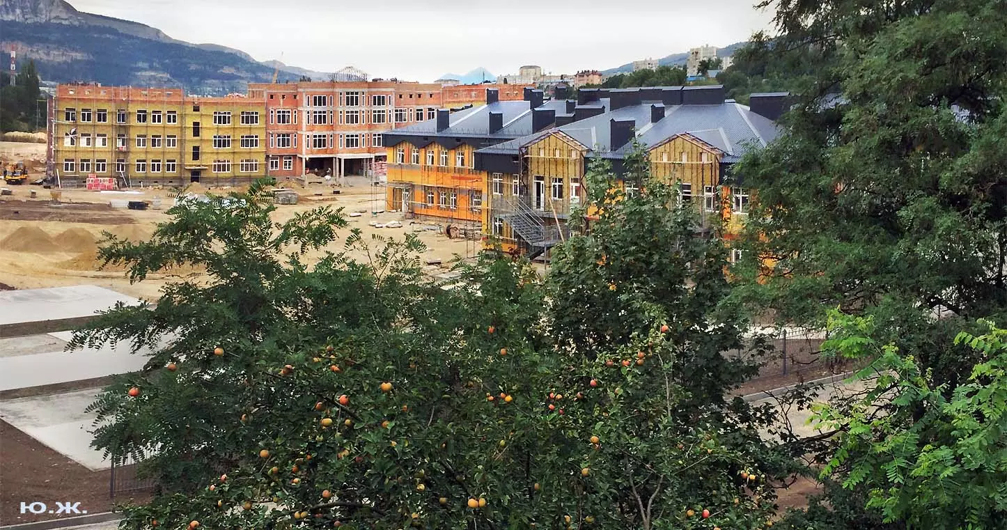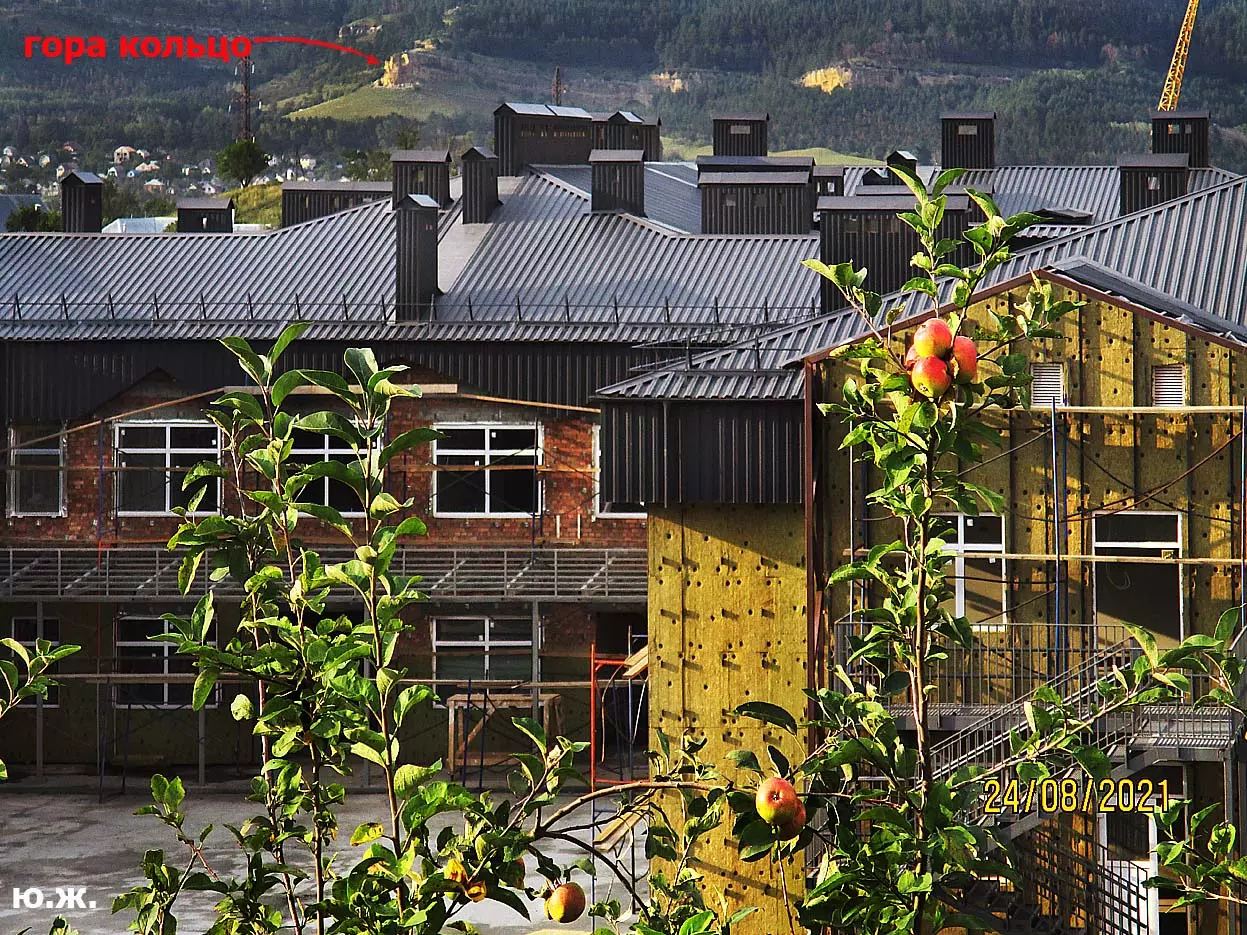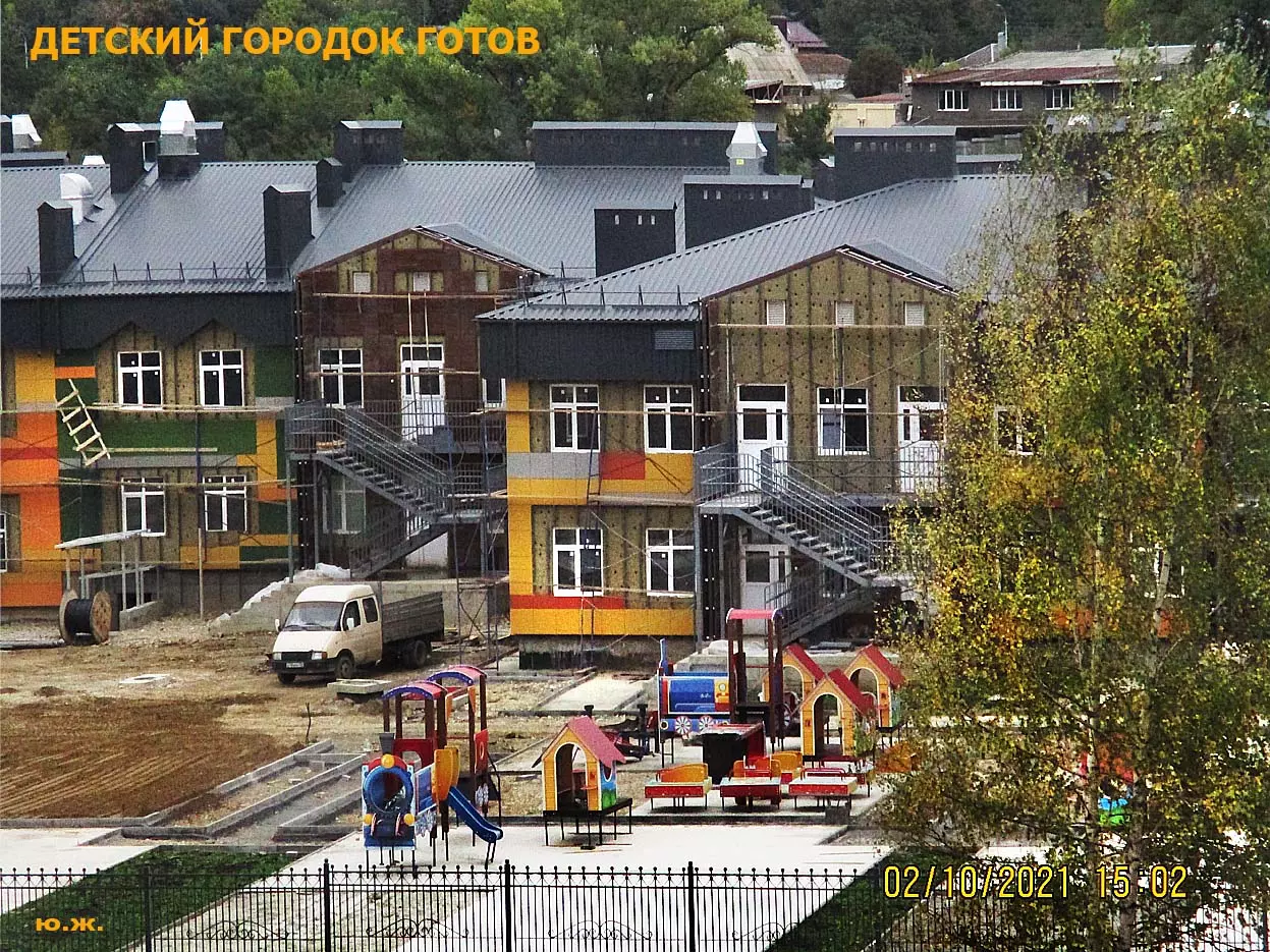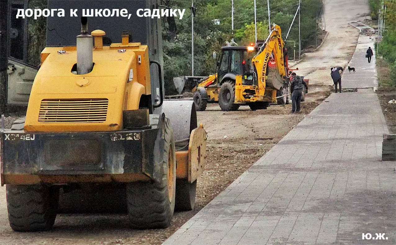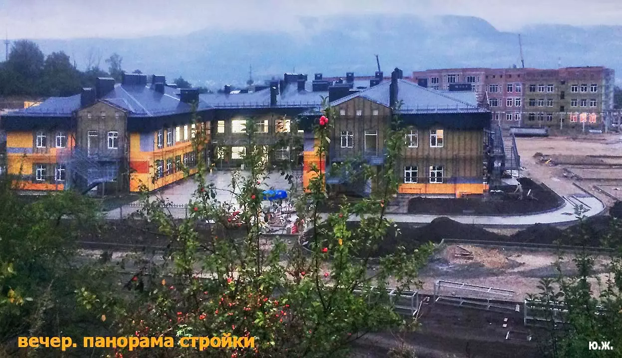 Так выглядит уже ставшая знаменитой стройка в последние дни сентября — начале октября. Как я понял в эти дни, холодные и часто дождливые, много людей работают на прокладке подъездных дорог к школе и садику, укладке пешеходных плиток и подготовке к укладке асфальта (на фото). Много рабочих на территории, в зданиях. Появился у корпусов садика яркий детский городок. Сейчас особенно красиво выглядят с созревшими плодами яблони, создающие впечатление утопающей в яблоневом саду стройки. Все больше и больше вокруг золотистого и багряного цвета. Осень набирает силы.