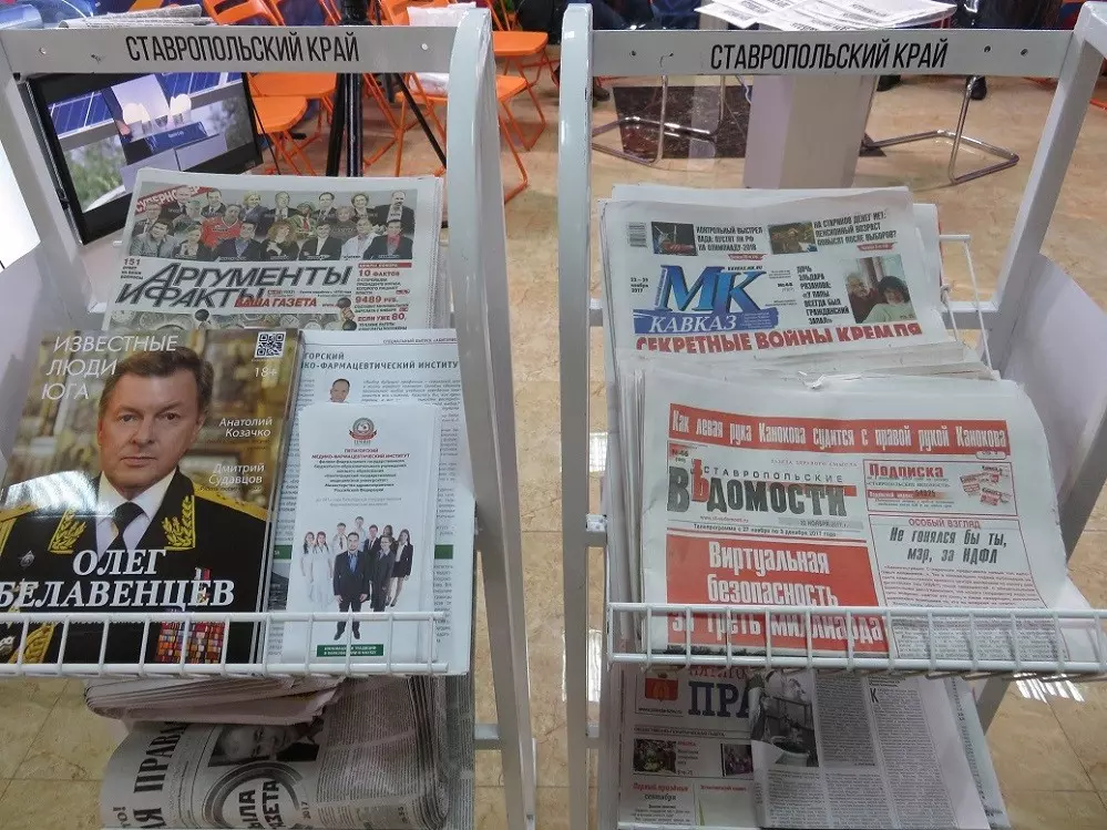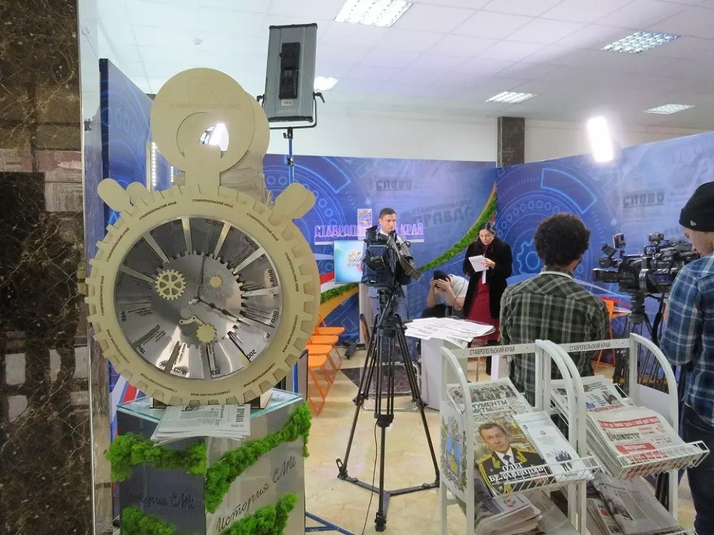 Высокие гости также посетили экспозиции регионов, где наряду с выставками печатных изданий электронные СМИ организовали дискуссионные площадки с выходом в прямой эфир. На стенде СМИ Ставропольского края было представлено еще два арт-объекта: «колесо истории» ставропольских СМИ и источник минеральной воды, из которого все гости могли испить живительной целительной воды.