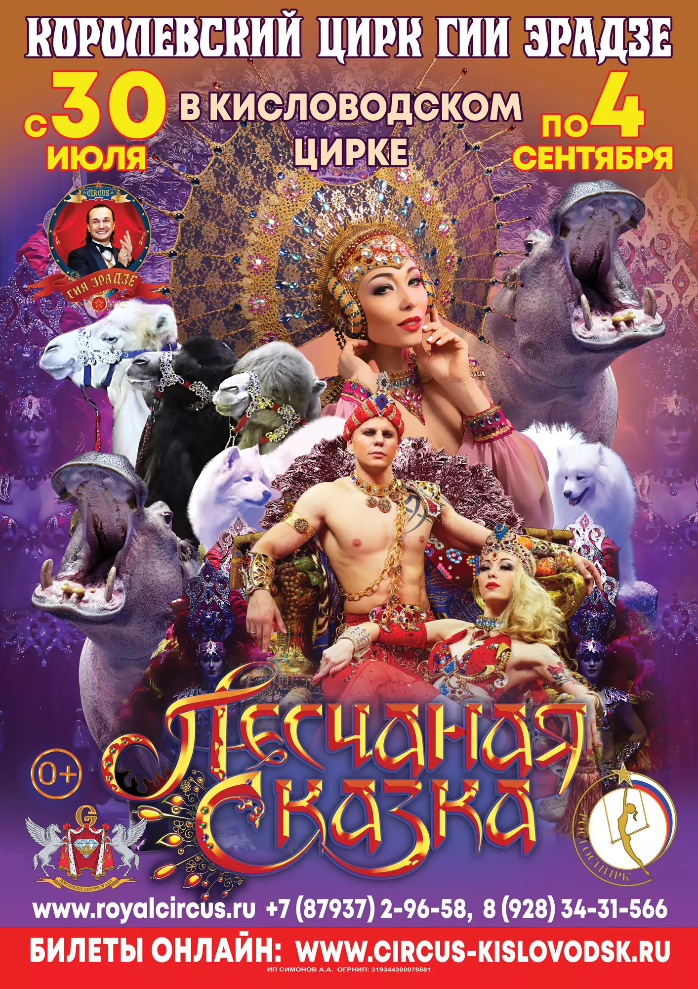 С 30 июля по 4 сентября 2022 г. впервые в Кисловодском государственном цирке заслуженный артист России Гия Эрадзе представит новое грандиозное цирковое шоу: незабываемое зрелище, удивительные аттракционы, титулованные артисты Росгосцирка, авторские декорации и эксклюзивные костюмы — цирковой спектакль с единой сюжетной линией.