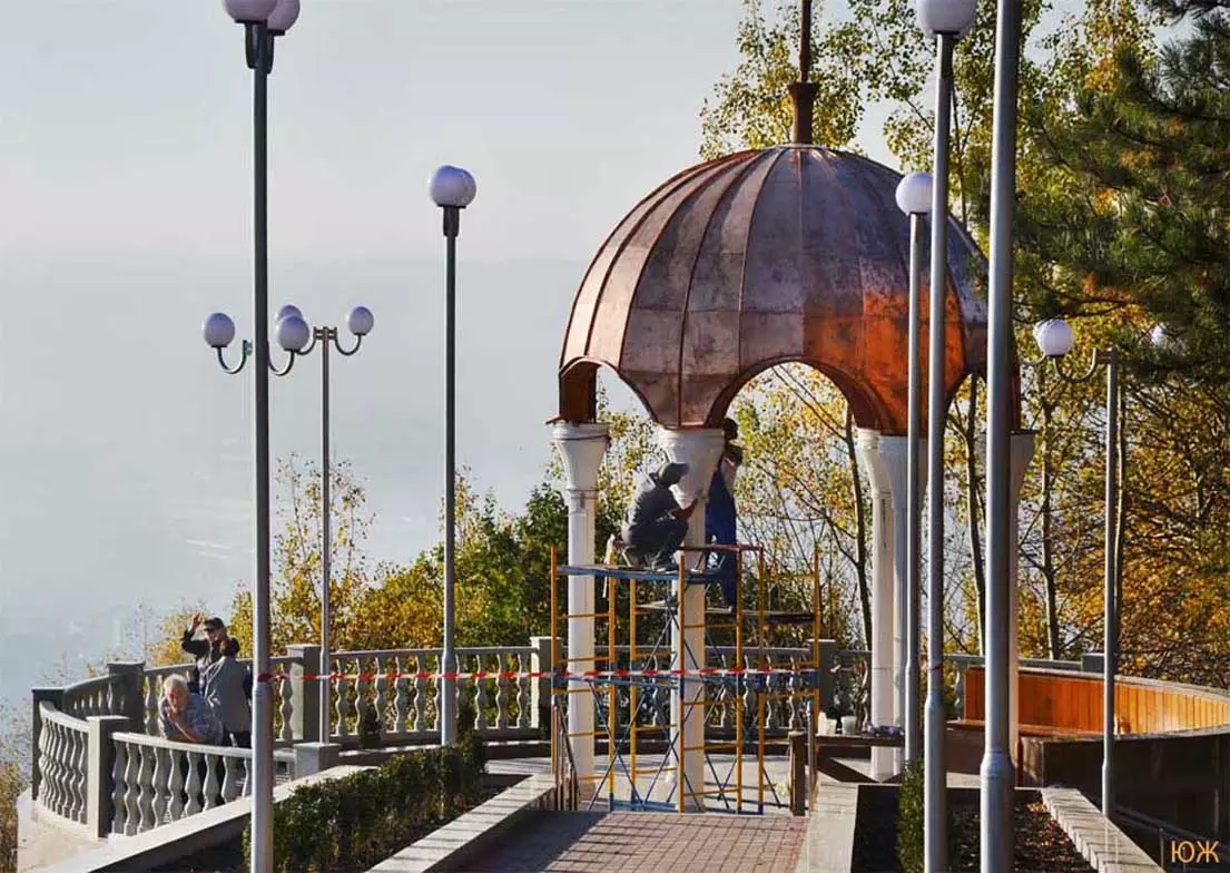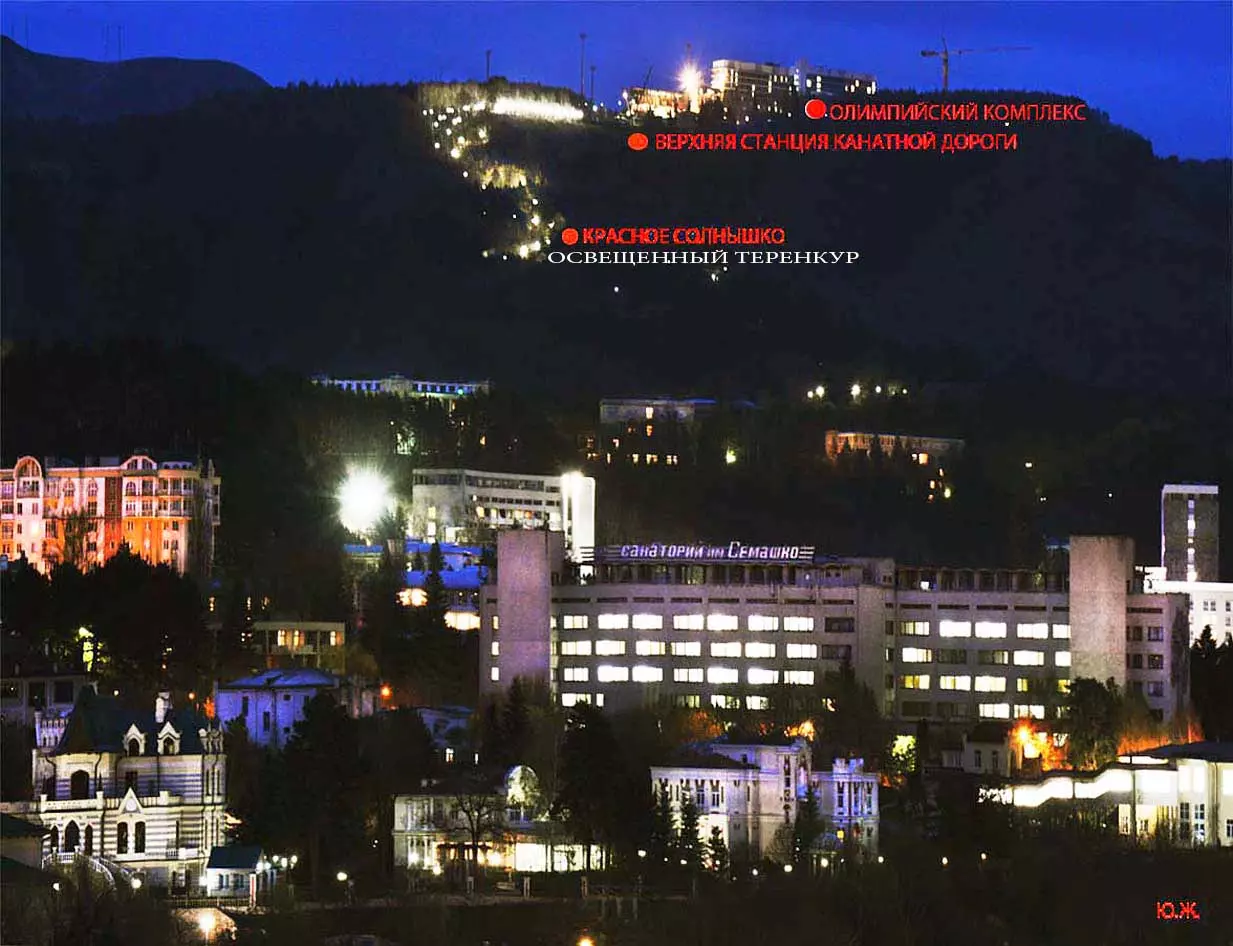 И в заключение. Парк прекрасен со всех точек, но лучше на него смотреть с верхних. Таковых — очень много. Почти отовсюду это сплошное море пышной южной зелени, где, как островки, виднеются знакомые очертания – Храма Воздуха, Скалы и кафе Красного Солнышка, Долины Роз, старого бассейна, освещенного терренкура от верхней станции канатной дороги до памятника М.Ю. Лермонтову, санаториев в парке… И вверх и вниз бегают красный и желтый вагончики канатной дороги.