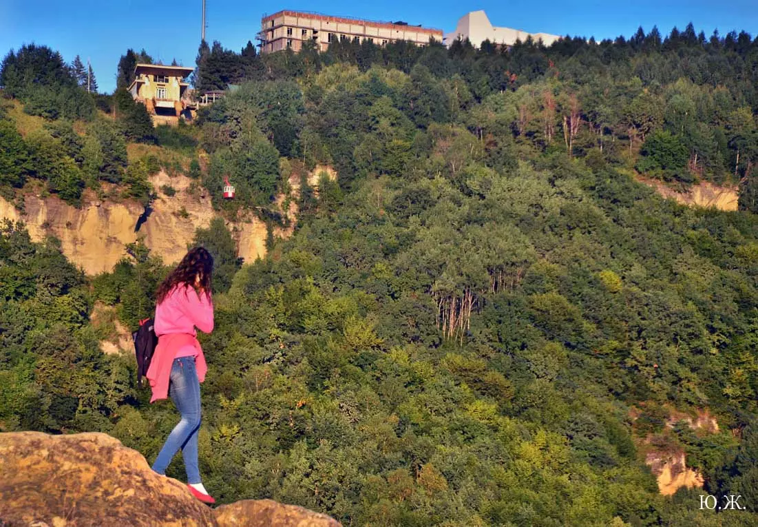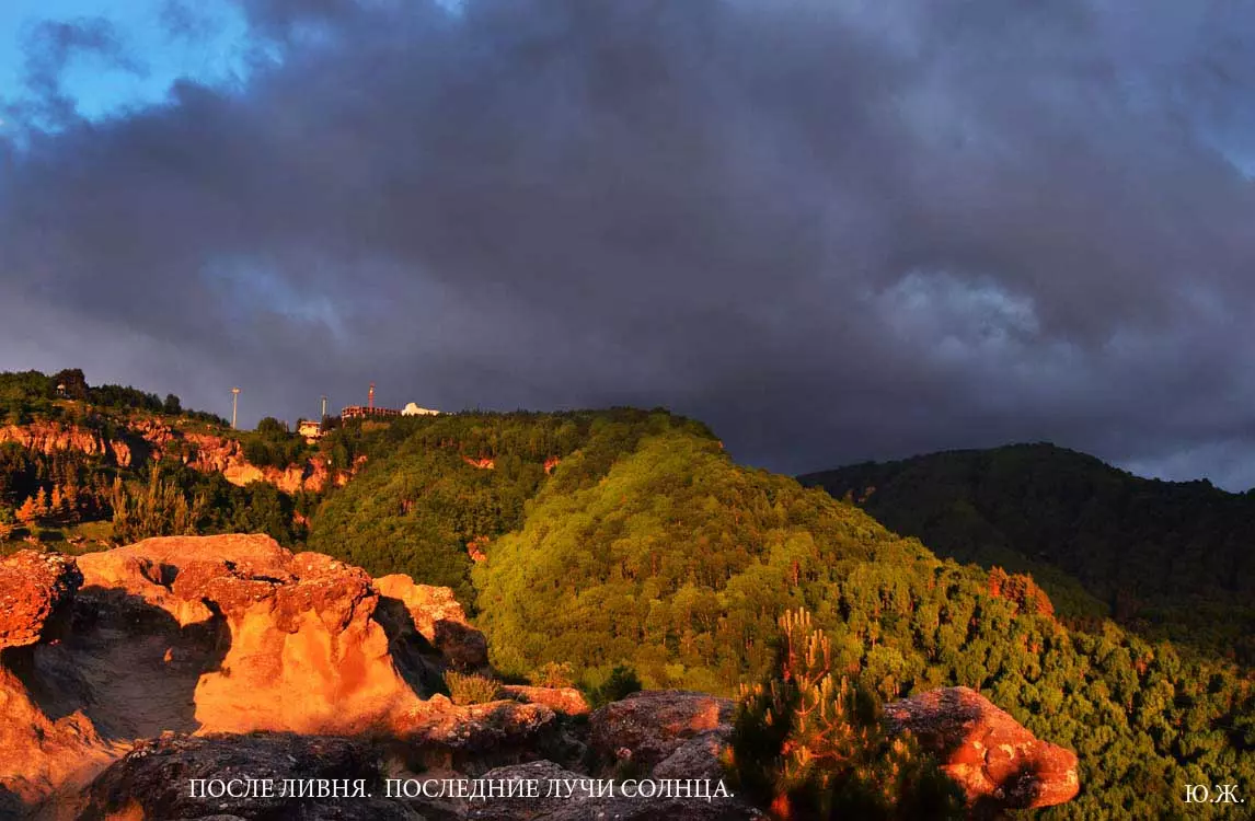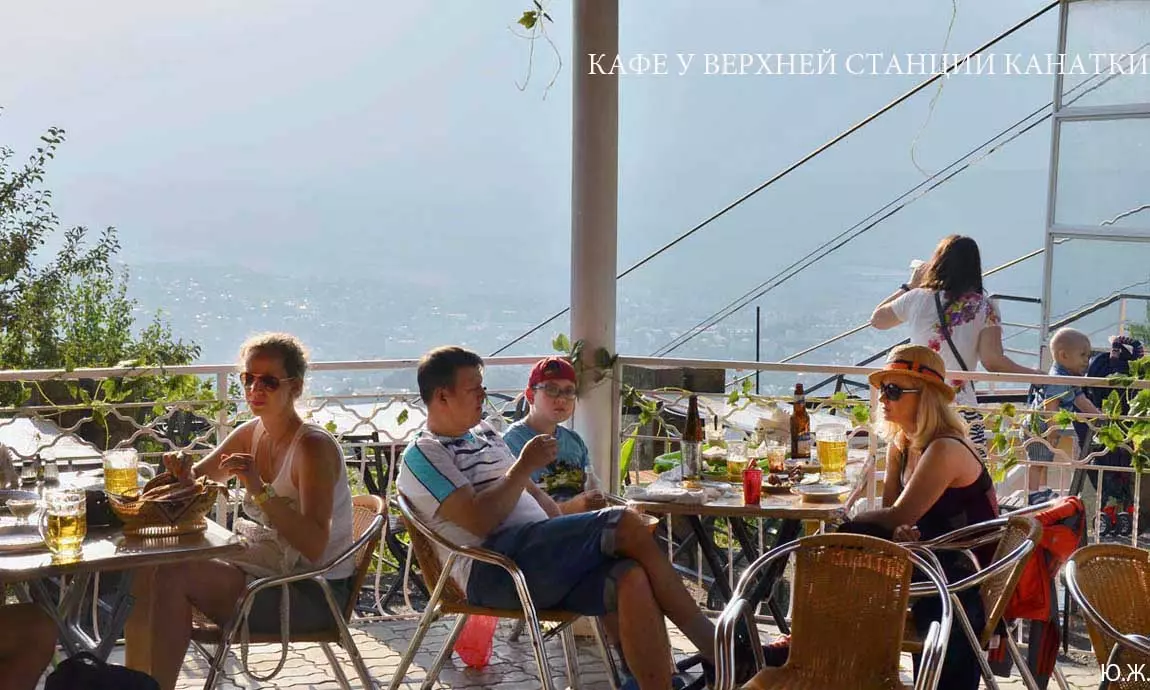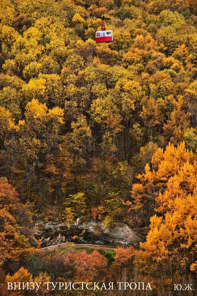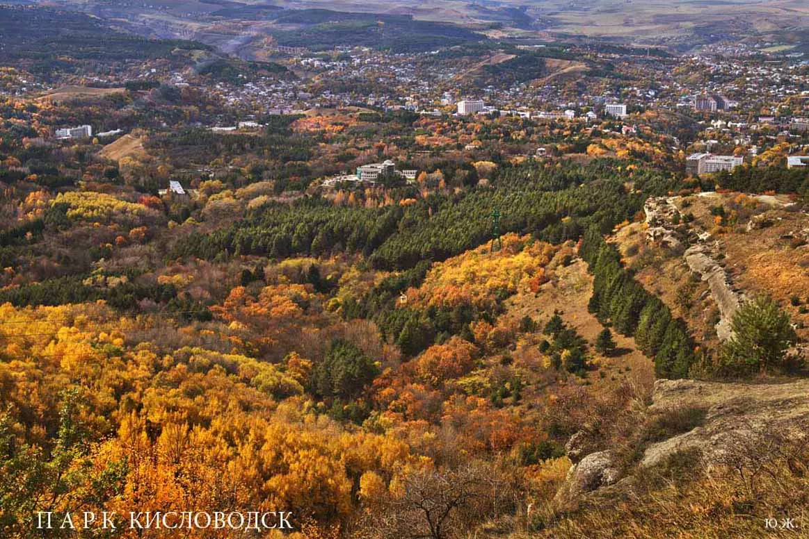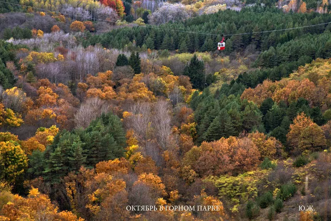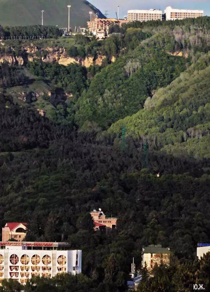 И в заключение. Парк прекрасен со всех точек, но лучше на него смотреть с верхних. Таковых — очень много. Почти отовсюду это сплошное море пышной южной зелени, где, как островки, виднеются знакомые очертания – Храма Воздуха, Скалы и кафе Красного Солнышка, Долины Роз, старого бассейна, освещенного терренкура от верхней станции канатной дороги до памятника М.Ю. Лермонтову, санаториев в парке… И вверх и вниз бегают красный и желтый вагончики канатной дороги.