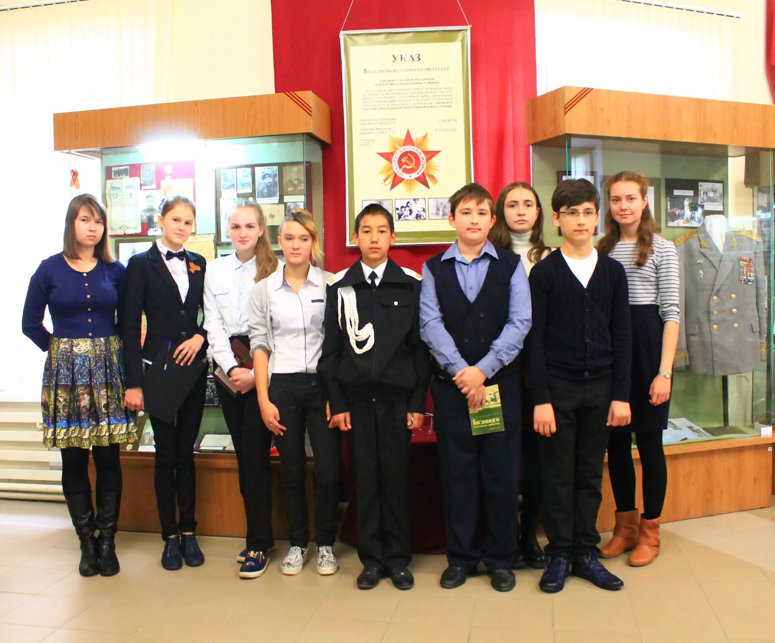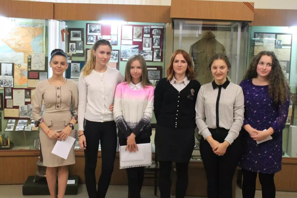 Среди учащихся 7 – 8 классов жюри отметило лучшую экскурсию, проведённую Глущенко Дарьей (I место), на II-ом месте – Куликова Олеся, Кириленко Анастасия, Столбова Диана, Щуров Тимофей. Газиев Исмаил (кадет из школы № 7), уже второй год подряд проводит экскурсии по экспозиции, посвященной Героям Советского Союза. В этом году он рассказал о боевом пути Лактионова Андрея Фёдоровича и о том, что он вместе с другими лётчиками, в том числе Героем Советского Союза Д. М. Татаренко, единственной на Ставрополье лётчицей – бомбардировочной авиации А. А. Скобликовой–Камчатной, добился открытия памятника – самолёта лётчикам, погибшим в небе Кавказа. На сегодняшний день памятник находится в аварийном состоянии и даже не стоит на учёте. А вот АмаякБадалов (из той же школы) нетолькопознакомилсбиографией Героя Советского Союза Д. Ф. Тимофеева, одного из 28 героев – панфиловцев, волею судьбы похороненном в г. Кисловодске, но и предложил увековечить его память в Краеведческом музее, объяснив, что администрация города ( Луценко Н. Б.) никак не отреагировала на письмо Краеведческого общества с предложением увековечить память Героя на Пятницком холме, установив плиту с его фамилией на обелиске в честь героев Гражданской и Отечественной войн. К сожалению, ответа не последовало.