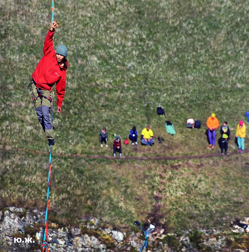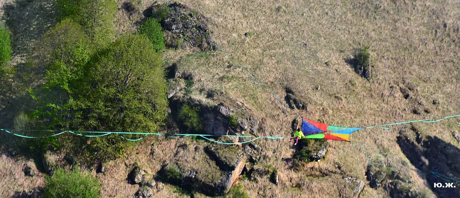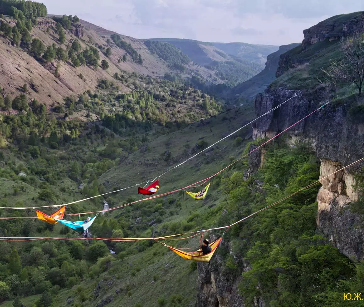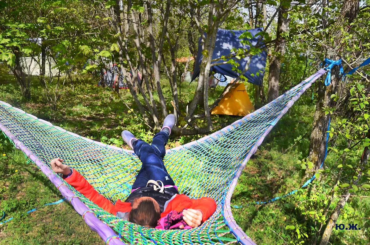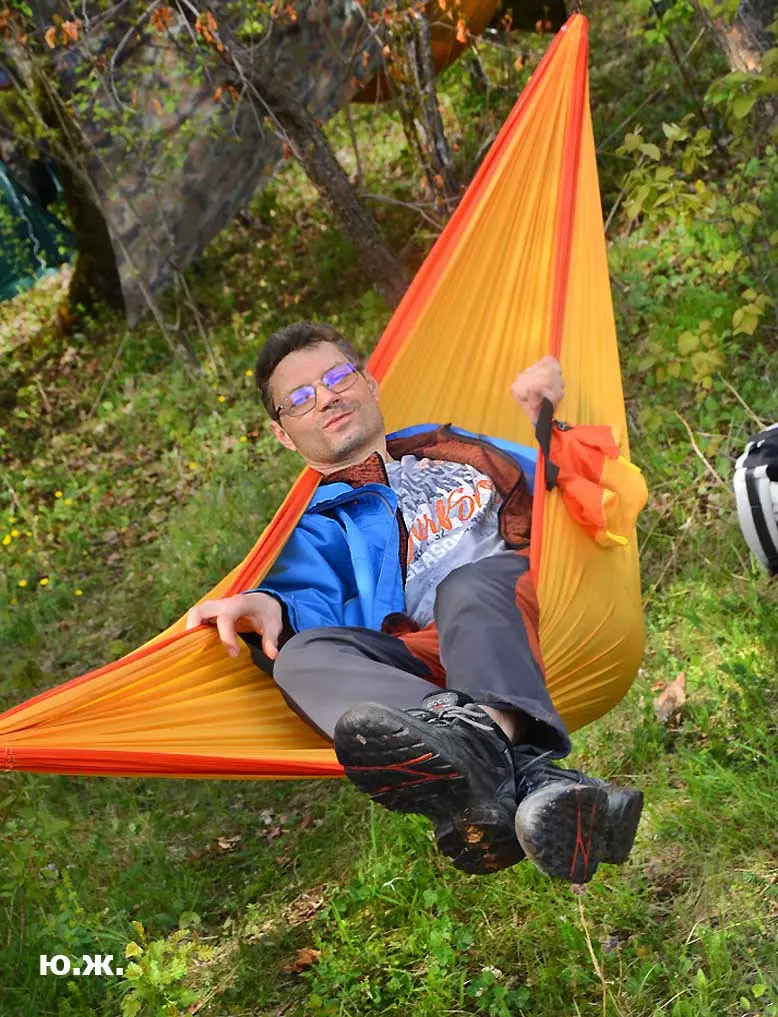 На этот раз большой интерес и внимание было к гамакам — гамакам ярким, каких-то солнечных, флюоресцентных цветов. Похожие на лодки, ладьи, они раскачивались и у палаток — где с детьми, где с девушками. Прямо у дороги, которая вела к обрыву со стропами, возлежали мужчины, закинув ногу на ногу, листая свои гаджеты. Прямо посередине каньона был натянут большой яркий гамак-сетка, и интересно было наблюдать, как к нему по стропам изредка причаливали хайлайнеры. Насколько я понял, было не так-то просто взбираться на него: они часто срывались и висели на страховках головой вниз, чтобы, восстановив дыхание, снова подниматься к гамаку.