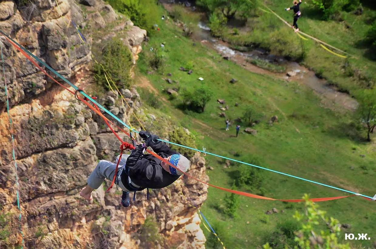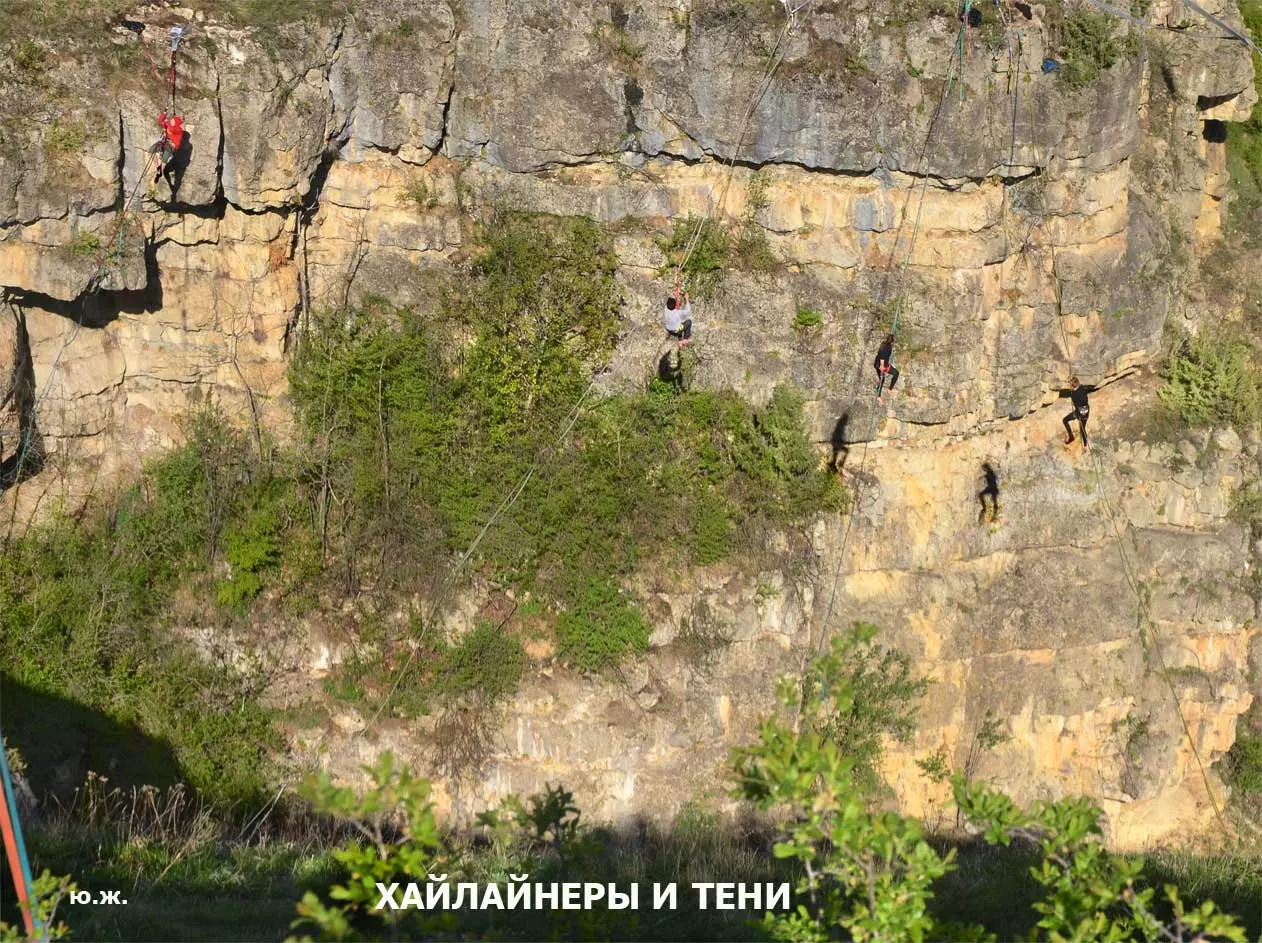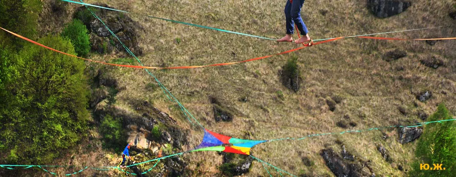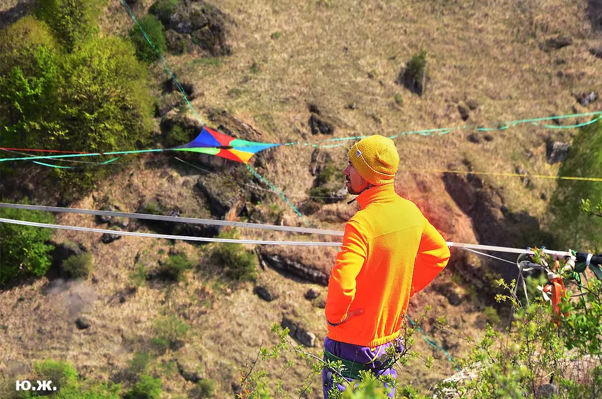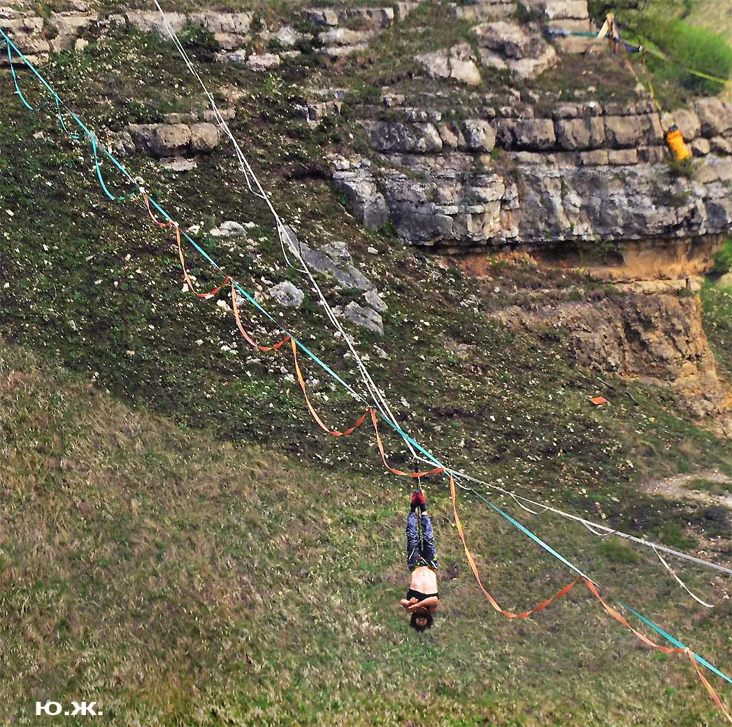На этот раз большой интерес и внимание было к гамакам — гамакам ярким, каких-то солнечных, флюоресцентных цветов. Похожие на лодки, ладьи, они раскачивались и у палаток — где с детьми, где с девушками. Прямо у дороги, которая вела к обрыву со стропами, возлежали мужчины, закинув ногу на ногу, листая свои гаджеты. Прямо посередине каньона был натянут большой яркий гамак-сетка, и интересно было наблюдать, как к нему по стропам изредка причаливали хайлайнеры. Насколько я понял, было не так-то просто взбираться на него: они часто срывались и висели на страховках головой вниз, чтобы, восстановив дыхание, снова подниматься к гамаку.