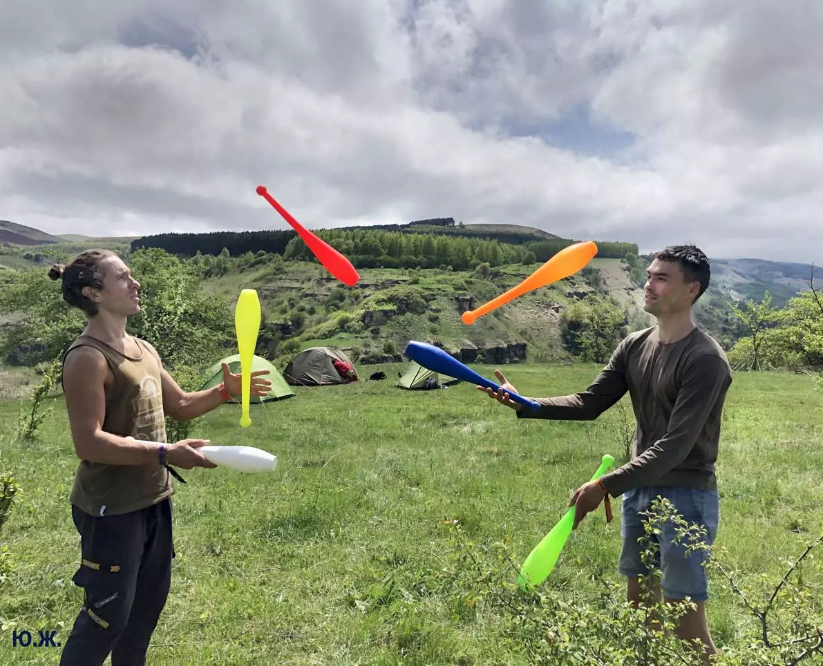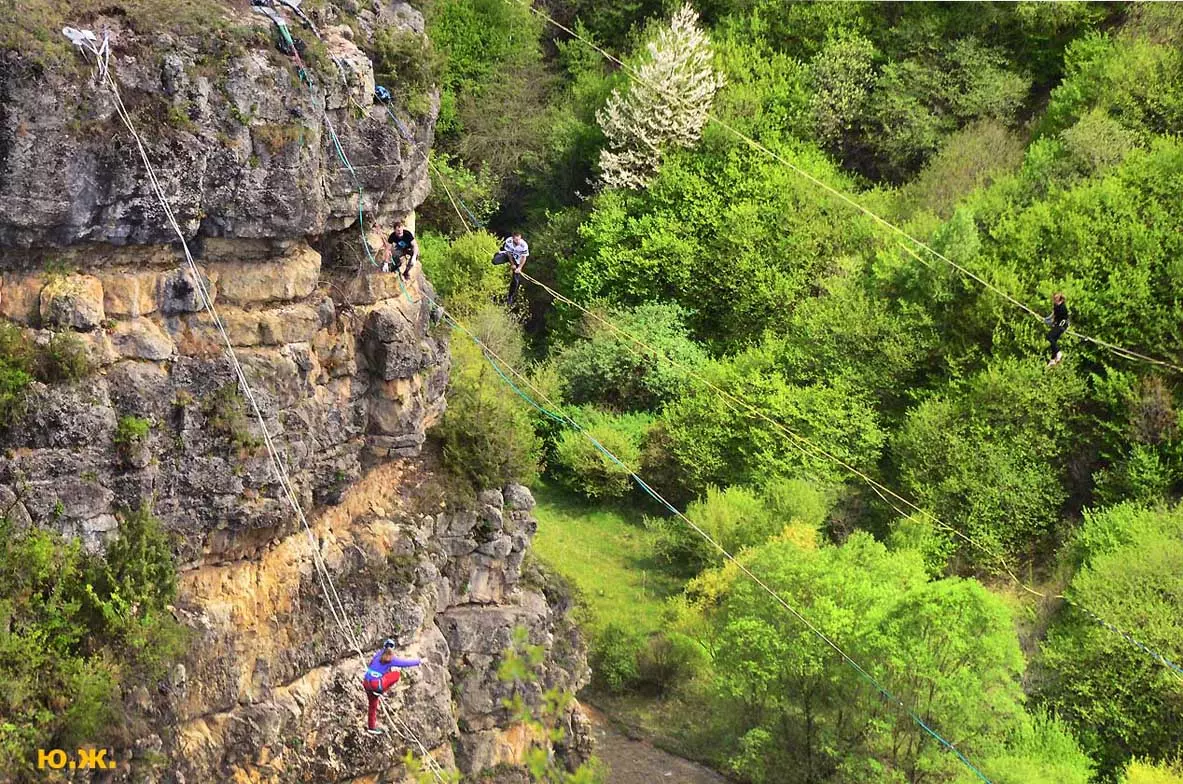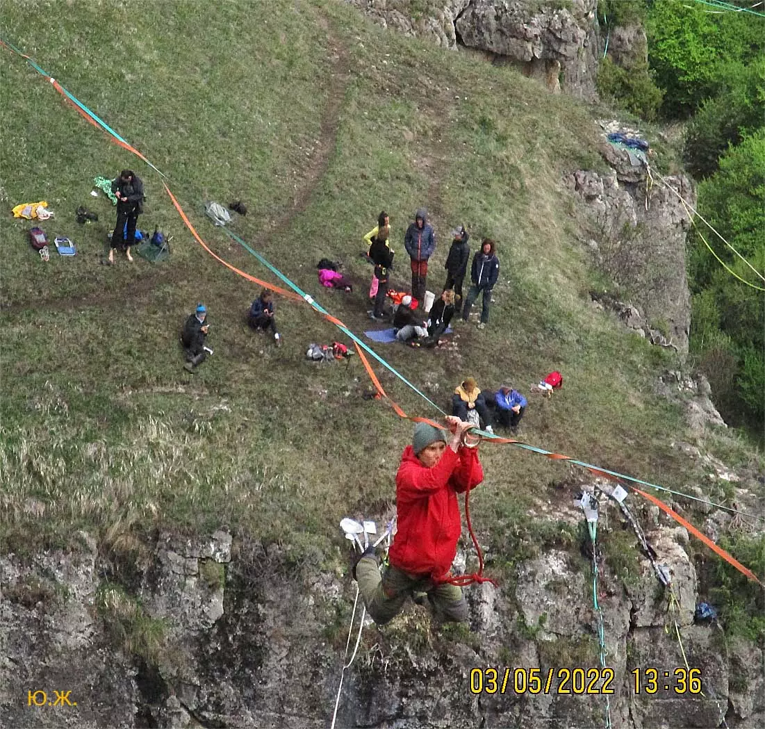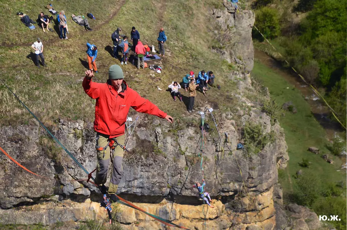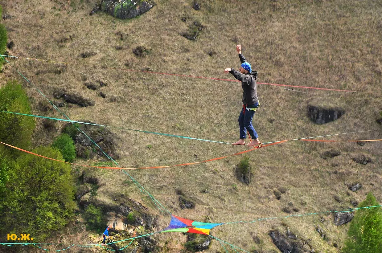В этом году стропы разной длины были сосредоточены в основном в одном месте, примерно в паре сотен метров от небольшой площади, окруженной палатками. Здесь играла музыка, жонглеры перебрасывались булавами, другие жонглировали цветными мячиками, прыгали на батуте… Но меня интересовал Хайлайн. На этот раз была натянута пятисотметровая стропа, она была ориентирована не перпендикулярно берегам каньона, а по диагонали. Вид на нее был интересен еще и благодаря роскошной и очень фотогеничной скалы, где и был закреплен один из концов стропы. На более коротких стропах всегда много народу. Здесь случается много срывов, падений, зависаний на страховках — для меня это интересно, успевай только ловить этот момент. Еще мне показалось, что на этот раз число тренированных ребят было меньше — наверное, это из-за двухлетнего ковидного перерыва. Зато природа здесь все также прекрасна.