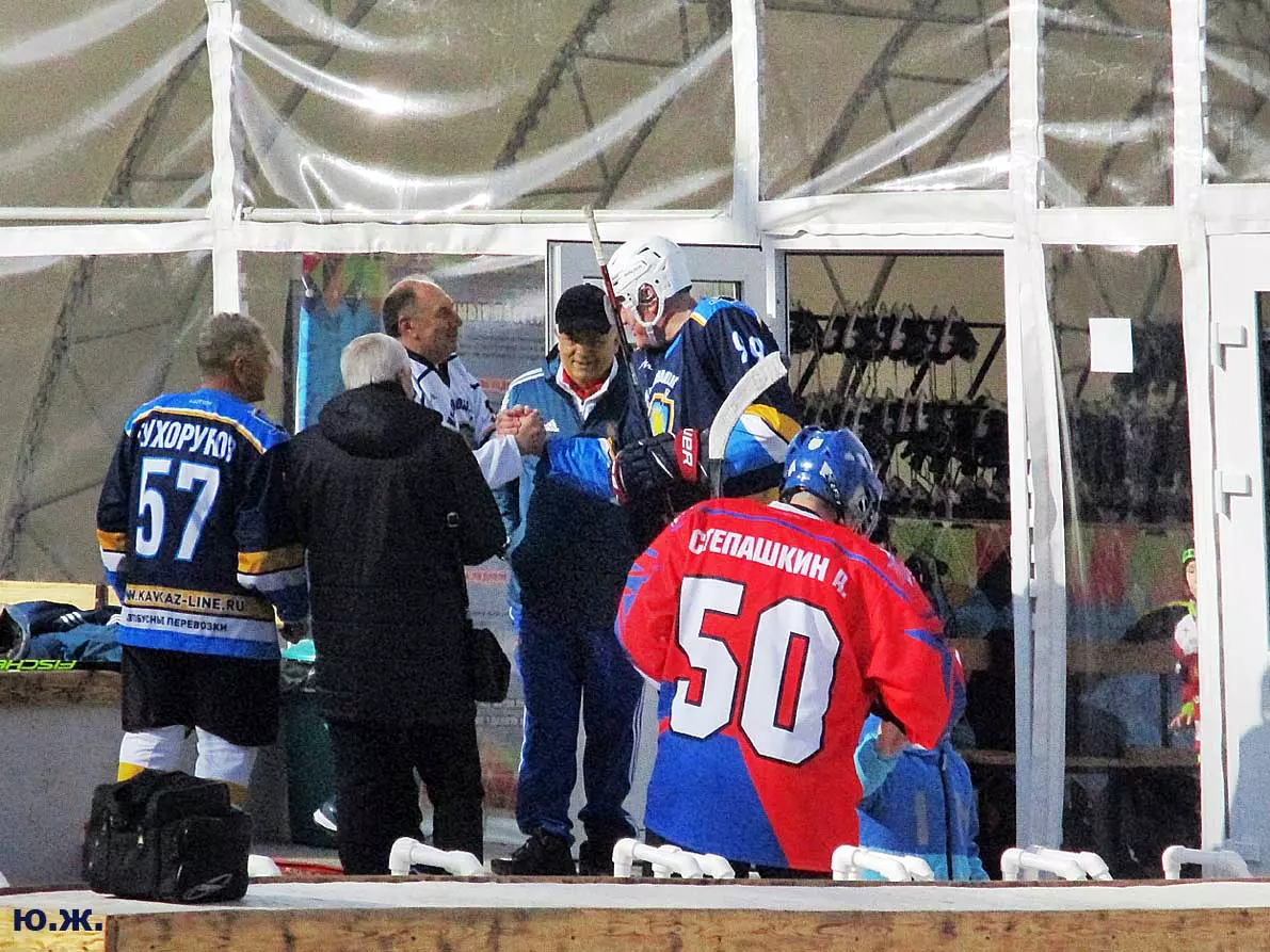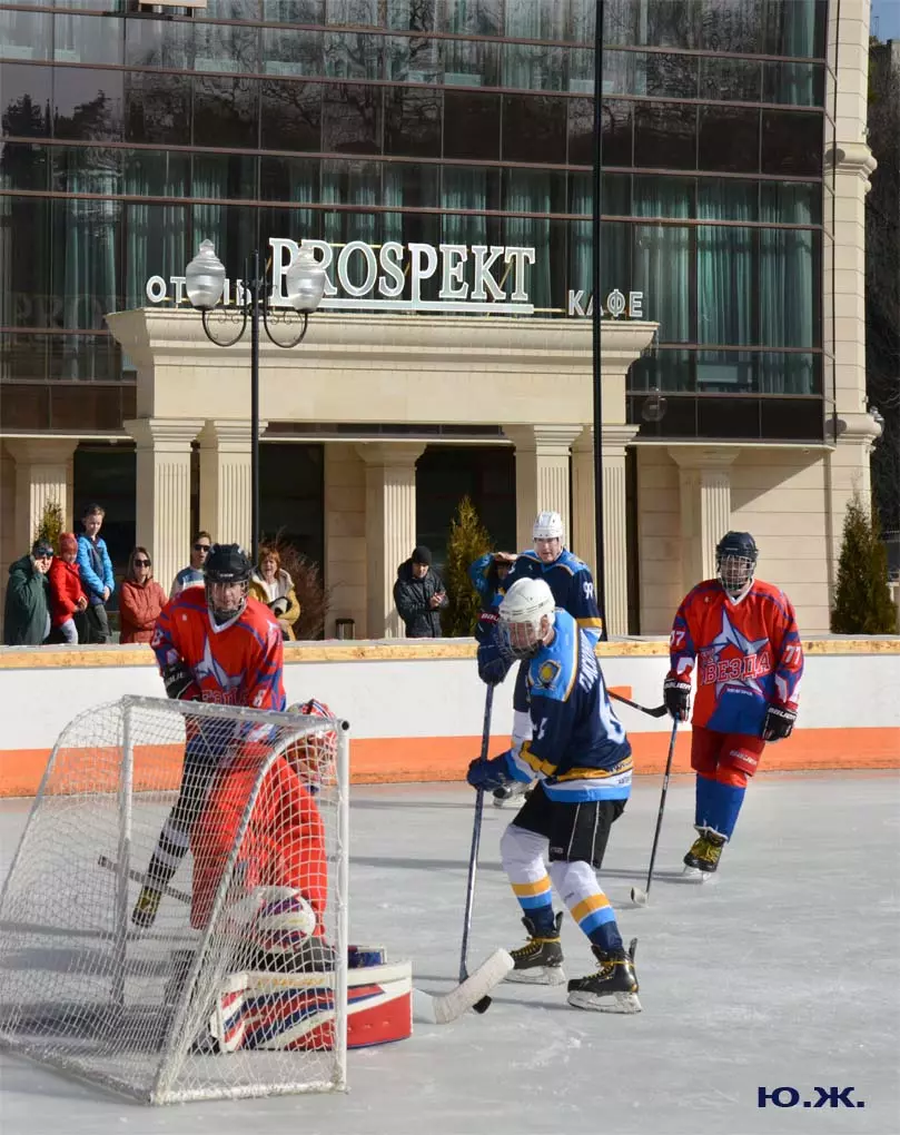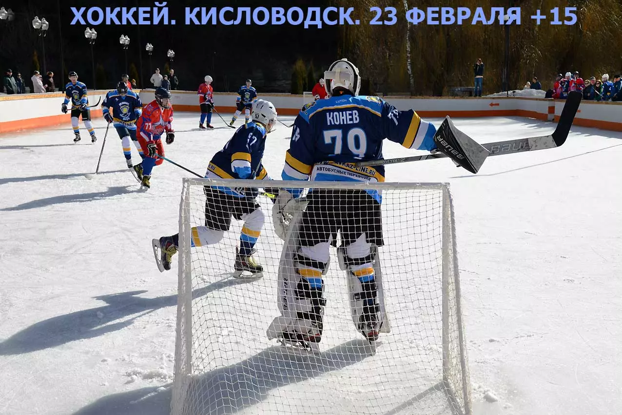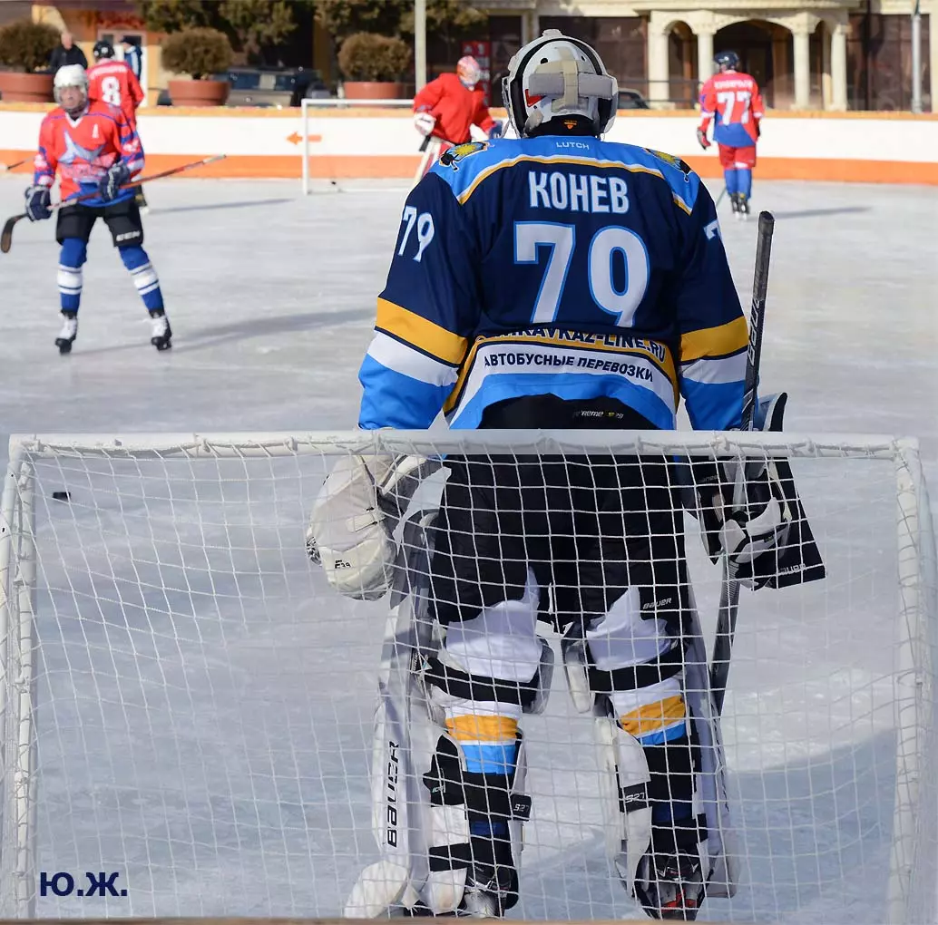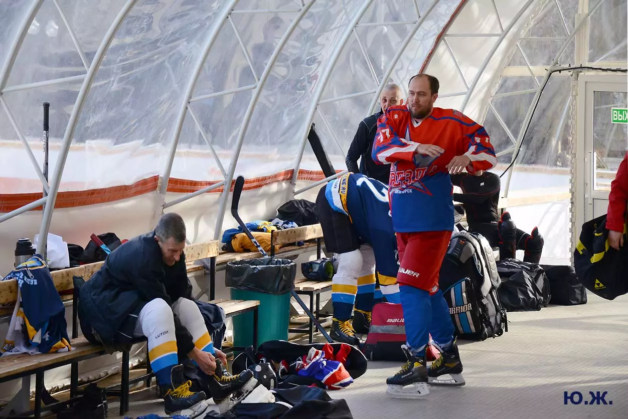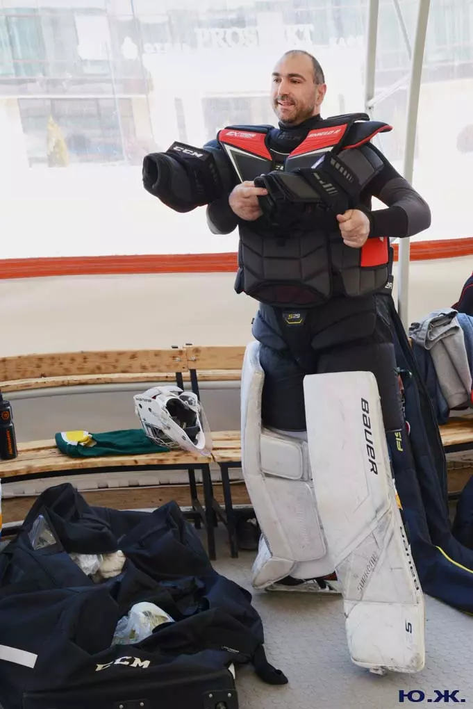 Перед матчем я довольно долго был с хоккеистами в раздевалке, смотрел и снимал как они облачаются в боевую форму. Это настоящий ритуал. Как же мужчина преображается, одевая свои мощные доспехи: от каски с прозрачным козырьком до разных защитных штучек, спускаясь с плеч до коньков, а вратари одеты еще круче. Это все было мне очень интересно особенно для съемок. Думаю у хоккеистов самая фотогеничная форма. В зале была очень теплая атмосфера, много шуток, даже в перерыве, когда ледяная машина приводила в порядок лед. Один хоккеист, поздравляя по телефону своего друга — как понимаю, далекого — с праздником, рассказывал, как они здесь, в Кисловодске, при 15-градусной температуре, на открытом воздухе, при ярком солнце и свежайшем воздухе, перебрасывая клюшкой шайбу, получают еще и истинное удовольствие от этого рая… Там, где сейчас находится его друг, может быть совсем другая температура.