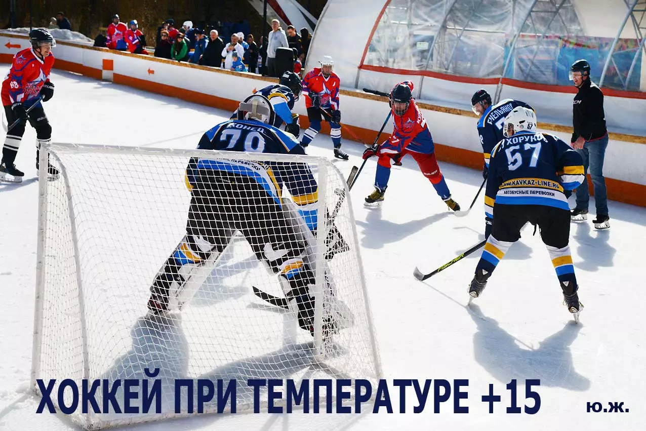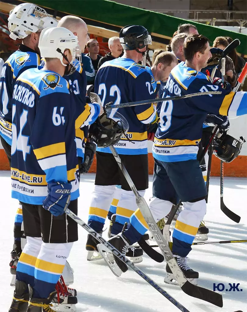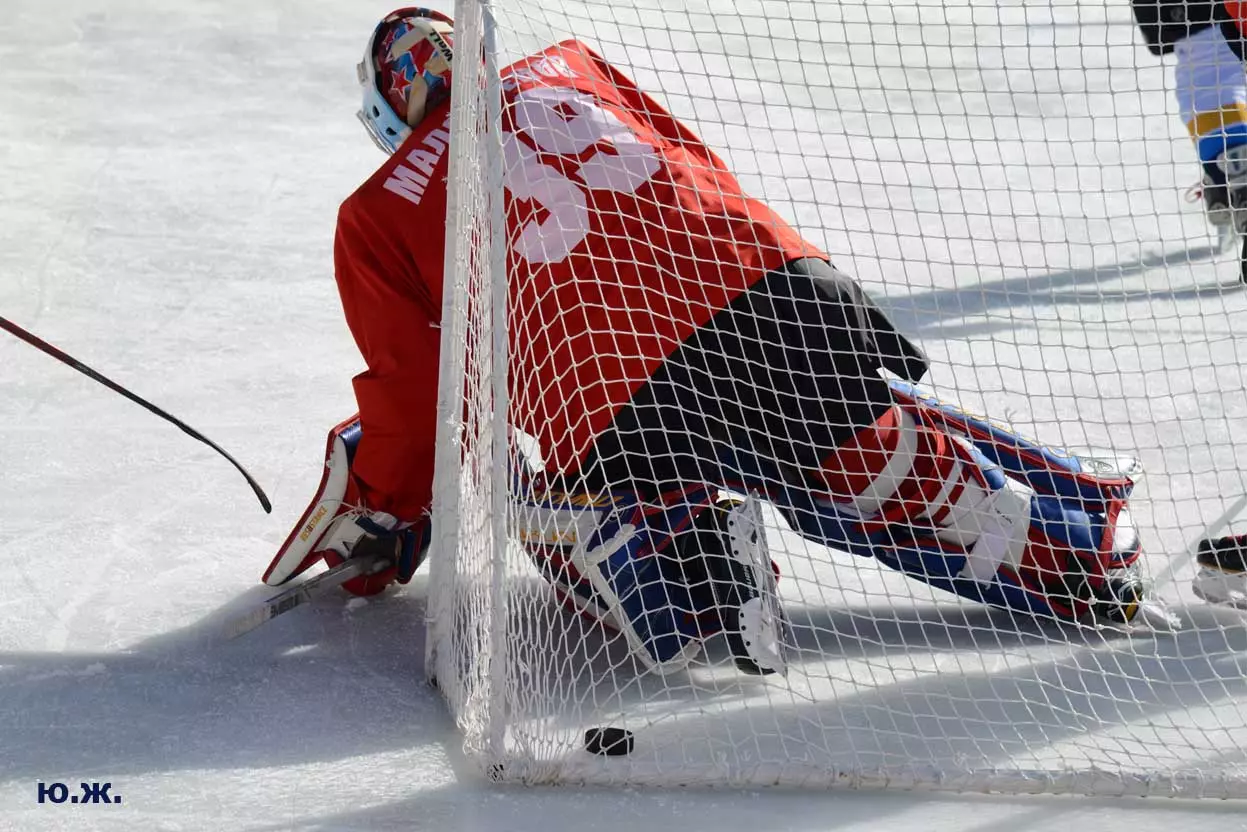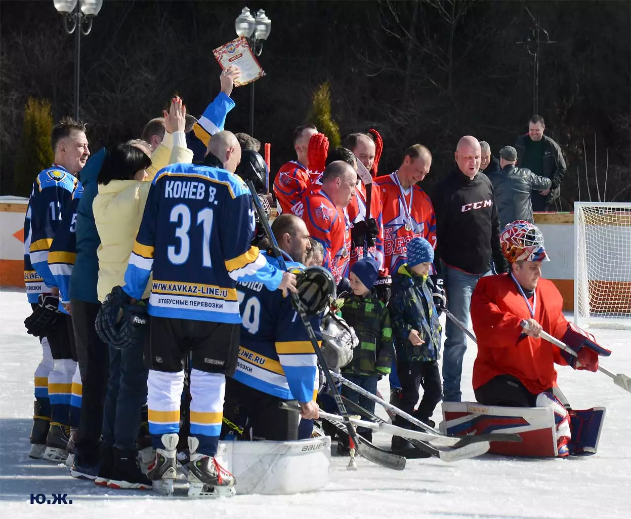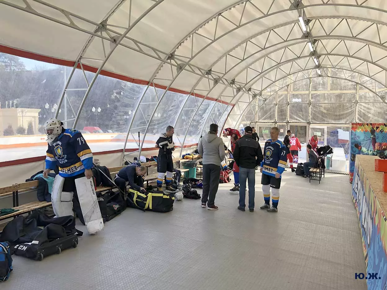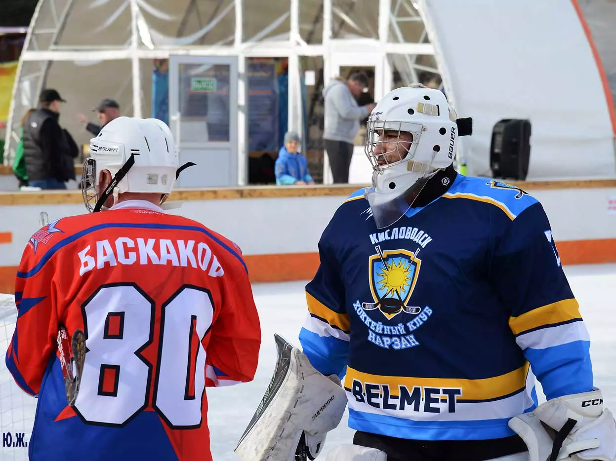 Перед матчем я довольно долго был с хоккеистами в раздевалке, смотрел и снимал как они облачаются в боевую форму. Это настоящий ритуал. Как же мужчина преображается, одевая свои мощные доспехи: от каски с прозрачным козырьком до разных защитных штучек, спускаясь с плеч до коньков, а вратари одеты еще круче. Это все было мне очень интересно особенно для съемок. Думаю у хоккеистов самая фотогеничная форма. В зале была очень теплая атмосфера, много шуток, даже в перерыве, когда ледяная машина приводила в порядок лед. Один хоккеист, поздравляя по телефону своего друга — как понимаю, далекого — с праздником, рассказывал, как они здесь, в Кисловодске, при 15-градусной температуре, на открытом воздухе, при ярком солнце и свежайшем воздухе, перебрасывая клюшкой шайбу, получают еще и истинное удовольствие от этого рая… Там, где сейчас находится его друг, может быть совсем другая температура.