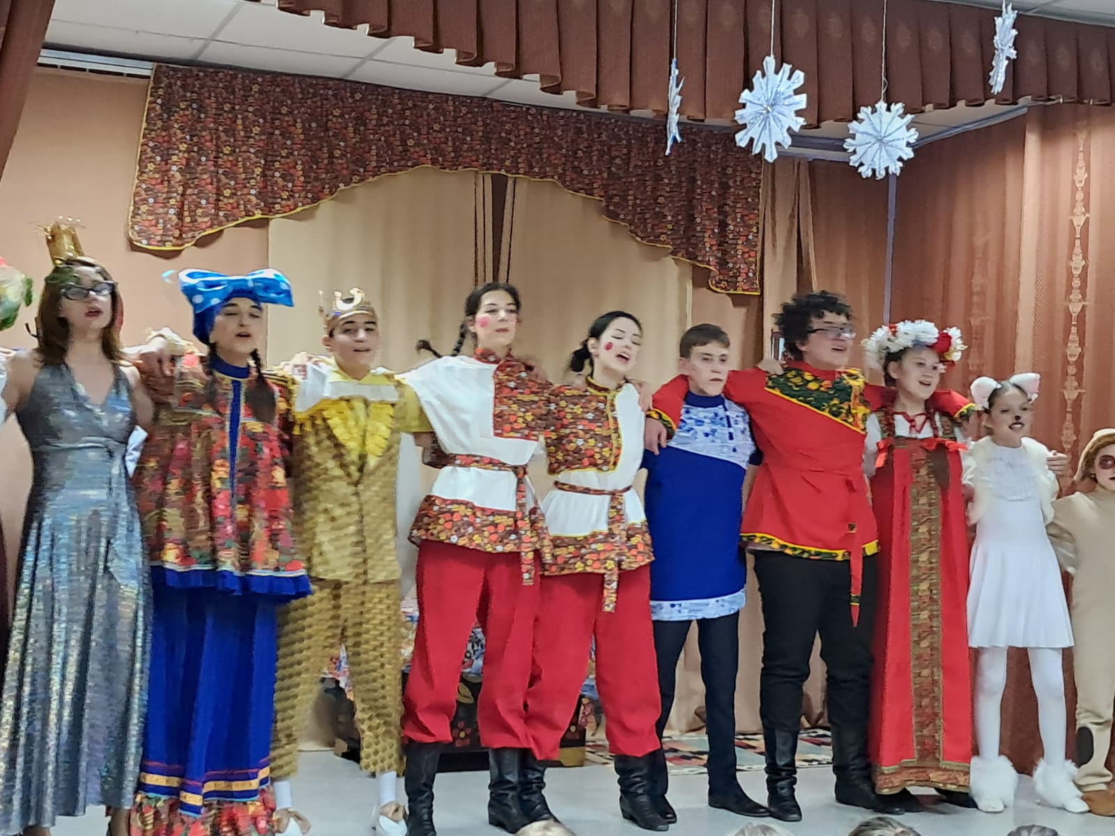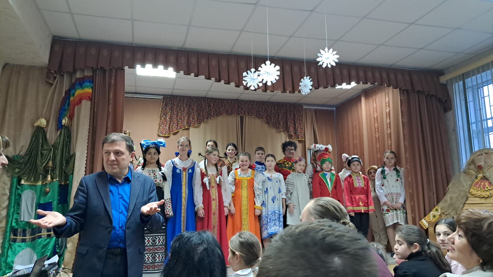 Общее одобрение в зале. Все артисты, а также их наставники встали крепко в ряд в одну общую неразрывную цепь, обнявшись, запели Рождественскую песню. Она звучала из уст каждого ребёнка, как рождественские колокольчики, звонко и одновременно очень нежно, западая глубоко в сердце каждому зрителю. Это было шедеврально! Спасибо всем, кто трудился над этой Сказкой-спектаклем, за ваш кропотливый труд и талант.
