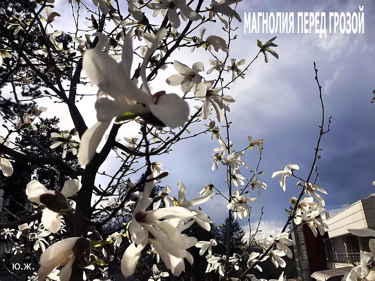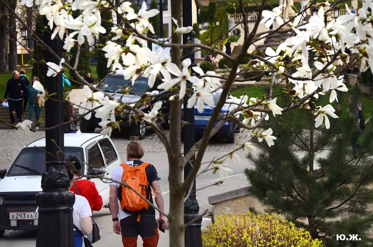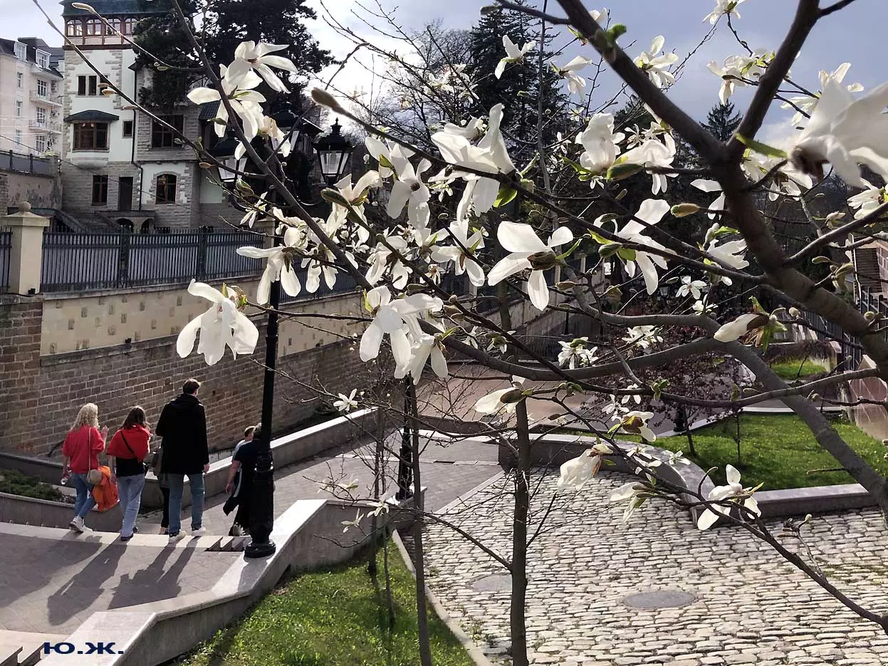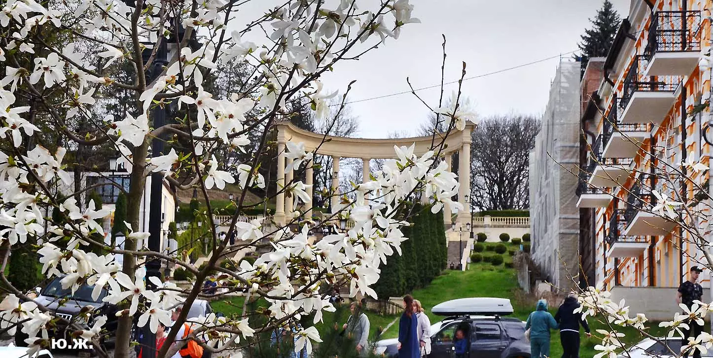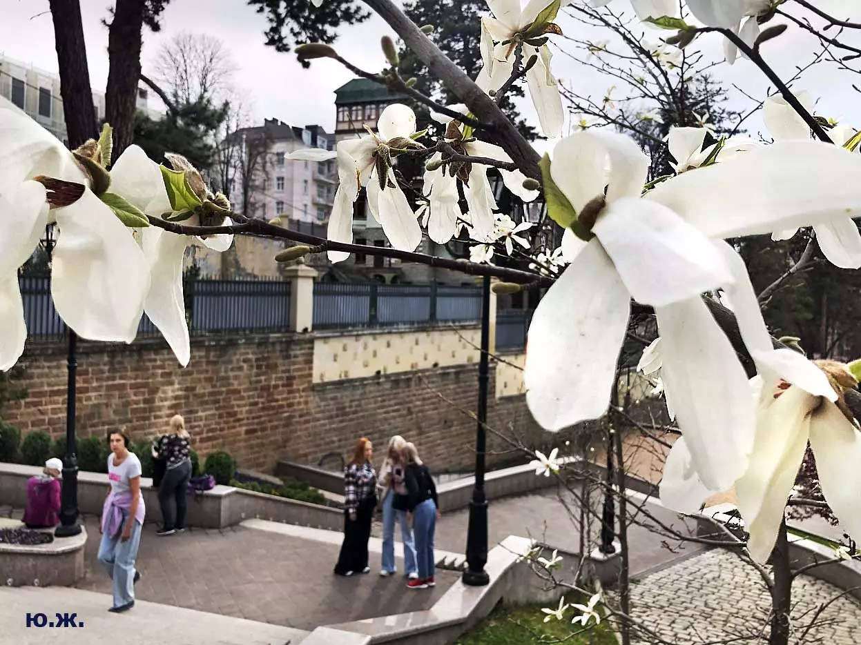Ну, вот, друзья, в Кисловодске снова зацвели магнолии. У нас они уже пятый год. В прошлом году цветения не было: думаем, они зимой промерзли. Тогда мы очень переживали. Сейчас все в порядке. Деревца заметно подросли, цветы крупные белоснежные, на одном из деревьев — красивого ярко фиолетового цвета. Много зрителей, в основном курортников. Они с удовольствием фотографируют и цветы, и себя любимых на их фоне. Отсюда Каскадная лестница, снятая сквозь них, кажется усыпанной белыми звездами. А главное — у нас весна и цветут Магнолии.