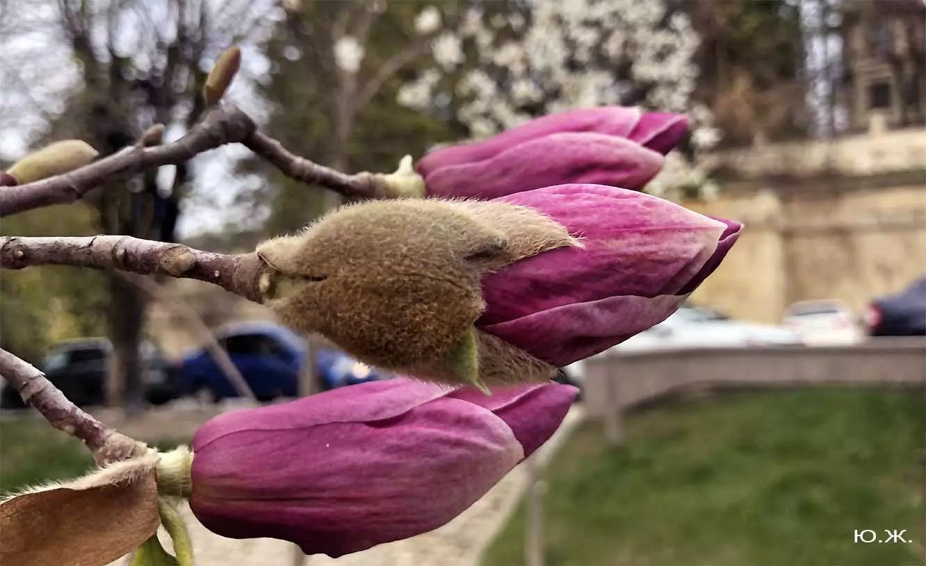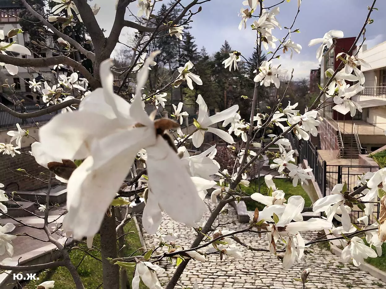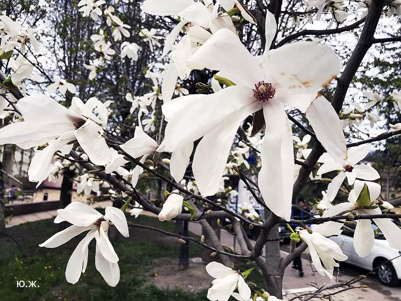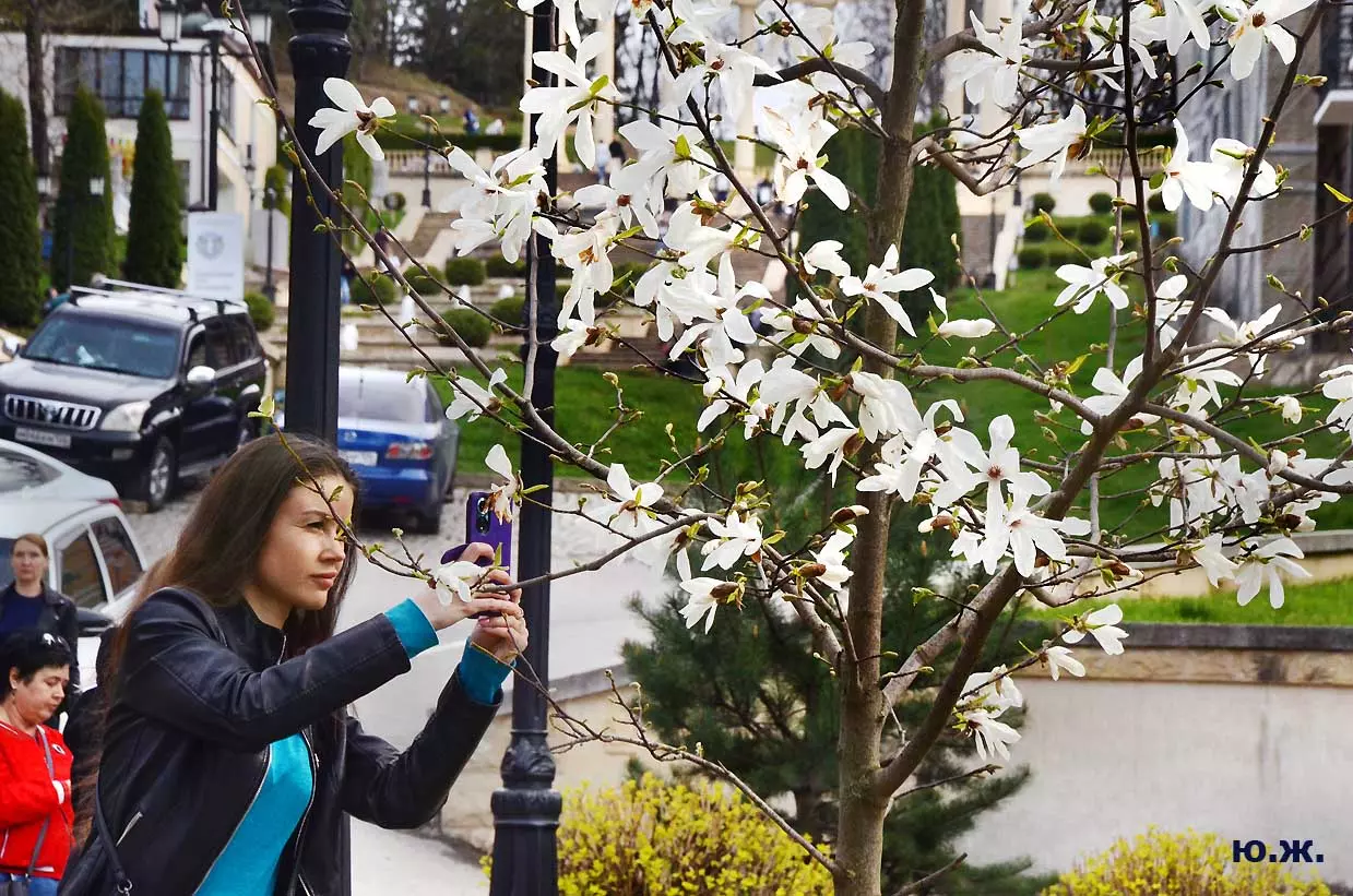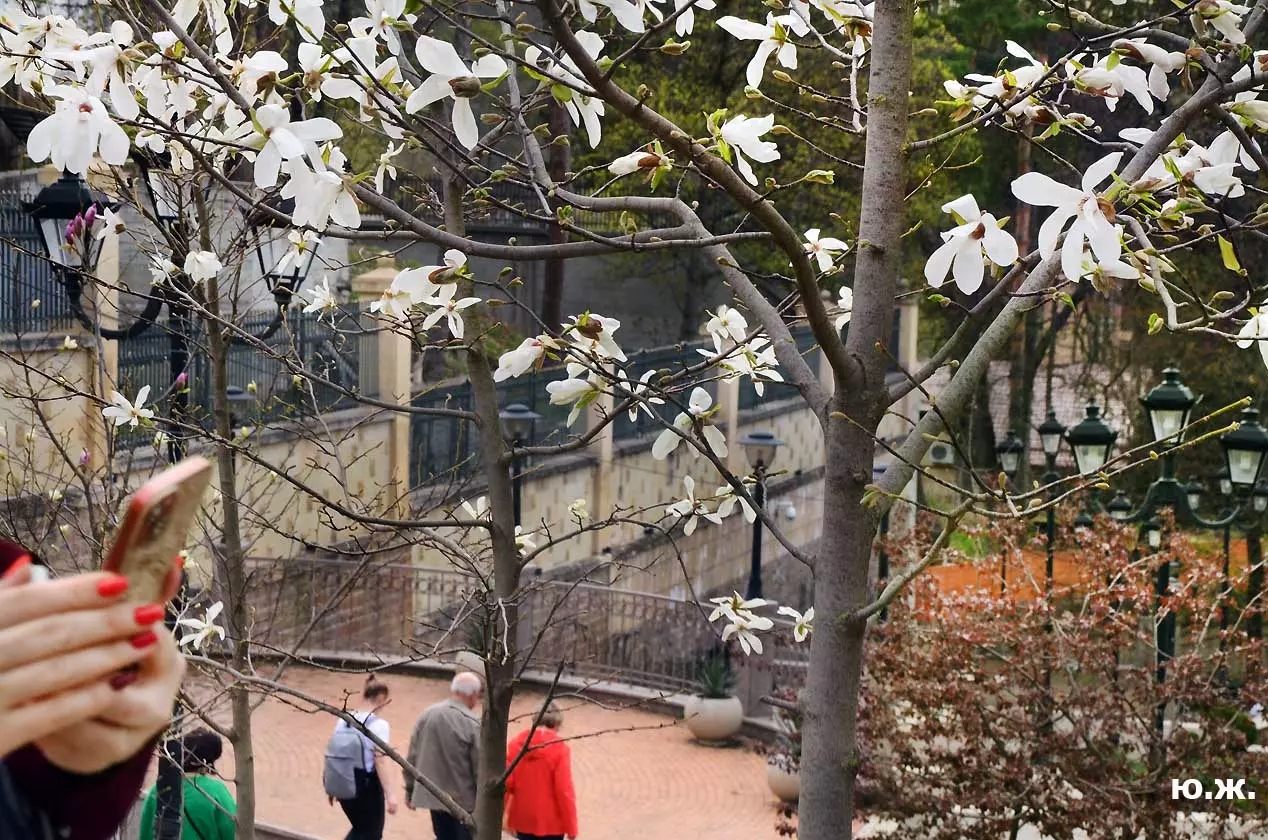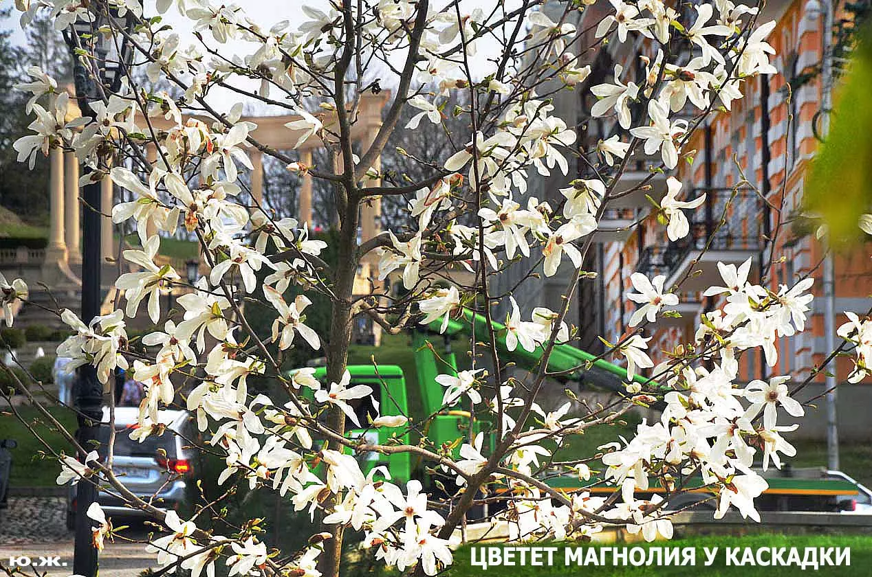 Ну, вот, друзья, в Кисловодске снова зацвели магнолии. У нас они уже пятый год. В прошлом году цветения не было: думаем, они зимой промерзли. Тогда мы очень переживали. Сейчас все в порядке. Деревца заметно подросли, цветы крупные белоснежные, на одном из деревьев — красивого ярко фиолетового цвета. Много зрителей, в основном курортников. Они с удовольствием фотографируют и цветы, и себя любимых на их фоне. Отсюда Каскадная лестница, снятая сквозь них, кажется усыпанной белыми звездами. А главное — у нас весна и цветут Магнолии.