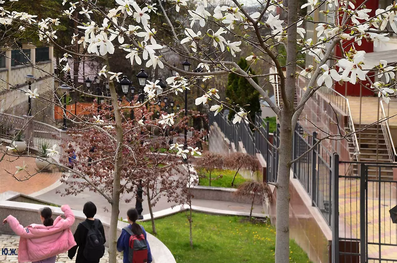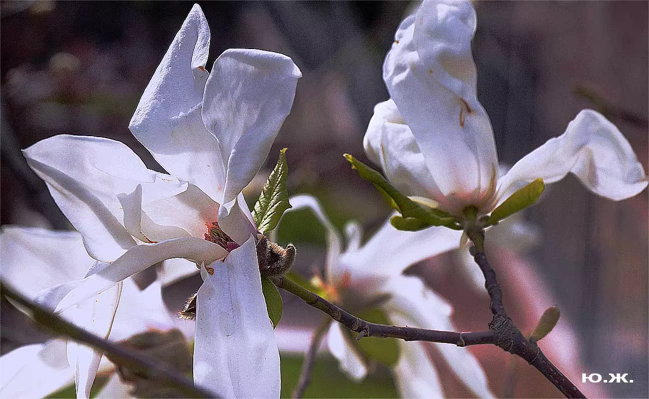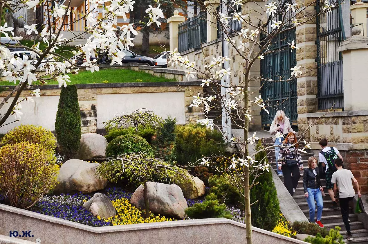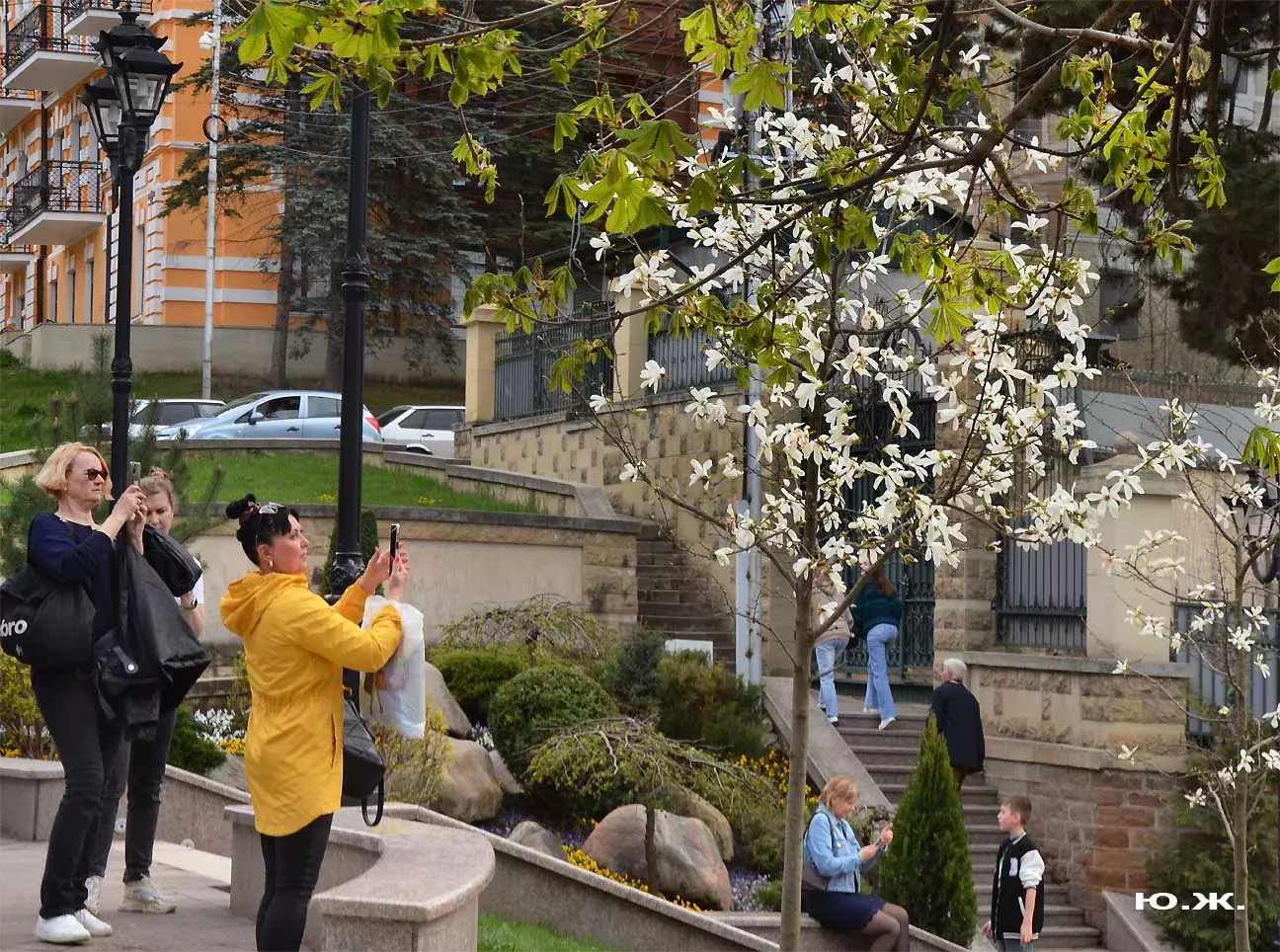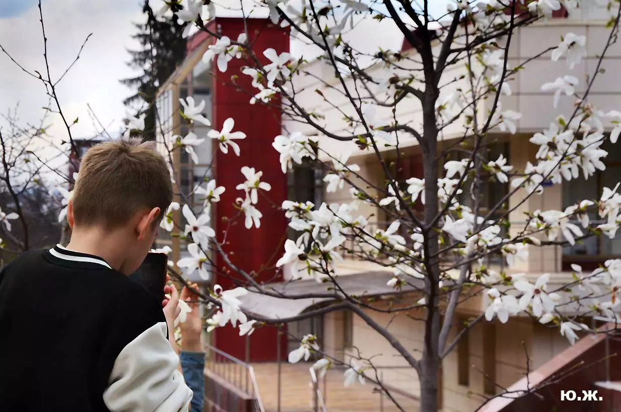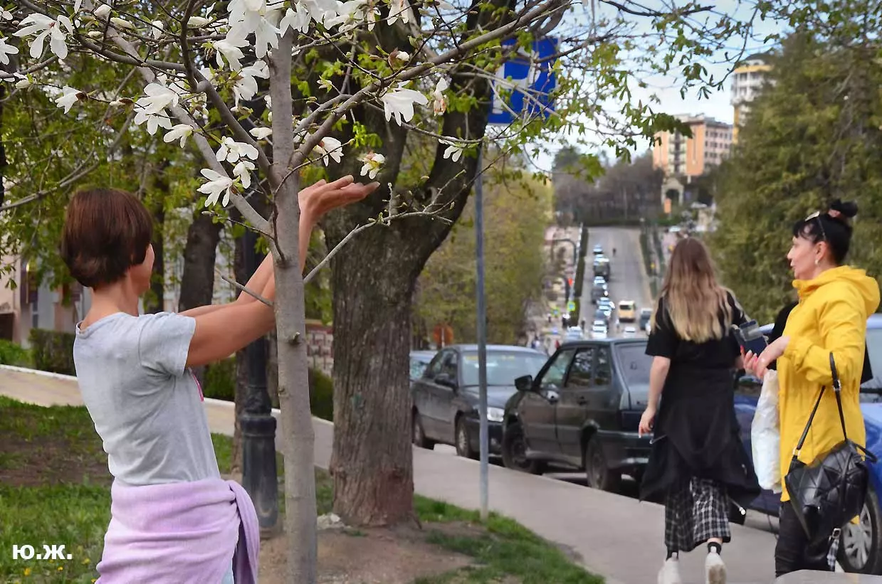 Ну, вот, друзья, в Кисловодске снова зацвели магнолии. У нас они уже пятый год. В прошлом году цветения не было: думаем, они зимой промерзли. Тогда мы очень переживали. Сейчас все в порядке. Деревца заметно подросли, цветы крупные белоснежные, на одном из деревьев — красивого ярко фиолетового цвета. Много зрителей, в основном курортников. Они с удовольствием фотографируют и цветы, и себя любимых на их фоне. Отсюда Каскадная лестница, снятая сквозь них, кажется усыпанной белыми звездами. А главное — у нас весна и цветут Магнолии.