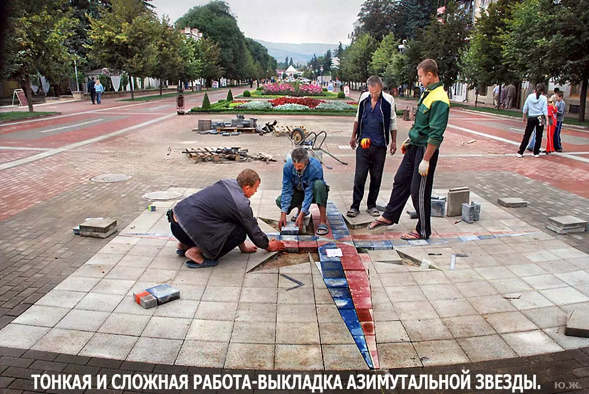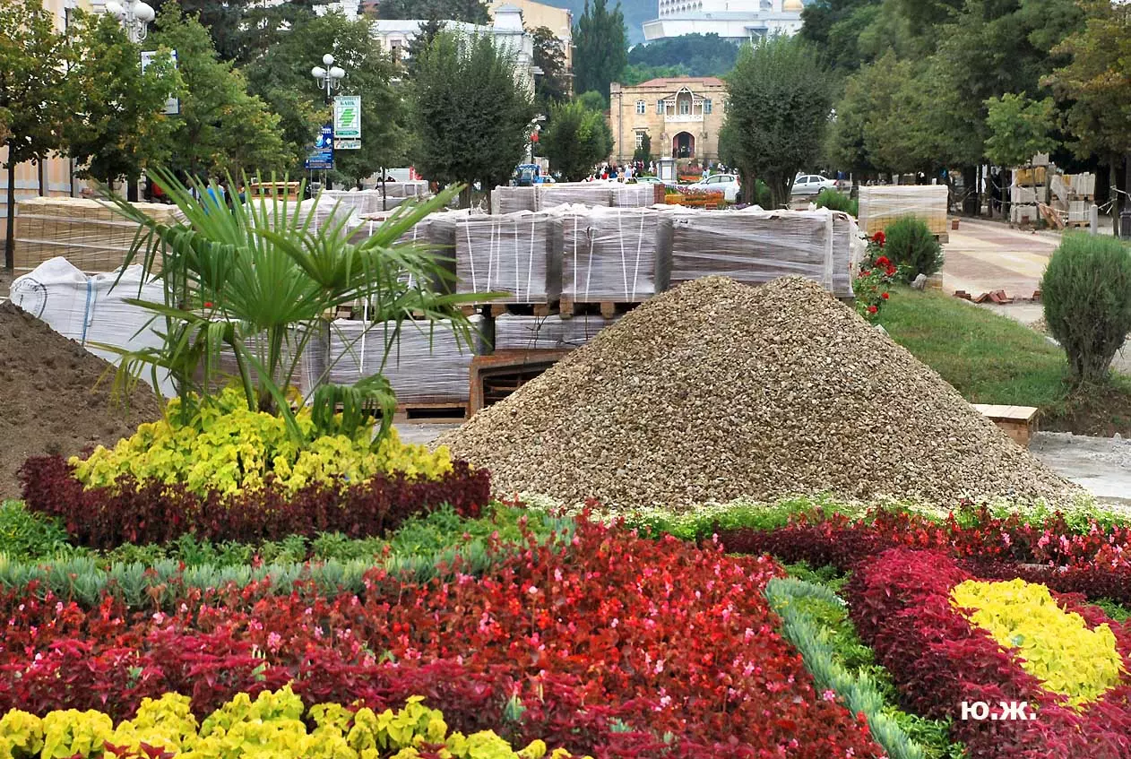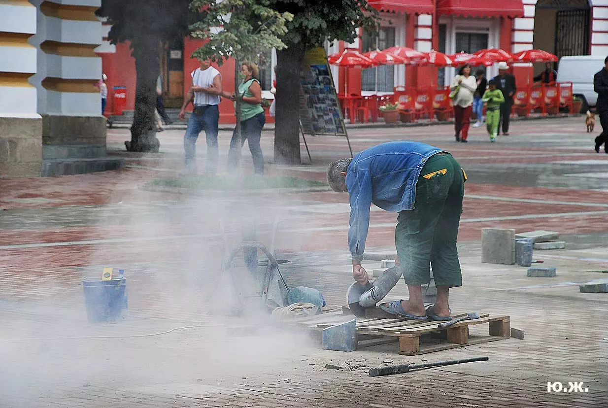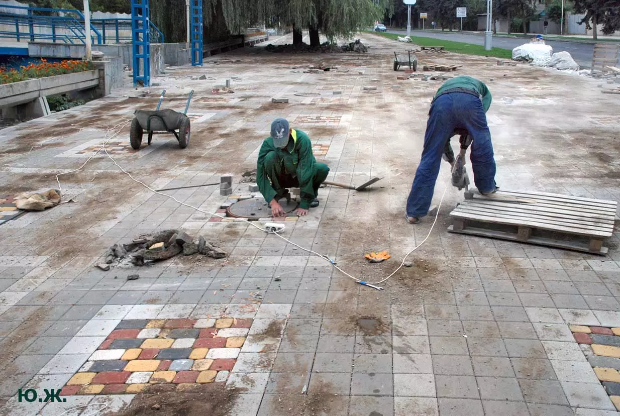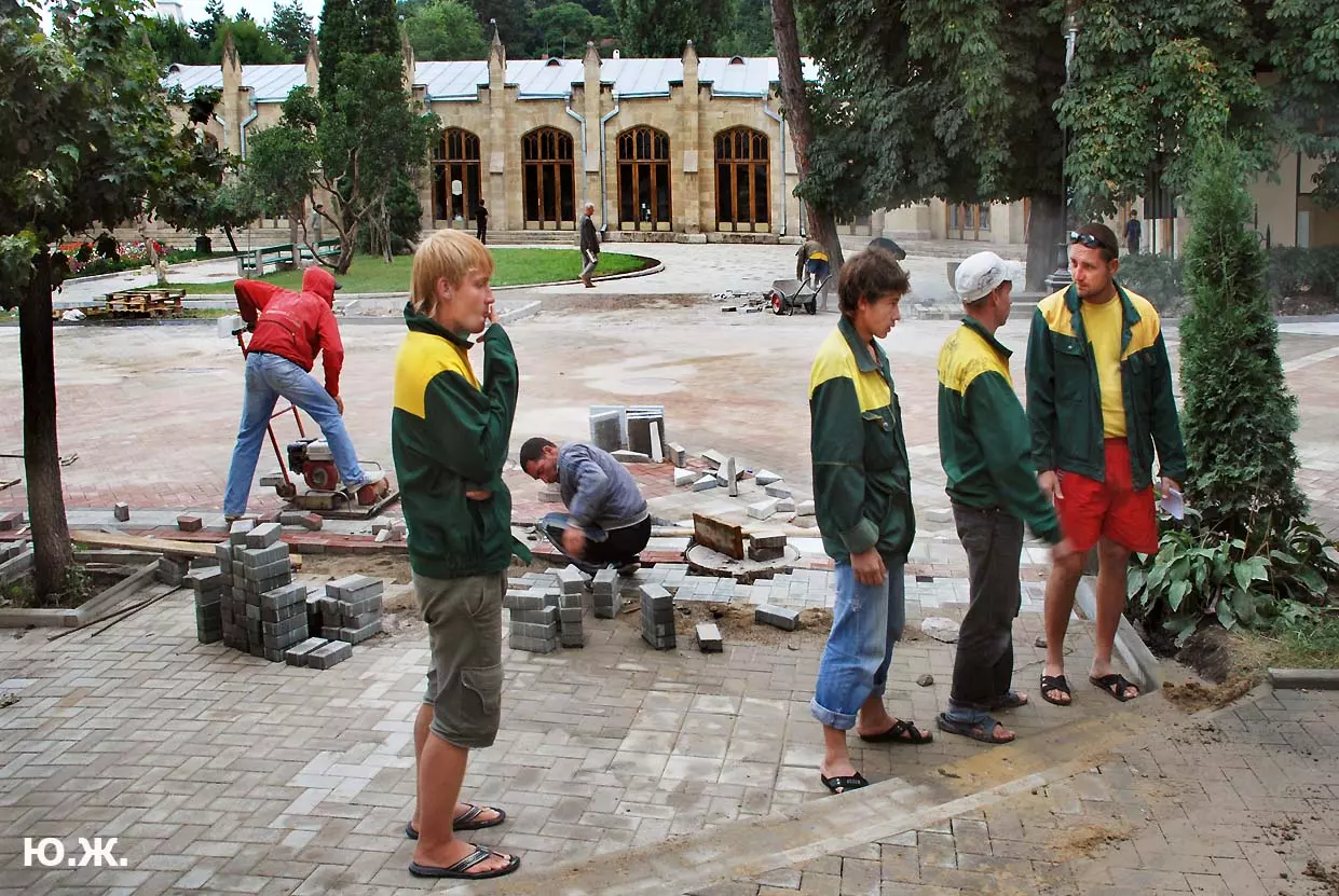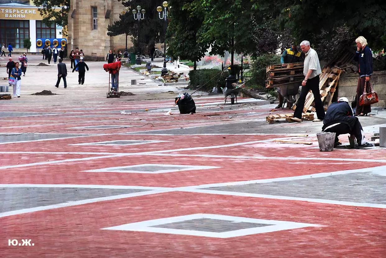 Тем временем в Кисловодске работы в разгаре, как в разгаре и курортный сезон. Это продолжается не один месяц, отдыхающие научились ловко лавировать между препятствиями и уворачиваться от искр и пыли «болгарок», режущих камень. А желто-зеленые комбинезоны в летнюю жару оказались неудобными и постепенно заменялись на майки и т.п.