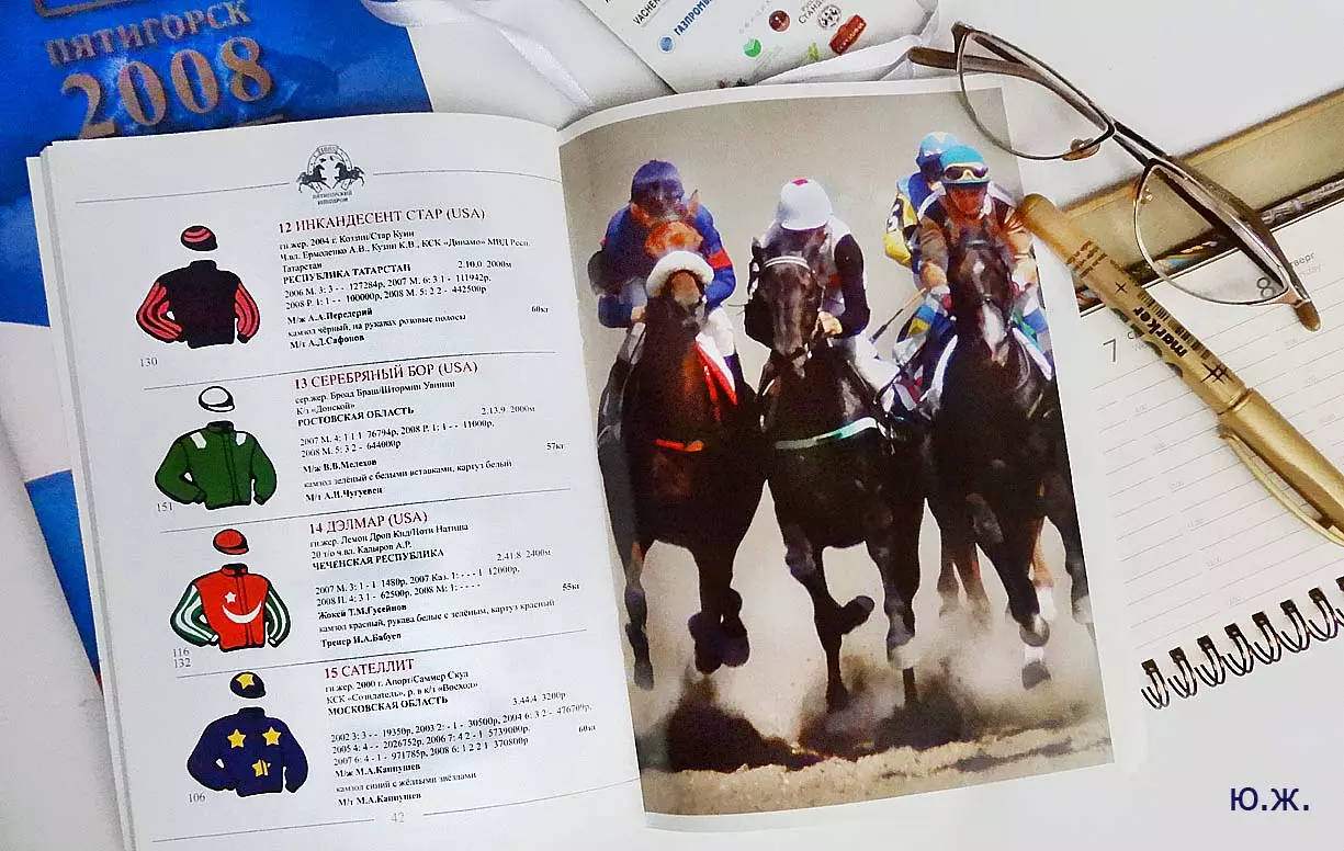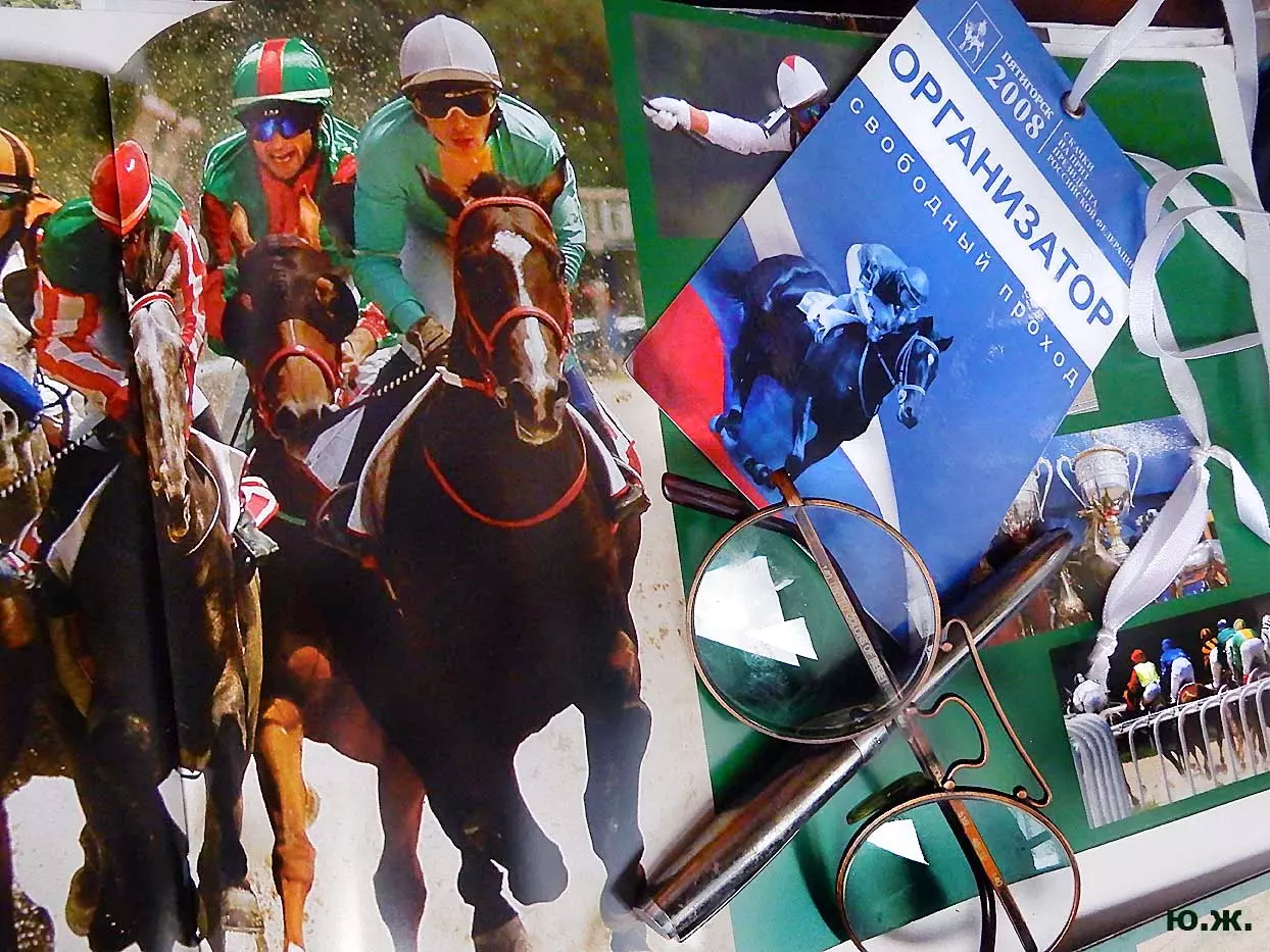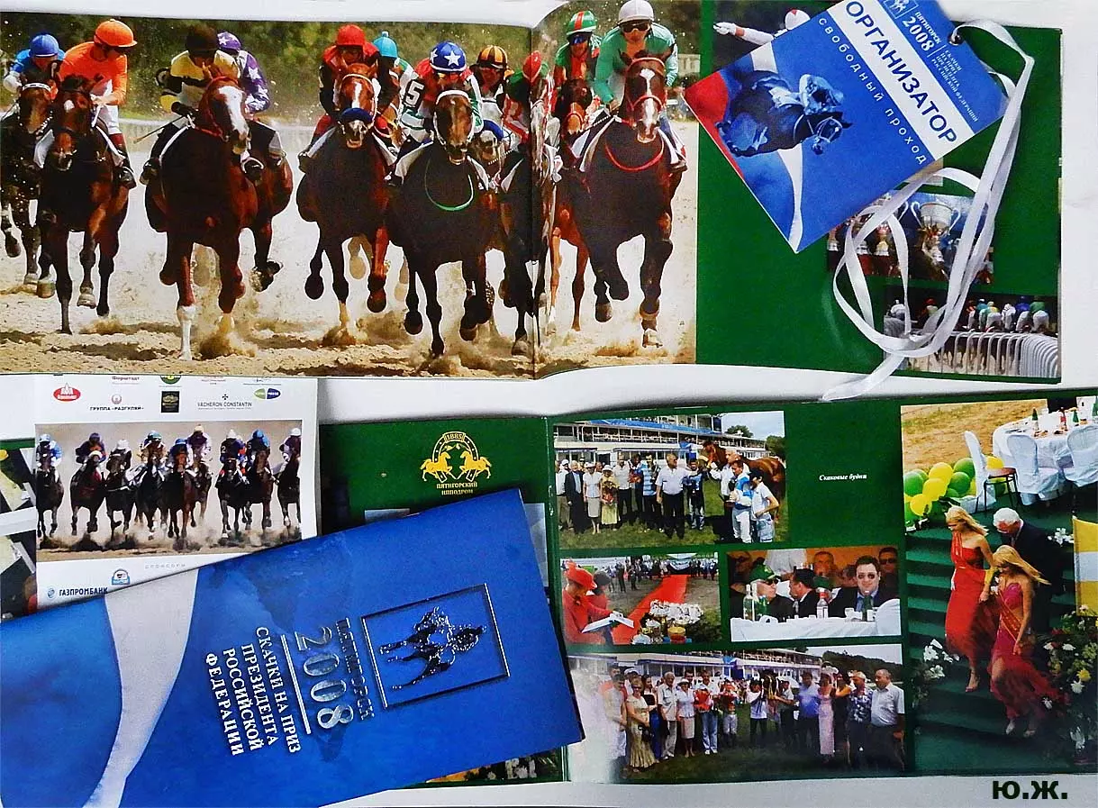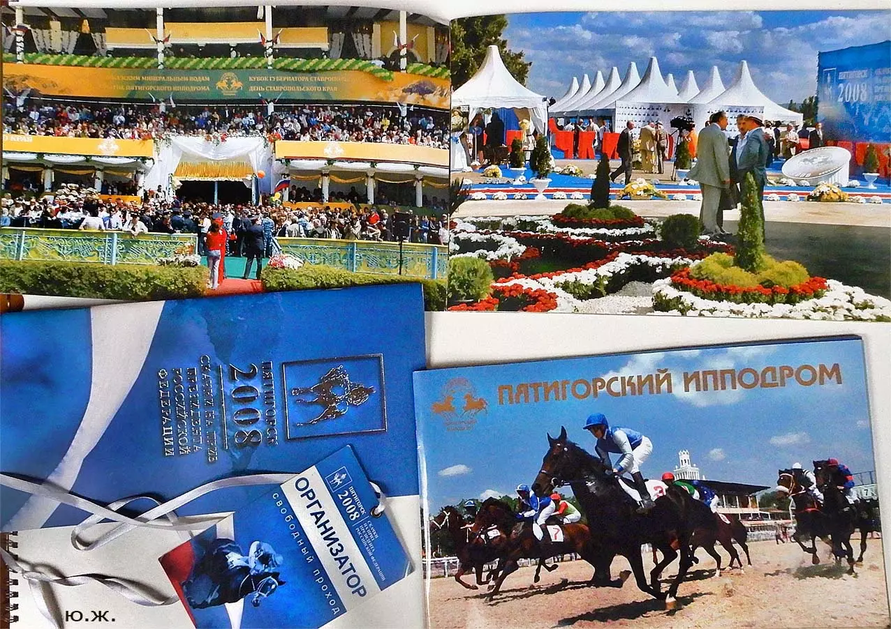 В августе в Пятигорск прибывают московские дизайнеры для более тонких работ. Они устанавливают белоснежные шатры для VIP персон, подвозят сотни огромных керамических ваз с цветами, расстилают ковровые дорожки между шатрами, обвивают цветами ложи верхних трибун… Ко мне обратились из оргкомитета принять участие в подготовке рекламной продукции -буклетов, проспектов, каталогов програмок скачек, а также отобрать снимки скачек для слайд-шоу на больших экранах расположенных перед трибунами. Был издан и мой проспект Ипподрома.. (на фото). В конце августа начались репетиции участников средневековых конных баталий, жокеи тренировали скакунов, юношам, выводящим лошадей, пошили красивые костюмы, у них также шли тренировки.