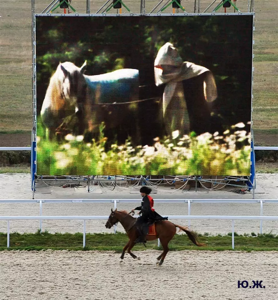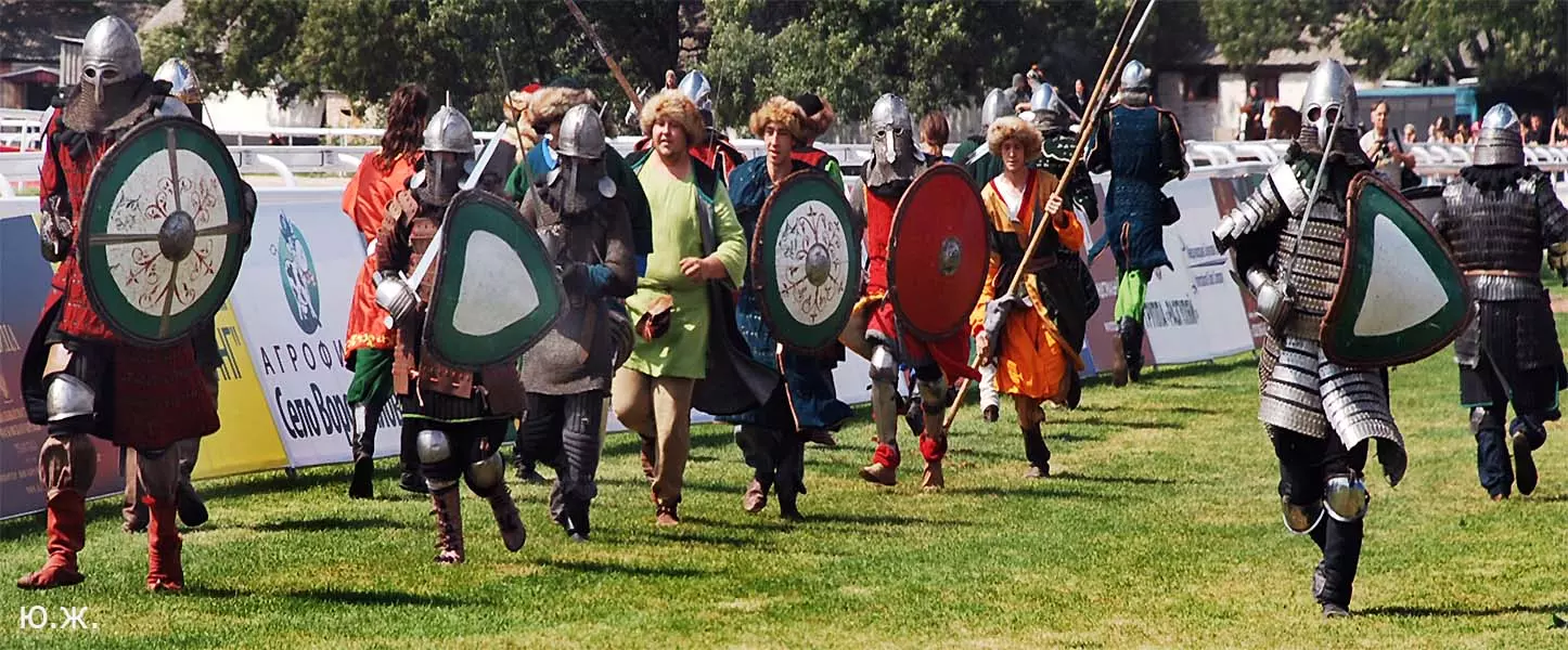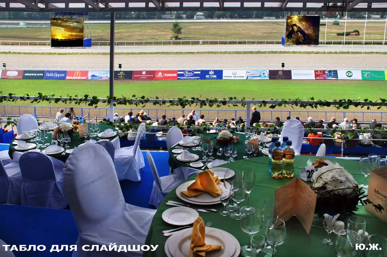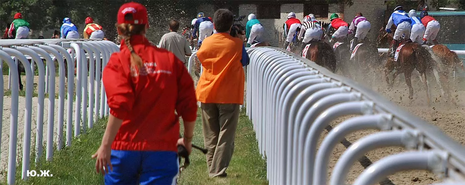 В августе в Пятигорск прибывают московские дизайнеры для более тонких работ. Они устанавливают белоснежные шатры для VIP персон, подвозят сотни огромных керамических ваз с цветами, расстилают ковровые дорожки между шатрами, обвивают цветами ложи верхних трибун… Ко мне обратились из оргкомитета принять участие в подготовке рекламной продукции -буклетов, проспектов, каталогов програмок скачек, а также отобрать снимки скачек для слайд-шоу на больших экранах расположенных перед трибунами. Был издан и мой проспект Ипподрома.. (на фото). В конце августа начались репетиции участников средневековых конных баталий, жокеи тренировали скакунов, юношам, выводящим лошадей, пошили красивые костюмы, у них также шли тренировки.