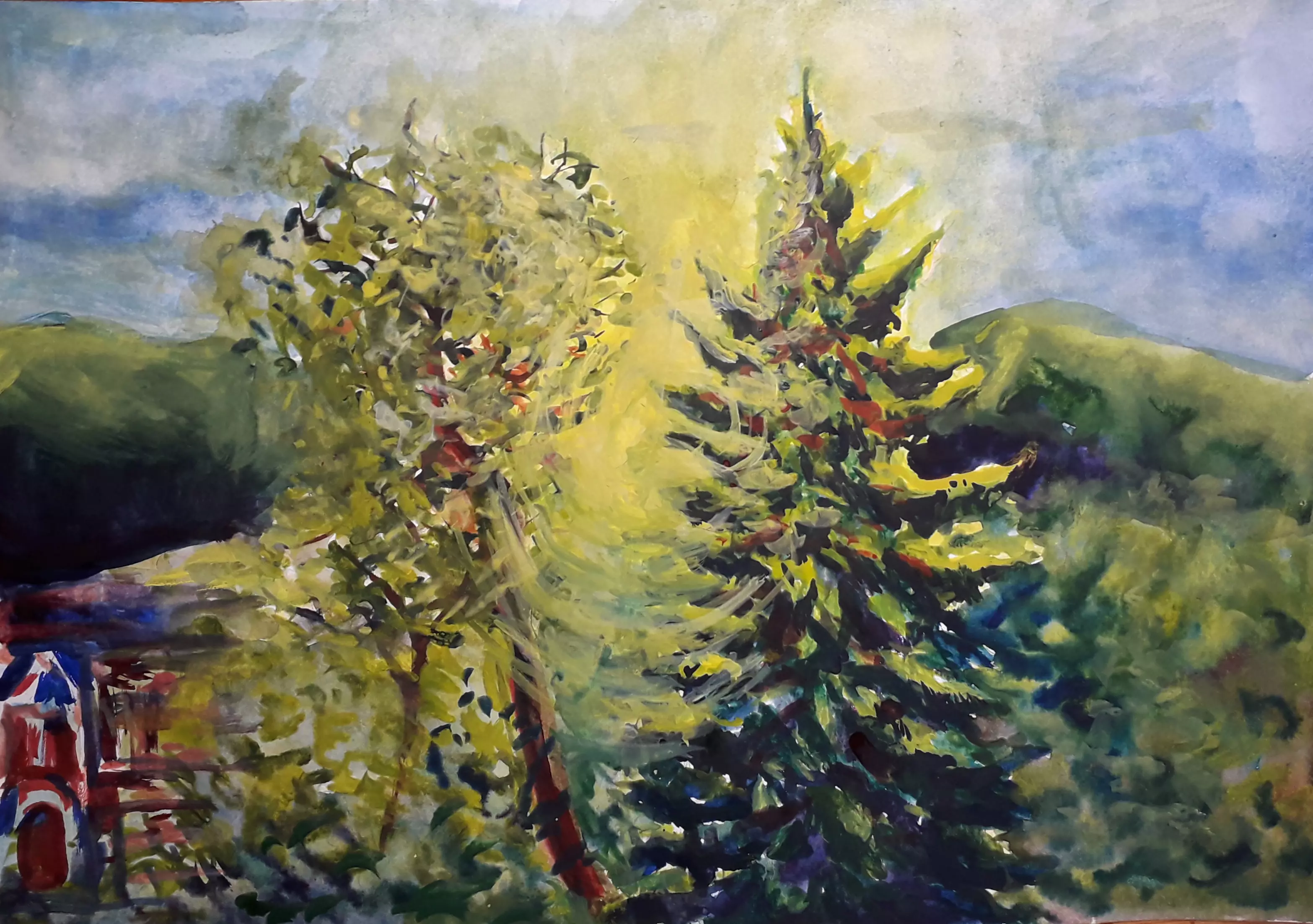 Гроза утихала, и дождь перешел с галопа на спокойный шаг. И вот уже опять крупные капли дождя стали барабанить свой марш. Под марш вышло из-за туч солнце. И опять дитя солнца, радуга, украсила небосклон. На этот раз она была двойной. И она была еще ярче, чем предыдущая, как будто, она хорошо «отмылась» во время грозы.