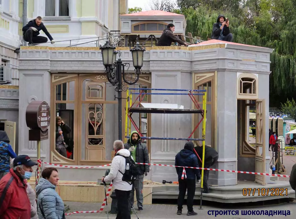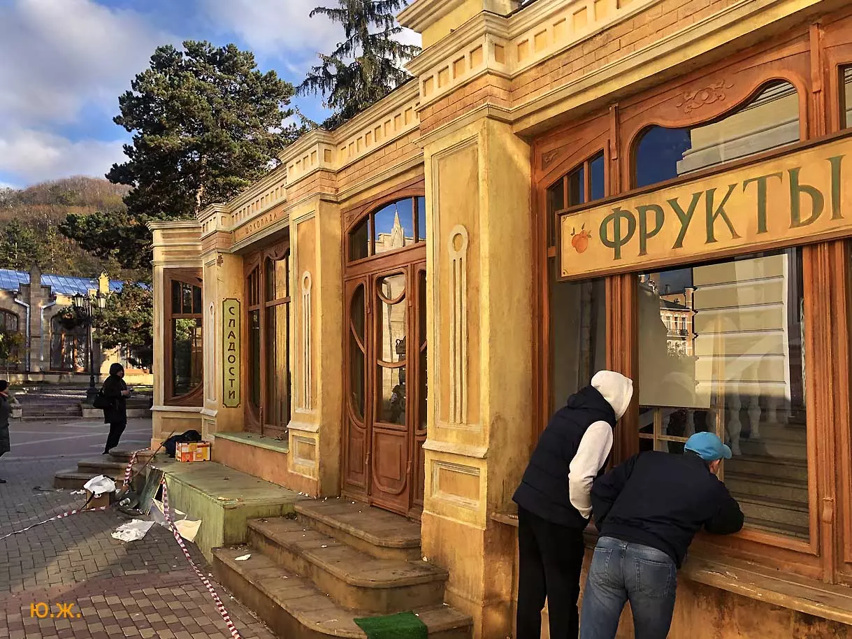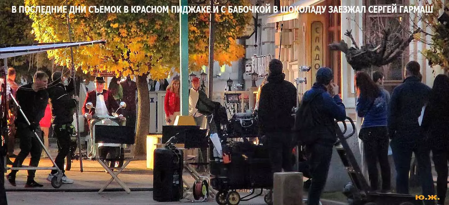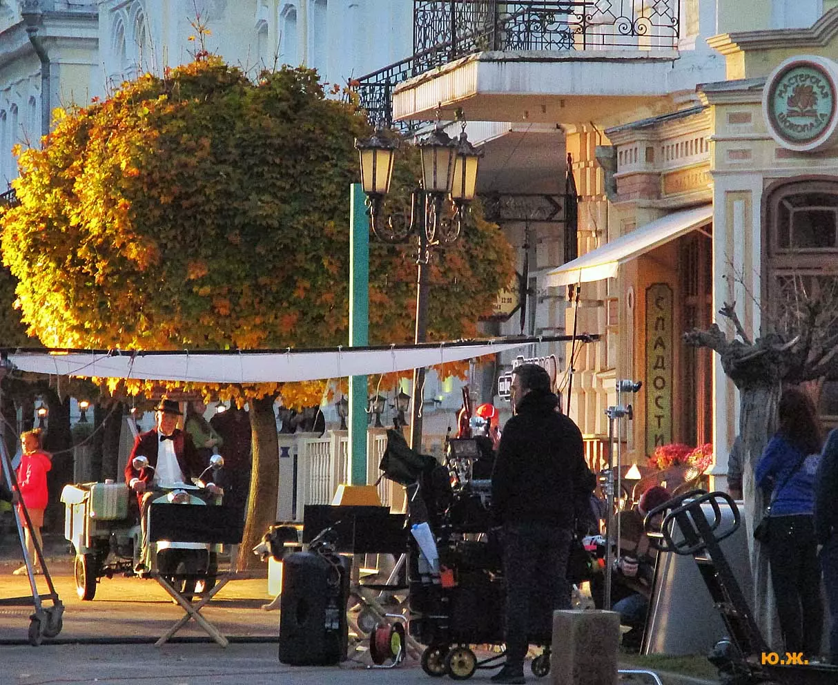 Я же направлялся на Курортный Бульвар, 22, что находился в 30-40 метрах от главной съемочной площадки. Прибывшая из Москвы в начале октября довольно большая техническая киногруппа строила с нуля симпатичное здание кафе «Шоколадница». Строение быстро росло, дизайнеры подкрашивали стекла витражей, тут же вставляя их в рамы в стиле модерн. Это соответствовало стилистике зданий в Кисловодске. На маленьком пространстве мастера вырезали, выпиливали на расставленных здесь же замысловатых машинах деревянные детали, уже в интерьере выстилали пол привезенным роскошным кафелем. (См. фото: на кафеле стоят громадные круглые коробки-муляжи с раскрашенными или искусно разрисованными тортами, которые выглядели лучше настоящих). Самое интересное заключается в том, что художники-дизайнеры придирчиво «старили» это здание. Оно было возведено за три недели, завершено — за два дня до окончания съемок. В народе его прозвали «Дом Чебурашки».