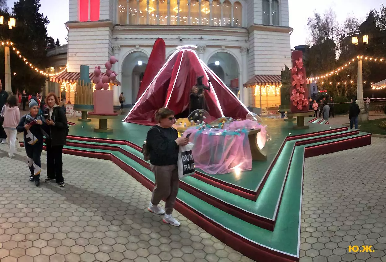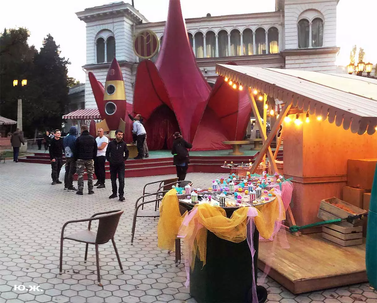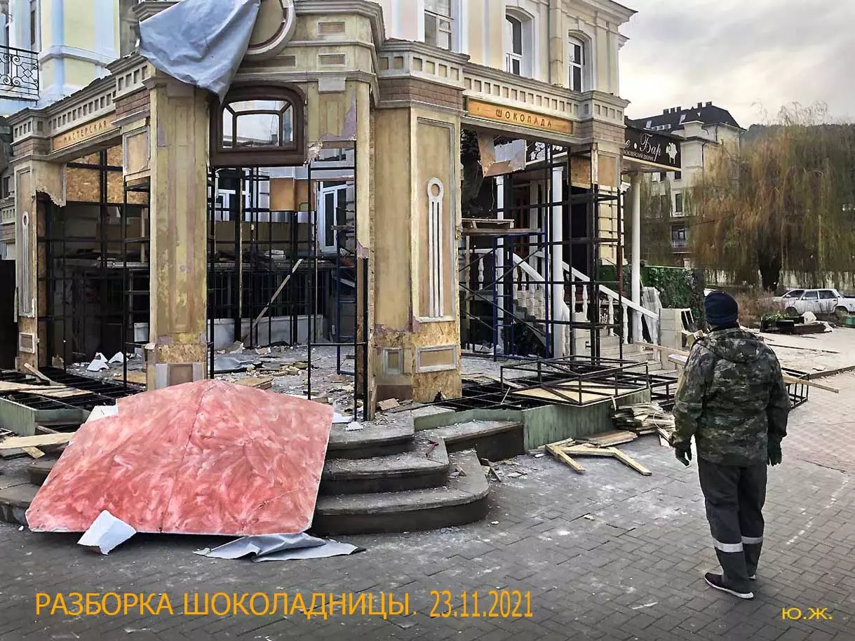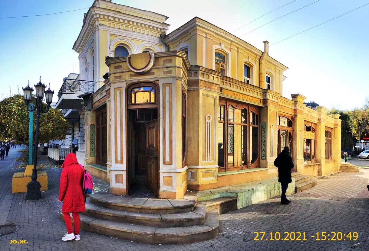 Я же направлялся на Курортный Бульвар, 22, что находился в 30-40 метрах от главной съемочной площадки. Прибывшая из Москвы в начале октября довольно большая техническая киногруппа строила с нуля симпатичное здание кафе «Шоколадница». Строение быстро росло, дизайнеры подкрашивали стекла витражей, тут же вставляя их в рамы в стиле модерн. Это соответствовало стилистике зданий в Кисловодске. На маленьком пространстве мастера вырезали, выпиливали на расставленных здесь же замысловатых машинах деревянные детали, уже в интерьере выстилали пол привезенным роскошным кафелем. (См. фото: на кафеле стоят громадные круглые коробки-муляжи с раскрашенными или искусно разрисованными тортами, которые выглядели лучше настоящих). Самое интересное заключается в том, что художники-дизайнеры придирчиво «старили» это здание. Оно было возведено за три недели, завершено — за два дня до окончания съемок. В народе его прозвали «Дом Чебурашки».