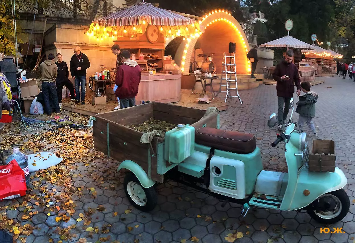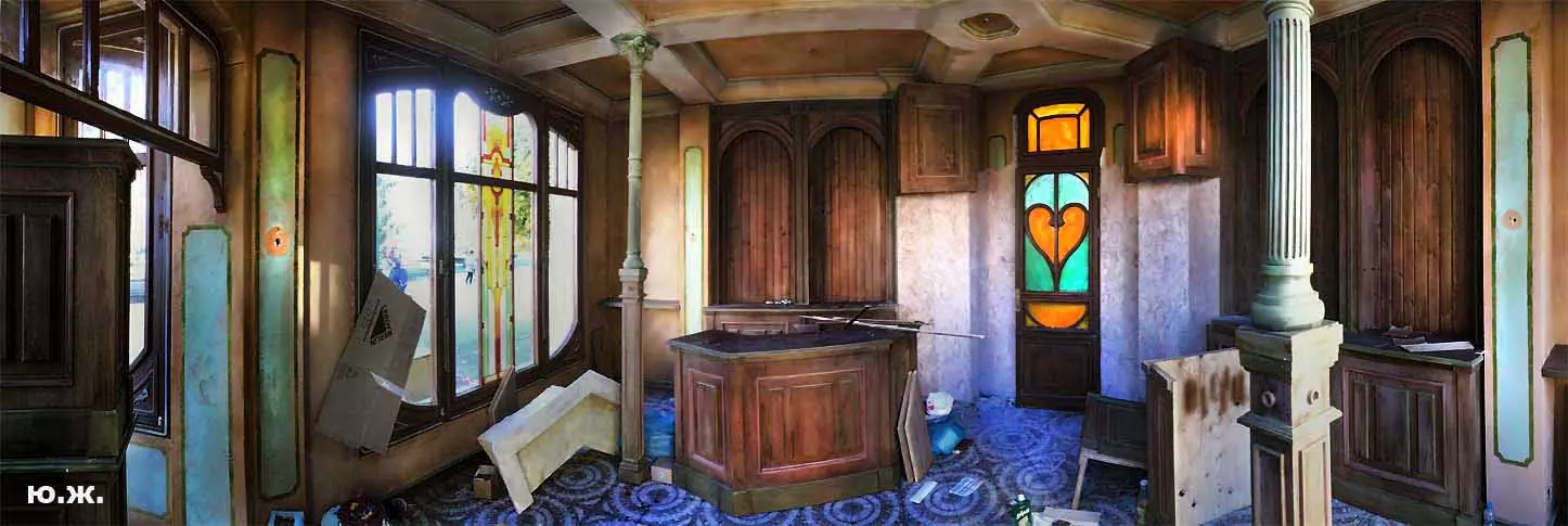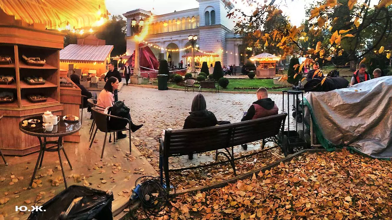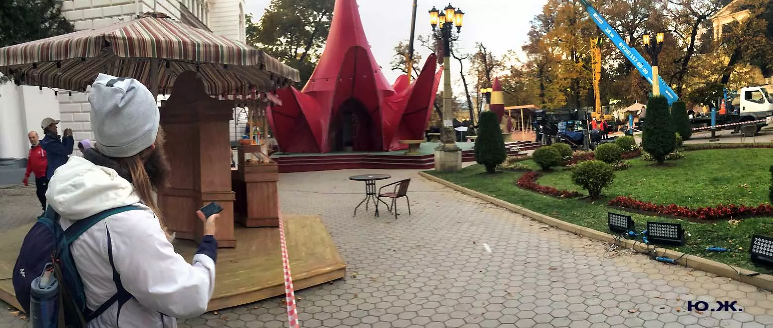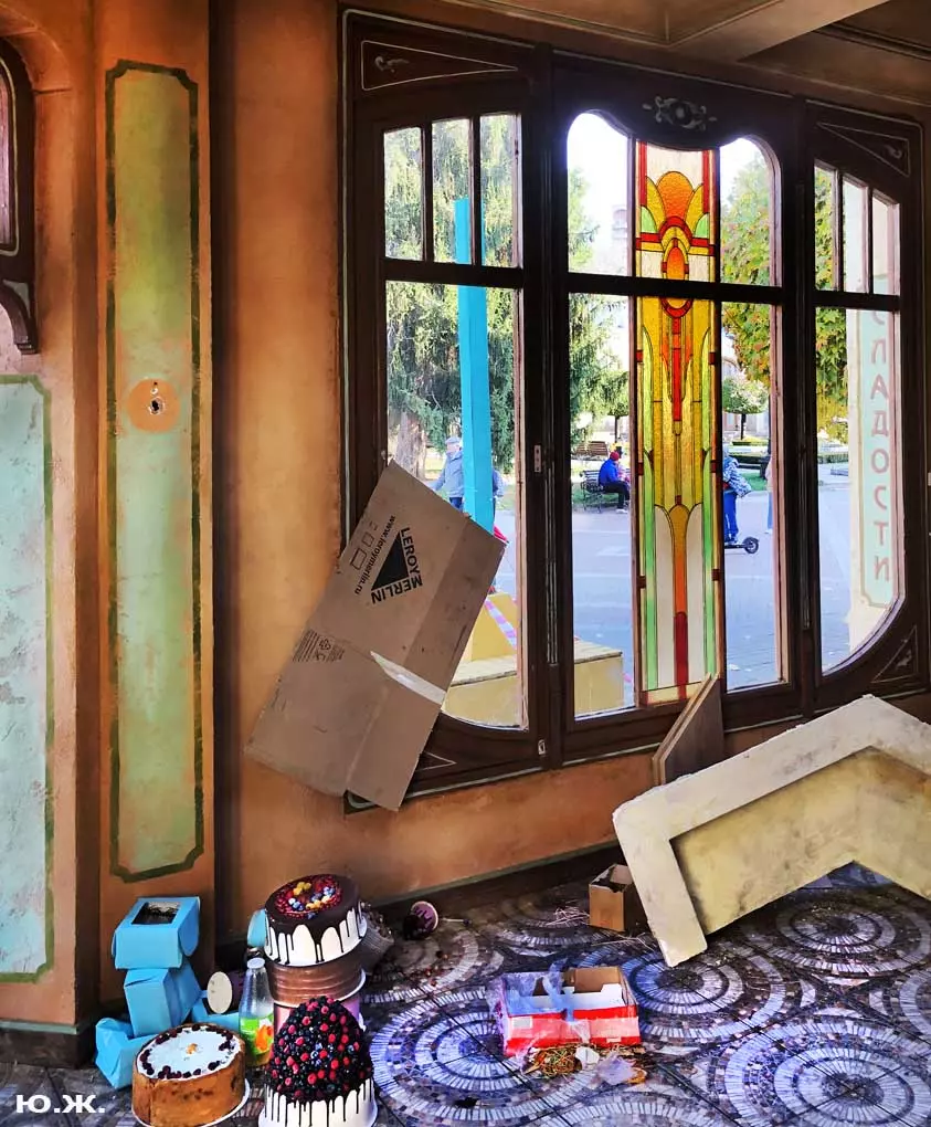 Я же направлялся на Курортный Бульвар, 22, что находился в 30-40 метрах от главной съемочной площадки. Прибывшая из Москвы в начале октября довольно большая техническая киногруппа строила с нуля симпатичное здание кафе «Шоколадница». Строение быстро росло, дизайнеры подкрашивали стекла витражей, тут же вставляя их в рамы в стиле модерн. Это соответствовало стилистике зданий в Кисловодске. На маленьком пространстве мастера вырезали, выпиливали на расставленных здесь же замысловатых машинах деревянные детали, уже в интерьере выстилали пол привезенным роскошным кафелем. (См. фото: на кафеле стоят громадные круглые коробки-муляжи с раскрашенными или искусно разрисованными тортами, которые выглядели лучше настоящих). Самое интересное заключается в том, что художники-дизайнеры придирчиво «старили» это здание. Оно было возведено за три недели, завершено — за два дня до окончания съемок. В народе его прозвали «Дом Чебурашки».