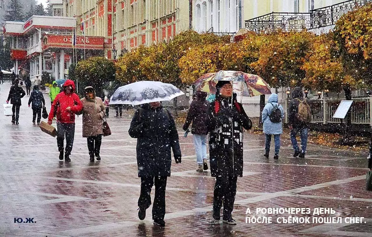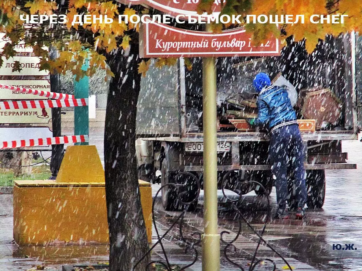 Не могу не упомянуть, что после окончания киносъемок 23 октября и прекрасных дней бабьего лета, ровно через день пошел первый снег, красивый и теплый. Кисловодск подарил замечательный сюрприз для красивых снимков. Я решил перейти на другой жанр съемки, который называется сюрреализмом.