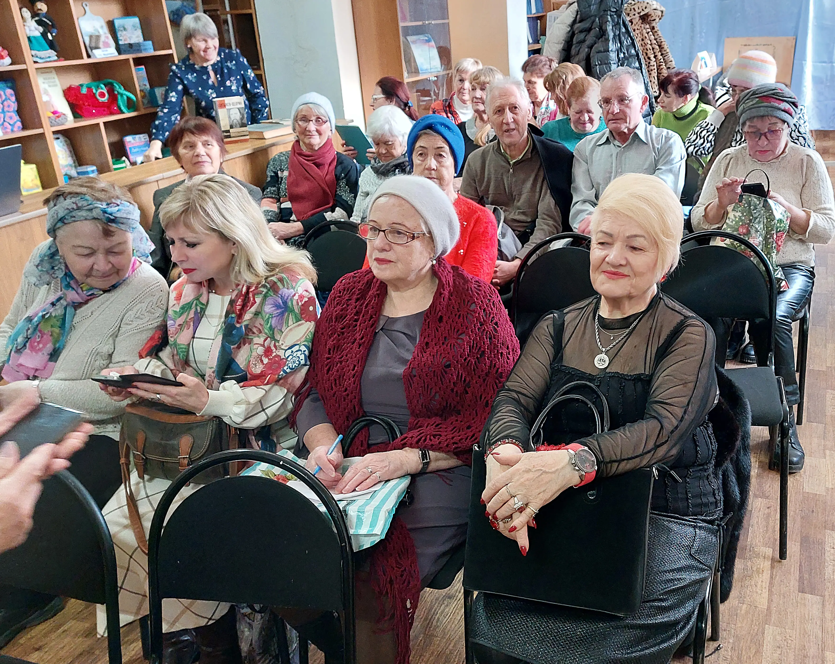 Елена Владимировна Самохина показала слушателям, большинство из которых постоянно ходят на её лекции, книгу Михаила Евграфовича, выпущенную в 1950-м году и подписанную Н. Щедрин.