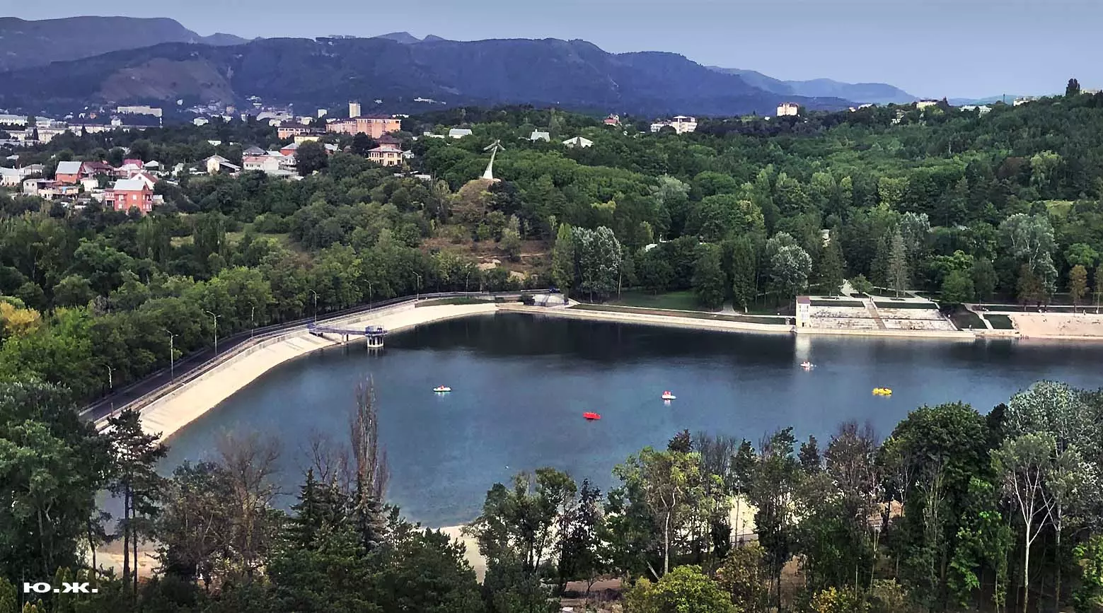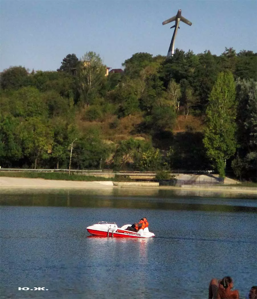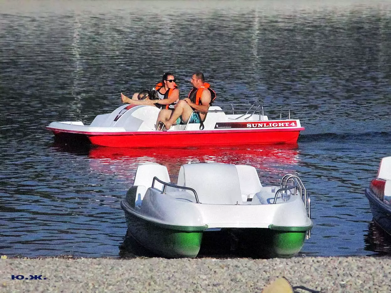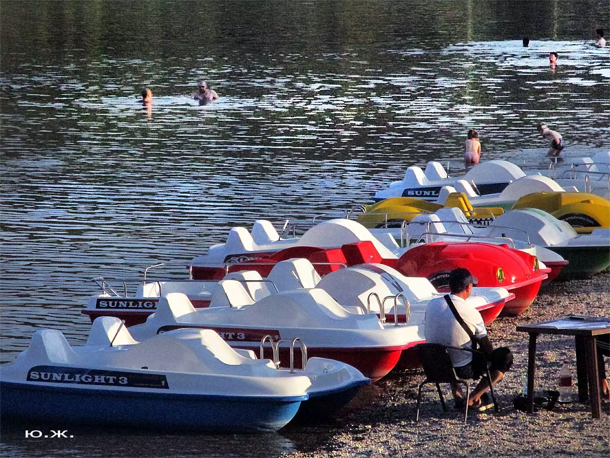 Катамараны придали озеру совершенно новый современный вид, лоск, солидность. Вот что пишет энциклопедия: «Катамараны это водное судно, состоящее из двух, параллельно расположенных корпусов, связанных между собой общей палубой». Посмотрите фотографии, сделанные с озера, с ближайших возвышенностей в округе: на востоке – с памятника «Самолет», с напротив стоящей горы в западной его части. Катамараны смотрятся сверху, словно брошенные в воду жемчужины…