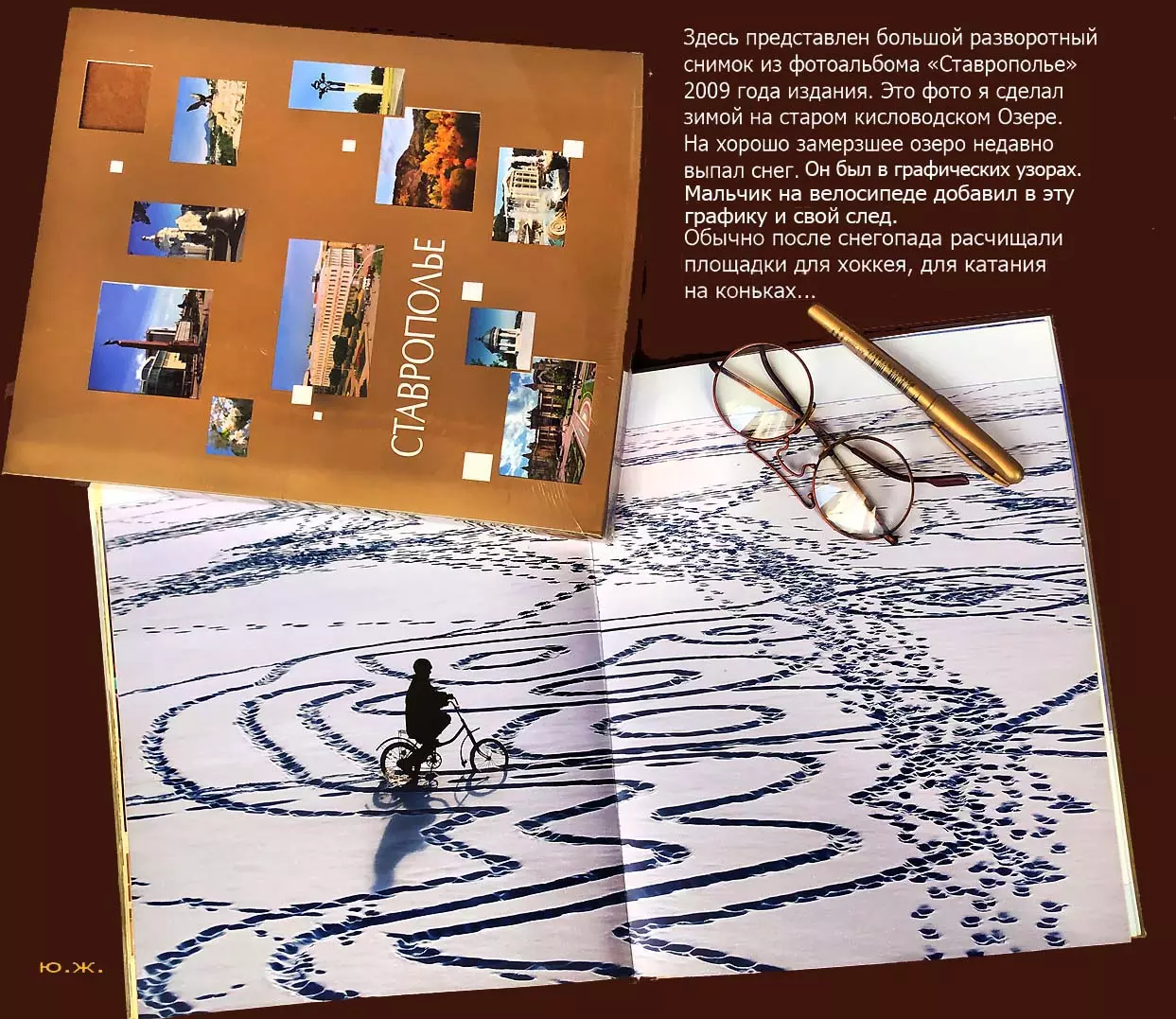 И в заключение. В далекие советские времена, и в девяностые годы прошлого века, и в начале двухтысячных годов нашего века на зиму озеро оставляли с водой. Когда оно замерзало, очищали его от выпадавшего снега до льда, размечали площадки для игры в хоккей, для катания на коньках и для многих других спортивных игр и забав. Никаких ЧП не случалось. В конце всех фото стоит большой разворотный снимок из фотоальбома «Ставрополье» 2009 года издания. Этот снимок я сделал на зимней фотосессии кисловодского озера. На нем мальчик на велосипеде рисует графические узоры по недавно выпавшему снегу (см. это фото в конце галереи). В альбоме представлены многие другие снимки нашего Старого озера.